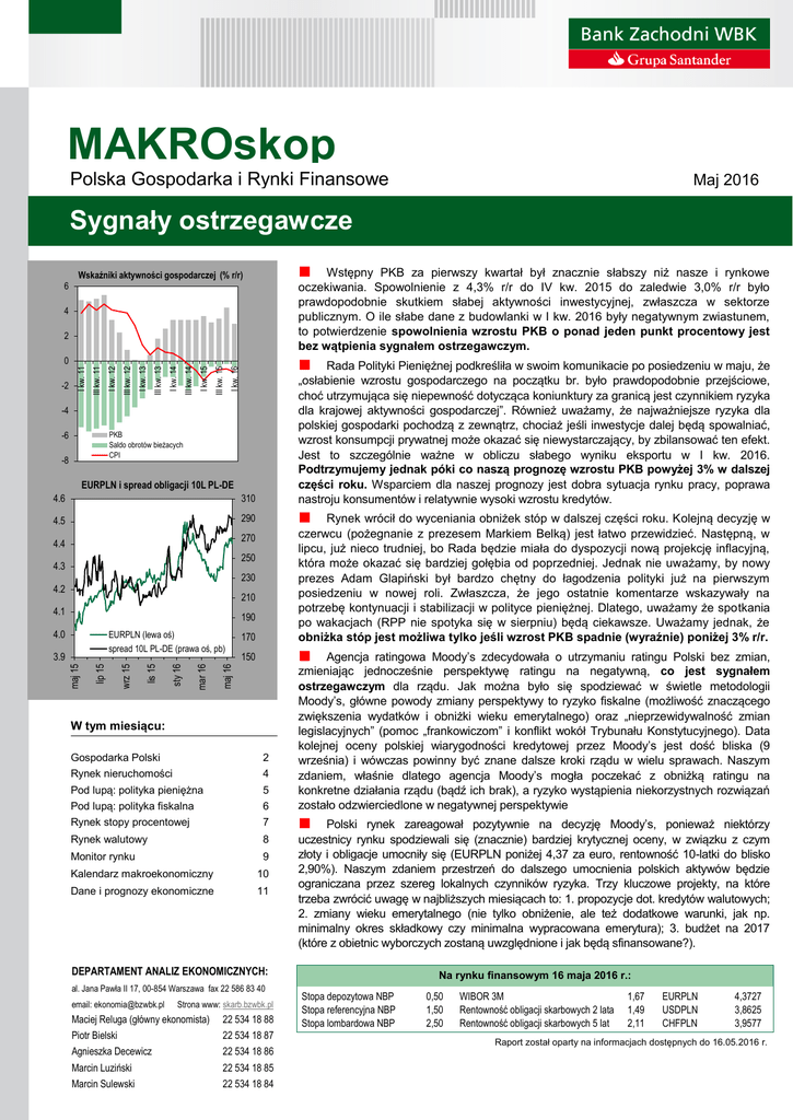 MAKROskop Polska Gospodarka i Rynki Finansowe Maj 2016 Sygnały ostrzegawcze 6 Wstępny PKB za pierwszy kwartał był znacznie słabszy niż nasze i rynkowe oczekiwania. Spowolnienie z 4,3% r/r do IV kw. 2015 do zaledwie 3,0% r/r było prawdopodobnie skutkiem słabej aktywności inwestycyjnej, zwłaszcza w sektorze publicznym. O ile słabe dane z budowlanki w I kw. 2016 były negatywnym zwiastunem, to potwierdzenie spowolnienia wzrostu PKB o ponad jeden punkt procentowy jest bez wątpienia sygnałem ostrzegawczym. Wskaźniki aktywności gospodarczej (% r/r) 4 2 0 I kw. 16 I kw. 15 III kw. 15 I kw. 14 III kw. 14 I kw. 13 III kw. 13 I kw. 12 290 III kw. 12 4.5 I kw. 11 310 -2 III kw. 11 4.6 Rada Polityki Pieniężnej podkreśliła w swoim komunikacie po posiedzeniu w maju, że „osłabienie wzrostu gospodarczego na początku br. było prawdopodobnie przejściowe, choć utrzymująca się niepewność dotycząca koniunktury za granicą jest czynnikiem ryzyka dla krajowej aktywności gospodarczej”. Również uważamy, że najważniejsze ryzyka dla polskiej gospodarki pochodzą z zewnątrz, chociaż jeśli inwestycje dalej będą spowalniać, wzrost konsumpcji prywatnej może okazać się niewystarczający, by zbilansować ten efekt. Jest to szczególnie ważne w obliczu słabego wyniku eksportu w I kw. 2016. Podtrzymujemy jednak póki co naszą prognozę wzrostu PKB powyżej 3% w dalszej części roku. Wsparciem dla naszej prognozy jest dobra sytuacja rynku pracy, poprawa nastroju konsumentów i relatywnie wysoki wzrostu kredytów. -4 -6 PKB Saldo obrotów bieżacych CPI -8 EURPLN i spread obligacji 10L PL-DE 170 Rynek wrócił do wyceniania obniżek stóp w dalszej części roku. Kolejną decyzję w czerwcu (pożegnanie z prezesem Markiem Belką) jest łatwo przewidzieć. Następną, w lipcu, już nieco trudniej, bo Rada będzie miała do dyspozycji nową projekcję inflacyjną, która może okazać się bardziej gołębia od poprzedniej. Jednak nie uważamy, by nowy prezes Adam Glapiński był bardzo chętny do łagodzenia polityki już na pierwszym posiedzeniu w nowej roli. Zwłaszcza, że jego ostatnie komentarze wskazywały na potrzebę kontynuacji i stabilizacji w polityce pieniężnej. Dlatego, uważamy że spotkania po wakacjach (RPP nie spotyka się w sierpniu) będą ciekawsze. Uważamy jednak, że obniżka stóp jest możliwa tylko jeśli wzrost PKB spadnie (wyraźnie) poniżej 3% r/r. 150 270 4.4 250 4.3 230 4.2 210 4.1 190 4.0 EURPLN (lewa oś) spread 10L PL-DE (prawa oś, pb) 7 Rynek walutowy 8 lip 15 maj 15 maj 16 6 Rynek stopy procentowej mar 16 5 Pod lupą: polityka fiskalna sty 16 4 Pod lupą: polityka pieniężna lis 15 2 Rynek nieruchomości wrz 15 Gospodarka Polski Agencja ratingowa Moody’s zdecydowała o utrzymaniu ratingu Polski bez zmian, zmieniając jednocześnie perspektywę ratingu na negatywną, co jest sygnałem ostrzegawczym dla rządu. Jak można było się spodziewać w świetle metodologii Moody’s, główne powody zmiany perspektywy to ryzyko fiskalne (możliwość znaczącego zwiększenia wydatków i obniżki wieku emerytalnego) oraz „nieprzewidywalność zmian legislacyjnych” (pomoc „frankowiczom” i konflikt wokół Trybunału Konstytucyjnego). Data kolejnej oceny polskiej wiarygodności kredytowej przez Moody’s jest dość bliska (9 września) i wówczas powinny być znane dalsze kroki rządu w wielu sprawach. Naszym zdaniem, właśnie dlatego agencja Moody’s mogła poczekać z obniżką ratingu na konkretne działania rządu (bądź ich brak), a ryzyko wystąpienia niekorzystnych rozwiązań zostało odzwierciedlone w negatywnej perspektywie 3.9 W tym miesiącu: Monitor rynku 9 Kalendarz makroekonomiczny 10 Dane i prognozy ekonomiczne 11 Polski rynek zareagował pozytywnie na decyzję Moody’s, ponieważ niektórzy uczestnicy rynku spodziewali się (znacznie) bardziej krytycznej oceny, w związku z czym złoty i obligacje umocniły się (EURPLN poniżej 4,37 za euro, rentowność 10-latki do blisko 2,90%). Naszym zdaniem przestrzeń do dalszego umocnienia polskich aktywów będzie ograniczana przez szereg lokalnych czynników ryzyka. Trzy kluczowe projekty, na które trzeba zwrócić uwagę w najbliższych miesiącach to: 1. propozycje dot. kredytów walutowych; 2. zmiany wieku emerytalnego (nie tylko obniżenie, ale też dodatkowe warunki, jak np. minimalny okres składkowy czy minimalna wypracowana emerytura); 3. budżet na 2017 (które z obietnic wyborczych zostaną uwzględnione i jak będą sfinansowane?). DEPARTAMENT ANALIZ EKONOMICZNYCH: al. Jana Pawła II 17, 00-854 Warszawa fax 22 586 83 40 email: [email protected] Strona www: skarb.bzwbk.pl Maciej Reluga (główny ekonomista) Piotr Bielski Agnieszka Decewicz 22 534 18 88 22 534 18 87 22 534 18 86 Marcin Luziński Marcin Sulewski 22 534 18 85 22 534 18 84 Na rynku finansowym 16 maja 2016 r.: Stopa depozytowa NBP Stopa referencyjna NBP Stopa lombardowa NBP 0,50 1,50 2,50 WIBOR 3M Rentowność obligacji skarbowych 2 lata Rentowność obligacji skarbowych 5 lat 1,67 1,49 2,11 EURPLN USDPLN CHFPLN 4,3727 3,8625 3,9577 Raport został oparty na informacjach dostępnych do 16.05.2016 r. Gospodarka Polski % r/r 8 Spowolnienie wzrostu PKB w I kw. 2016 Wzrost PKB i jego wybranych komponentów I kw.16 I kw.15 III kw.15 I kw.14 III kw.14 I kw.13 III kw.13 I kw.12 III kw.10 III kw.12 0 I kw.11 0 III kw.11 5 I kw.10 2 I kw.09 10 III kw.09 4 I kw.08 15 III kw.08 6 -2 Wzrost PKB wyniósł 3,0% r/r w I kw. 2016, wyraźnie mniej od oczekiwań (3,5% r/r). W ujęciu odsezonowanym zanotowano spadek o 0,1% kw/kw. i był to najsłabszy odczyt od końca 2012 r. O ile ujemny wynik kw/kw wynika naszym zdaniem w znacznej mierze z wysokiej bazy IV kw. 2015 (1,3% kw/kw), to jednak odczyt był bardzo rozczarowujący. Spodziewaliśmy się spowolnienia wzrostu, m. in. pod wpływem niższych inwestycji publicznych, które złapały zadyszkę ze względu na okres przejściowy między dwoma perspektywami unijnym
