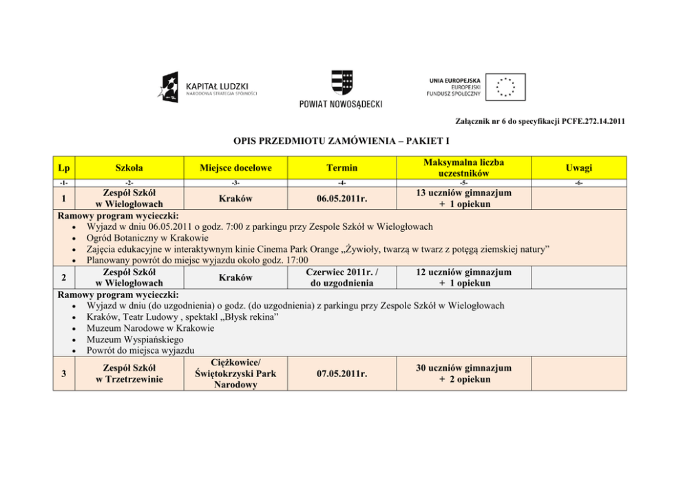 Załącznik nr 6 do specyfikacji PCFE.272.14.2011 OPIS PRZEDMIOTU ZAMÓWIENIA – PAKIET I Lp Szkoła Miejsce docelowe Termin Maksymalna liczba uczestników Uwagi -1- -2- -3- -4- -5- -6- Zespół Szkół 13 uczniów gimnazjum 1 Kraków 06.05.2011r. w Wielogłowach + 1 opiekun Ramowy program wycieczki: Wyjazd w dniu 06.05.2011 o godz. 7:00 z parkingu przy Zespole Szkół w Wielogłowach Ogród Botaniczny w Krakowie Zajęcia edukacyjne w interaktywnym kinie Cinema Park Orange „Żywioły, twarzą w twarz z potęgą ziemskiej natury” Planowany powrót do miejsc wyjazdu około godz. 17:00 Zespół Szkół Czerwiec 2011r. / 12 uczniów gimnazjum 2 Kraków w Wielogłowach do uzgodnienia + 1 opiekun Ramowy program wycieczki: Wyjazd w dniu (do uzgodnienia) o godz. (do uzgodnienia) z parkingu przy Zespole Szkół w Wielogłowach Kraków, Teatr Ludowy , spektakl „Błysk rekina” Muzeum Narodowe w Krakowie Muzeum Wyspiańskiego Powrót do miejsca wyjazdu Ciężkowice/ Zespół Szkół 30 uczniów gimnazjum 3 Świętokrzyski Park 07.05.2011r. w Trzetrzewinie + 2 opiekun Narodowy Ramowy program wycieczki: Wyjazd w dniu 07.05.2011 około godz.06:00 z parkingu przy Zespole Szkół w Trzetrzewinie Ciężkowice- „Diabelski Kamień”- pomnik przyrody Jaskinia Raj Świętokrzyski Park Narodowy: o muzeum przyrodnicze o klasztor Bernardynów o Gołoborza o Bartków k. Samsonowa- dąb Bartek- pomnik przyrody powrót do miejsca wyjazdu Zespół Szkół maj/czerwiec 29 uczniów gimnazjum Niewymagany pilot / 4 Kraków w Trzetrzewinie do uzgodnienia + 2 opiekunów przewodnik Ramowy program wycieczki: Wyjazd z parkingu przy Zespole Szkół w Trzetrzewinie Kraków, Teatr Słowackiego, sztuka „Chory z urojenia” Powrót do miejsca wyjazdu Zespół Szkół Chorzów, Katowice, 30 uczniów gimnazjum Wycieczka 5 24-25.05.2011r. w Świniarsku Zabrze, Tychy + 2 opiekunów dwudniowa Ramowy program wycieczki: I dzień Wyjazd w dniu 24.05.2011 o godz. 6:00 z parkingu przy Zespole Szkół w Świniarsku Planetarium Śląskie- astronomia w geografii dwulekcyjne zajęcia dydaktyczne Zwiedzanie zabytkowej Kopalni Węgla Kamiennego GUIDO w Zabrzu Spacer po centrum Katowic II dzień zwiedzanie montowni Fiat Auto Poland w Tychach przejazd do Czernej koło Krzeszowic zwiedzanie obiektu Klasztoru męskiego karmelitów bosych w Czernej- z cudownym wizerunkiem Matki Bożej Śnieżnej zwiedzanie ruin Zamku Tenczyn w Rudnie k. Krzeszowic przyjazd do Świniarska ok. godz. 19:00 Zespół Szkół 30 uczniów gimnazjum Niewymagany pilot / 6 Nowy Sącz 04.06.2011r. w Świniarsku + 2 opiekunów przewodnik Ramowy program wycieczki: Wyjazd w dniu 04.06.2011 o godz. (do uzgodnienia) z parkingu przy Zespole Szkół w Świniarsku Teatr Robotniczy w Nowym Sączu- sztuka teatralna „Książę i żebrak” Powrót do miejsca wyjazdu Zespół Szkół 9 uczniów gimnazjum 7 Myślenice, Węglówka 09.04.2011r. w Piątkowej + 1 opiekun Ramowy program wycieczki: Wyjazd w dniu 09.04.2011 o godz. 8:30 z parkingu przy Zespole Szkół w Piątkowej Przejazd autokarem: Piątkowa- Myślenice- Węglówka- Piątkowa Przejazd wyciągiem kanapowym na Górę Chełm Przejście piesze na trasie: Chełm- schronisko PTTK na Kudłaczach- Lubomir (zwiedzenie obserwatorium astronomicznego wraz z wysłuchaniem prelekcji)- Węglówka Powrót do miejsca wyjazdu Zespół Szkół Czarnorzeki, 9 uczniów gimnazjum 8 07.05.2011r. w Piątkowej Odrzykoń + 1 opiekun Ramowy program wycieczki: Wyjazd w dniu 07.05.2011 o godz. 8:30 z parkingu przy Zespole Szkół w Piątkowej Przejazd autokarem: Piątkowa- Czarnorzeki- Odrzykoń- Piątkowa Wstęp do ruin zamku Kamieniec w Odrzykoniu Przejście piesze ścieżką przyrodniczą na trasie: rezerwat Prządki- Odrzykoń oraz dookoła zamku Powrót do miejsca wyjazdu Zespół Szkół Ojcowski Park 27 uczniów gimnazjum Wycieczka 9 20-21.05.2011r. w Piątkowej Narodowy + 2 opiekunów dwudniowa Dzień I Wyjazd w dniu 20.05.2011 o godz. 12:00 z parkingu przy Zespole Szkół w Piątkowej Zajęcia ekologiczne „Zjawiska krasowe” Dzień II Wycieczka tematyczna „Nie tylko Ojców” Powrót do miejsca wyjazdu Zespół Szkół 30 uczniów gimnazjum 10 Góry Świętokrzyskie 11.06.2011r. w Paszynie + 3 opiekunów Ramowy program wycieczki: Wyjazd w dniu 11.06.2011 o godz. 6:00 z parkingu przy Zespole Szkół w Paszynie Jaskinia Raj, zamek w Chęcinach, Oblęgorek, Klasztor Misjonarzy Oblatów Maryi Niepokalanej na Św. Krzyżu Dymarki- Nowa Słupia; Łysica- Zamek Krzyżtopór ; Świętokrzyski Park Narodowy, Park Jurajski w Bałtowie Powrót do miejsca wyjazdu Zespół Szkół Kielce / 26 uczniów gimnazjum 11 07-08.05.2011r. w Chomranicach Góry Świętokrzyskie + 3 opiekunów Ramowy program wycieczki: Wyjazd w dniu 07.05.2011 o godz. 6:00 z parkingu przy Zespole Szkół w Chomranicach Zamek w Chęcinach, Jaskinia Raj Kielce- Rezerwat Kadzielnia Bartków- Dąb Bartek Św. Krzyż – Gołoborza, Muzeum Przyrodniczo- Leśne Świętokrzyskiego Parku Narodowego wyjście na Łysicę 612 m Bałtowski Park Narodowy, rekonstrukcje dinozaurów, przejazd Dinobusem do Zwierzyńca Dolnego i Górnego Powrót do miejsca wyjazdu 08.05.2011 Zespół Szkół Kielce / 24 uczniów gimnazjum 12 14-15.05.2011r. w Chomranicach Góry Świętokrzyskie + 3 opiekunów Ramowy program wycieczki: Wyjazd w dniu 14.05.2011 o godz. 6:00 z parkingu przy Zespole Szkół w Chomranicach Zamek w Chęcinach, Jaskinia Raj, Kielce- Rezerwat Kadzielnia Bartków- Dąb Bartek Św. Krzyż – Gołoborza, Muzeum Przyrodniczo- Leśne Świętokrzyskiego Parku Narodowego wyjście na Łysicę 612 m Bałtowski Park Narodowy, rekonstrukcje dinozaurów, przejazd Dinobusem do Zwierzyńca Dolnego i Górnego Powrót do miejsca wyjazdu 15.05.2011 Zespół Szkół Ojcowski Park sobota w maju 2011r. / 14 uczniów gimnazjum 13 w Chełmcu Narodowy do uzgodnienia + 1 opiekun Wycieczka dwudniowa Wycieczka dwudniowa Ramowy program wycieczki: Wyjazd w dniu (do uzgodnienia) o godz. 7:00 z parkingu p