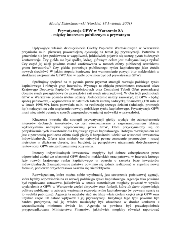 Maciej Dzierżanowski (Parkiet, 18 kwietnia 2001) Prywatyzacja GPW w Warszawie SA - między interesem publicznym a prywatnym Upływające właśnie dziesięciolecie Giełdy Papierów Wartościowych w Warszawie przyniosło m.in. pierwszą poważniejszą dyskusję na temat jej prywatyzacji. Potrzeba ta generalnie nie jest poddawana w wątpliwość, jakkolwiek pojawia się szereg pytań budzących kontrowersje. Czy giełda ma być spółką, której głównym celem jest maksymalizacja zysku? Czy część jej akcji powinna zostać zaoferowana w ramach oferty publicznej szerokiemu gronu inwestorów? Czy giełda potrzebuje publicznego rynku kapitałowego jako źródła nowych środków? W jakim stopniu konieczne jest wzmocnienie pozycji biur maklerskich w strukturze akcjonariatu GPW? Jaki w ogóle powinien być cel prywatyzacji GPW? Spróbujmy spojrzeć na te pytania przez pryzmat strategii rozwoju polskiego rynku kapitałowego i różnych grup interesów. Wymaga to objęcia przedmiotem rozważań także Krajowego Depozytu Papierów Wartościowych oraz Centralnej Tabeli Ofert prowadzącej obecnie rynek pozagiełdowy (w przyszłości zaś rynek nieurzędowy). W obu tych podmiotach GPW w Warszawie posiada istotne udziały. Jednocześnie należy zauważyć, że GPW - będąc spółką państwową - wypracowała w ostatnich latach istotną nadwyżkę finansową (120 mln zł w latach 1998-99), która pozwalała m.in. na realizację szeregu działań (edukacja, promocja itp.) mających na celu wspieranie rozwoju polskiego rynku kapitałowego. Prywatyzacja GPW musi więc nieść pytanie o sposób zagospodarowania tej nadwyżki w przyszłości. Kluczową kwestią dla strategii prywatyzacji giełdy wydaje się zabezpieczenie interesów drobnych inwestorów, co jest równoznaczne z zagwarantowaniem takiego wykorzystania nadwyżki wypracowanej przez GPW, które przyczyniałoby się do pozyskiwania tych inwestorów dla krajowego rynku kapitałowego. Dobrym rozwiązaniem nie jest z pewnością publiczna oferta akcji giełdy i bezpośredni udział we własności inwestorów indywidualnych. Oferta taka miałaby co najwyżej pewne znaczenie promocyjne - raczej nieistotne w dłuższym okresie, tym bardziej, że perspektywa utrzymania dotychczasowej rentowności GPW nie jest bynajmniej oczywista. Interesy indywidualnych inwestorów mogłyby być dobrze zabezpieczane przez odpowiedni udział we własności GPW domów maklerskich oraz państwa, w interesie którego leży rozwój krajowego rynku kapitałowego w oparciu o szeroką bazę inwestorów indywidualnych. Zaangażowanie państwa powinno się jednak realizować w zupełnie nowej formule, ponieważ dotychczasowa okazała się nieefektywna. Rozwiązaniem, które można sobie wyobrazić, jest stworzenie państwowej agencji, która byłaby odpowiedzialna za rozwój polskiego rynku kapitałowego. Agencja taka powinna być regulowana ustawowo, jakkolwiek w sensie materialnym mogłaby powstać w wyniku wydzielenia z GPW w Warszawie części aktywów oraz funkcji, które de facto odpowiadają polityce publicznej w zakresie wspierania rozwoju rynku kapitałowego (w pewnym sensie są to wydatki publiczne). Agencja ta mogłaby stać się także właścicielem części akcji GPW oraz uzyskać część lub całość wpływów z jej prywatyzacji. Instytucja tego typu powinna być bardzo przejrzysta, zaś jej władze musiałyby być obsadzane w drodze konkursu z częstotliwością minimum dwóch lat. Agencja ta powinna być prawdopodobnie przyporządkowana Ministerstwu Finansów, jakkolwiek mogłaby również raportować bezpośrednio przed Parlamentem. Propozycja przyporządkowania Ministrowi Finansów podyktowana jest koniecznością wykreowania wyraźnie wskazanego ośrodka władzy wykonawczej odpowiedzialnego za rozwój polskiego rynku kapitałowego. Brak takiego ośrodka był dotychczas często wskazywanym ograniczeniem. Dotychczasowe doświadczenia GPW wskazują, że krajowy rynek urzędowy powinien być zdolny do zupełnie komercyjnego funkcjonowania. Z drugiej strony, doświadczenia CeTO pokazują, że inicjatywa tworzenia krajowego rynku nieurzędowego może wymagać większego zaangażowania czynnika publicznego. Oznacza to, że przy zaproponowanym wcześniej wydzieleniu agencji rządowej zaangażowanie czynnika publicznego we własność GPW mogłoby być stosunkowo nieduże. Tymczasem CeTO mogłoby funkcjonować przy znacznie większym zaangażowaniu czynnika publicznego, ponieważ rozwój rynku nieurzędowego - z pewnością pożądany z punktu widzenia polityki gospodarczej - będzie zapewne wymagał wsparcia (zapewnienie dużej przejrzystości informacyjnej dla inwestorów, szybkiego i taniego dostępu do rynku, pokrycia analitycznego notowanych i potencjalnych spółek itp.). Z tego względu proponowana wcześniej agencja państwowa mogłaby przejąć część lub wszystkie akcje CeTO posiadane obecnie przez GPW. Należy podkreślić, że ewentualne bezpośrednie zaangażowanie publiczne we własność docelowo komercyjnego podmiotu powinno podlegać wnikliwej ewaluacji i w określonym momencie zostać wycofane. Moment ten powinien być wyraźnie zarysowany. Zaangażowanie własnościowe państwa powinno także wiązać się z relatywnie mniejszą kontrolą - co oznacza przesunięcie punktu ciężkości w tym względzie w kierunku operatorów gospodarczych.