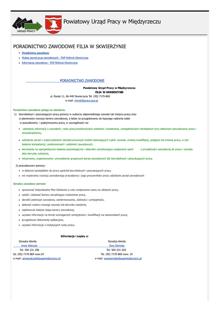 Powiatowy Urząd Pracy w Międzyrzeczu PORADNICTWO ZAWODOWE FILIA W SKWIERZYNIE Poradnictwo zawodowe Wykaz porad grup zawodowych - PUP Referat Skwierzyna Informacja zawodowa - PUP Referat Skwierzyna PORADNICTWO ZAWODOWE Powiatowy Urząd Pracy w Międzyrzeczu FILIA W SKWIERZYNIE ul. Rynek 11, 66-440 Skwierzyna Tel. (95) 7170-869 e-mail: [email protected] Poradnictwo zawodowe polega na udzielaniu: 1) bezrobotnym i poszukującym pracy pomocy w wyborze odpowiedniego zawodo lub miejsca pracy oraz w planowaniu rozwoju kariery zawodowej, a także na przygotowaniu do lepszego radzenia sobie w poszukiwaniu i podejmowaniu pracy, w szczególności na: udzielaniu informacji o zawodach, rynku pracy,możliwościach szkolenia i kształcenia, umiejętnościach niezbędnych przy aktywnym poszukiwaniu pracy i amozatrudnieniu, udzielanie porad z wykorzystaniem standaryzowanych metod ułatwiających wybór zawodu, zmianę kwalifikacji, podjęcie lub zmianę pracy, w tym badaniu kompetencji, zainteresowań i uzdolnień zawodowych, kierowanie na specjalistyczne badania psychologiczne i lekarskie umożliwiające wydawanie opinii albo kierunku szkolenia, o przydatności zawodowej do pracy i zawodu inicjowaniu, organizowaniu i prowadzeniu grupowych porad zawodowych dla bezrobotnych i poszukujących pracy, 2) pracodawcom pomocy: w doborze kandydatów do pracy spośród bezrobotnych i poszukujących pracy, we wspieraniu rozwoju zawodowego pracodawcy i jego pracowników przez udzielanie porad zawodowych Doradca zawodowy pomoże: opracować Indywidualny Plan Działania w celu zwiększenia szans na zdobycie pracy, ustalić i pokonać bariery utrudniające znalezienie pracy, określić potencjał zawodowy, zainteresowania, zdolności i umiejętności, dokonać wyboru nowego zawodu lub kierunku szkolenia, zaplanować kolejne etapy kariery zawodowej, uzyskać informacje na temat wymaganych umiejętności i kwalifikacji na stanowiskach pracy, przygotować dokumenty aplikacyjne, uzyskać informacje o instytucjach rynku pracy. Informacje i zapisy u: Doradca klienta Anna Walczak Tel: 504 231 298 tel. (95) 7170-869 wew.24 e-mail: [email protected] Doradca klienta Ewa Ziemska Tel: 504 231-320 Tel. (95) 7170-869 wew. 24 e-mail: [email protected] Wykaz grupowych porad zawodowych - PUP FILIA W SKWIERZYNIE Powiatowy Urząd Pracy w Międzyrzeczu FILIA W SKWIERZYNIE ul. Rynek 11, 66-440 Skwierzyna Tel. (95) 7170-869 e-mail: [email protected] Wykaz grupowych porad zawodowych do realizacji w 2016 roku Wszystkie porady zaczynają się o godz 09.00 Powiatowy Urząd Pracy FILIA W SKWIERZYNIE zastrzega sobie prawo do zmiany terminów. Termin grupowych porad zawodowych Tematyka 23.02.2017 26.04.2017 28.06.2017 30.08.2017 25.10.2017 20.12.2017 CZAS DO PRACY, CZYLI JAK WYBRAĆ ZAWÓD I ZAPLANOWAĆ SWÓJ ROZWÓJ ZAWODOWY SZUKAM PRACY :JAK I GDZIE ? JAK PORADZIĆ SOBIE Z BEZROBOCIEM CZAS DO PRACY, CZYLI JAK WYBRAĆ ZAWÓD I ZAPLANOWAĆ SWÓJ ROZWÓJ ZAWODOWY SZUKAM PRACY :JAK I GDZIE ? JAK PORADZIĆ SOBIE Z BEZROBOCIEM Termin Ilość osób Ilość godzin przyjęcia zgłoszeń 23.02.2017 8 3 26.04.2017 8 3 28.06.2017 8 3 30.08.2017 8 3 25.10.2017 8 3 20.12.2017 10 3 Informacje i zapisy u: Doradca Klienta Anna Walczak Tel: 504 231 298 Tel. (95) 7170-869 wew.24 e-mail: [email protected] Doradca Klienta Ewa Ziemska tel. 504-231-320 Tel. (95) 7170-869 wew. 24 e-mail: [email protected] Informacje i zapisy u: Doradca klienta Anna Walczak Tel: 504 231 298 tel. (95)7170-869 wew.24 e-mail: [email protected] Doradca klienta Ewa Ziemska tel. 504-231-320 Tel. (95) 7170 - 869 wew. 24 e-mail: [email protected] INFORMACJE odbywać się będą w siedzibie Urzędu Pracy w Skwierzynie. INDYWIDUALNA INFORMACJA ZAWODOWA Jeżeli chcą Państwo: Zapoznać się ze wzorami dokumentów aplikacyjnych napisać i wydrukować listy swoje dokumenty aplikacyjne skorzystać z ulotek informacyjnych i zawodowych oraz z poradników i informatorów zawierających wiadomości pomocne przy poszukiwaniu pracy Szukasz informacji nt. interesującego Cię zawodu np. Autoprezentacja to zapraszamy do Urzędu Pracy w Skwierzynie Asertywność Zakładam własna firmę Czy nadaję się na przedsiębiorce Mowa ciała, czyli komunikacja niewerbalna Techniki negocjacji Planowanie kariery Przygotowanie się do rozmowy kwalifikacyjnej Rozmowa kwalifikacyjna Gdzie i jak szukać pracy Zapraszamy Powiatowy Urząd Pracy w Międzyrzeczu FILIA W SKWIERZYNIE ul. Rynek 11 codziennie w godz. od 08.00 do 14.00 Informacje i zapisy u: Doradca klienta Anna Walczak Tel.: 504 231 298 tel. (95) 7170-869 wew. 24 e-mail: [email protected] Doradca klienta Ewa Ziemska tel. 504-231-320 Tel. (95) 7170 - 869 w. 24 e-mail: [email protected]