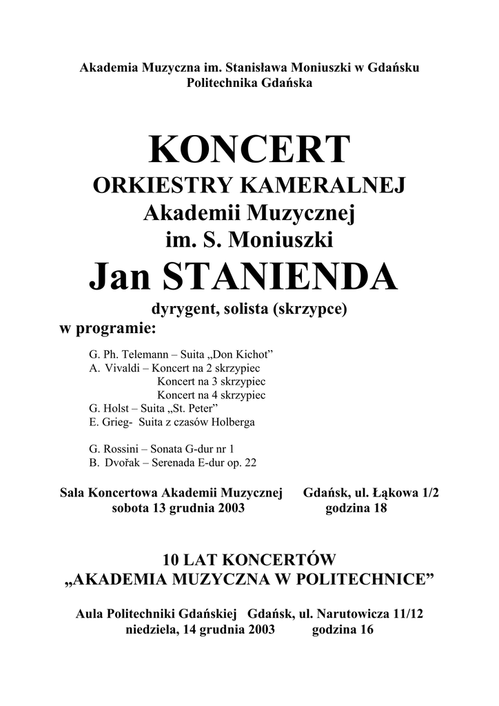 Akademia Muzyczna im. Stanisława Moniuszki w Gdańsku Politechnika Gdańska KONCERT ORKIESTRY KAMERALNEJ Akademii Muzycznej im. S. Moniuszki Jan STANIENDA dyrygent, solista (skrzypce) w programie: G. Ph. Telemann – Suita „Don Kichot” A. Vivaldi – Koncert na 2 skrzypiec Koncert na 3 skrzypiec Koncert na 4 skrzypiec G. Holst – Suita „St. Peter” E. Grieg- Suita z czasów Holberga G. Rossini – Sonata G-dur nr 1 B. Dvořak – Serenada E-dur op. 22 Sala Koncertowa Akademii Muzycznej sobota 13 grudnia 2003 Gdańsk, ul. Łąkowa 1/2 godzina 18 10 LAT KONCERTÓW „AKADEMIA MUZYCZNA W POLITECHNICE” Aula Politechniki Gdańskiej Gdańsk, ul. Narutowicza 11/12 niedziela, 14 grudnia 2003 godzina 16
