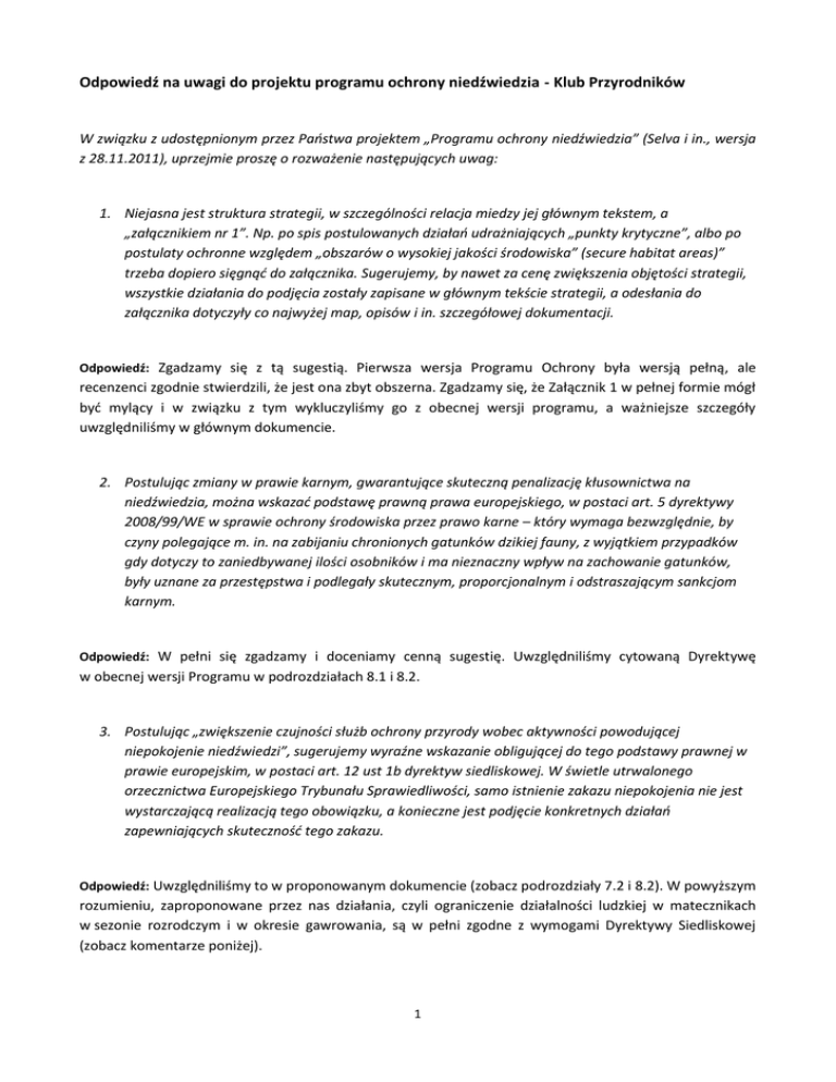 Odpowiedź na uwagi do projektu programu ochrony niedźwiedzia - Klub Przyrodników W związku z udostępnionym przez Państwa projektem „Programu ochrony niedźwiedzia” (Selva i in., wersja z 28.11.2011), uprzejmie proszę o rozważenie następujących uwag: 1. Niejasna jest struktura strategii, w szczególności relacja miedzy jej głównym tekstem, a „załącznikiem nr 1”. Np. po spis postulowanych działań udrażniających „punkty krytyczne”, albo po postulaty ochronne względem „obszarów o wysokiej jakości środowiska” (secure habitat areas)” trzeba dopiero sięgnąć do załącznika. Sugerujemy, by nawet za cenę zwiększenia objętości strategii, wszystkie działania do podjęcia zostały zapisane w głównym tekście strategii, a odesłania do załącznika dotyczyły co najwyżej map, opisów i in. szczegółowej dokumentacji. Odpowiedź: Zgadzamy się z tą sugestią. Pierwsza wersja Programu Ochrony była wersją pełną, ale recenzenci zgodnie stwierdzili, że jest ona zbyt obszerna. Zgadzamy się, że Załącznik 1 w pełnej formie mógł być mylący i w związku z tym wykluczyliśmy go z obecnej wersji programu, a ważniejsze szczegóły uwzględniliśmy w głównym dokumencie. 2. Postulując zmiany w prawie karnym, gwarantujące skuteczną penalizację kłusownictwa na niedźwiedzia, można wskazać podstawę prawną prawa europejskiego, w postaci art. 5 dyrektywy 2008/99/WE w sprawie ochrony środowiska przez prawo karne – który wymaga bezwzględnie, by czyny polegające m. in. na zabijaniu chronionych gatunków dzikiej fauny, z wyjątkiem przypadków gdy dotyczy to zaniedbywanej ilości osobników i ma nieznaczny wpływ na zachowanie gatunków, były uznane za przestępstwa i podlegały skutecznym, proporcjonalnym i odstraszającym sankcjom karnym. Odpowiedź: W pełni się zgadzamy i doceniamy cenną sugestię. Uwzględniliśmy cytowaną Dyrektywę w obecnej wersji Programu w podrozdziałach 8.1 i 8.2. 3. Postulując „zwiększenie czujności służb ochrony przyrody wobec aktywności powodującej niepokojenie niedźwiedzi”, sugerujemy wyraźne wskazanie obligującej do tego podstawy prawnej w prawie europejskim, w postaci art. 12 ust 1b dyrektyw siedliskowej. W świetle utrwalonego orzecznictwa Europejskiego Trybunału Sprawiedliwości, samo istnienie zakazu niepokojenia nie jest wystarczającą realizacją tego obowiązku, a konieczne jest podjęcie konkretnych działań zapewniających skuteczność tego zakazu. Odpowiedź: Uwzględniliśmy to w proponowanym dokumencie (zobacz podrozdziały 7.2 i 8.2). W powyższym rozumieniu, zaproponowane przez nas działania, czyli ograniczenie działalności ludzkiej w matecznikach w sezonie rozrodczym i w okresie gawrowania, są w pełni zgodne z wymogami Dyrektywy Siedliskowej (zobacz komentarze poniżej). 1 4. Zestaw postulatów dotyczących planowania przestrzennego, infrastruktury drogowej, infrastruktury narciarskiej i turystycznej, potrzeby istnienia niepofragmentowanych (także drogami leśnymi!) kompleksów leśnych powinien stanowić obligatoryjne wytyczne do ocen oddziaływania na środowisko (zarówno ocen oddziaływania przedsięwzięć jak i strategicznych ocen oddziaływania planów i programów). Sugerujemy: a) Przygotowanie, na podstawie w/w rozdziałów strategii, wytycznych do uwzględniania potrzeb ochrony niedźwiedzia w procedurach administracyjnych, w tym przy stosowaniu art. 96 ustawy o ocenach oddziaływania na środowisko, przy rozstrzyganiu o potrzebie / braku potrzeby oceny, w przeprowadzanych ocenach. Wytyczne takie powinny być przekazane do RDOS i urzędów gmin na obszarze występowania niedźwiedzia. b) Zwrócenie szczególnej uwagi na częstą niestety praktykę rozstrzygania, że pojedyncza zabudowa mieszkaniowa nie wymaga oceny oddziaływania na obszar Natura 2000. Zwrócenie uwagi gminom i RDOŚiom, że w obszarach występowania niedźwiedzia, oddziaływanie pojedynczej rozproszonej zabudowy na przedmiot ochrony może być znacząco negatywne. c) Zwrócenie szczególnej uwagi na inwestycje w zakresie budowy, rozbudowy i remontów dróg leśnych (pod nazwą remontów często przeprowadzana jest rozbudowa), w tym na fakt, że takie inwestycje również mogą wymagać oceny oddziaływania na środowisko lub/i na obszar Natura 2000. Odpowiedź: W pełni zgadzamy się z powyższymi komentarzami i wymienione aspekty były uwzględnione w dokumencie. W wersji poprawionej jaśniej podkreśliliśmy obowiązek uwzględniania potrzeb ochronnych gatunku w strategiach planowania przestrzennego, a także ocenach wpływu na środowisko (podrozdziały 7.1. 7.2, 8 i 9). Obecnie uwzględniamy także (podrozdział 7.1), że wytyczne do uwzględniania potrzeb ochrony niedźwiedzia w procedurach administracyjnych powinny być wypracowane przez administrację ochrony środowiska (GDOS), i że takie inwestycje, zwłaszcza na obszarach rozrodu niedźwiedzia, powinny wymagać oceny wpływu na środowisko. 5. W naszej ocenie, już w obecnym stanie prawnym nadleśniczy może i powinien obejmować zakazem wstępu do lasu obszary wokół miejsca gawrowania niedźwiedzia, wykonując art. 26 ust 2 pkt 3 ustawy o lasach (zakaz wstępu do „ostoi zwierząt”). Brzmienie tego przepisu nie wskazuje na zawężenie go do zwierząt łownych, ani też nie wskazuje na zawężenie tego przepisu do stref ochrony wyznaczonych na podstawie przepisów o ochrony przyrody. W tej sprawie nie są więc konieczne zmiany legislacyjne, a raczej wypracowanie i wdrożenie pewnej praktyki stosowania prawa już istniejącego. W praktyce, uważamy że zakaz wstępu na podstawie art. 26 ustawy o lasach powinien być stosowany dość szeroko, zawsze gdy istnieje podwyższone niebezpieczeństwo niepokojenia niedźwiedzi; także wobec miejsc podejrzewanego tylko gawrowania. Zwracam też uwagę, że przepis art. 26 ustawy o lasach mógłby zostać wykorzystany również do ochrony przed presją antropogeniczna (w tym np. zbi