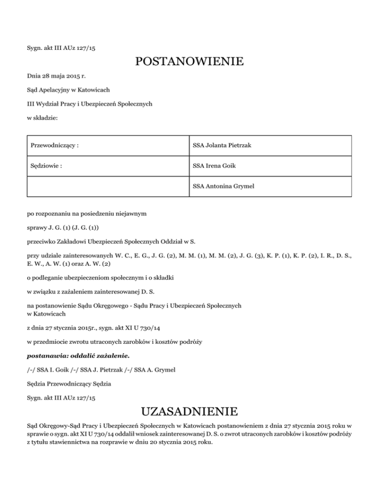 Sygn. akt III AUz 127/15 POSTANOWIENIE Dnia 28 maja 2015 r. Sąd Apelacyjny w Katowicach III Wydział Pracy i Ubezpieczeń Społecznych w składzie: Przewodniczący : SSA Jolanta Pietrzak Sędziowie : SSA Irena Goik SSA Antonina Grymel po rozpoznaniu na posiedzeniu niejawnym sprawy J. G. (1) (J. G. (1)) przeciwko Zakładowi Ubezpieczeń Społecznych Oddział w S. przy udziale zainteresowanych W. C., E. G., J. G. (2), M. M. (1), M. M. (2), J. G. (3), K. P. (1), K. P. (2), I. R., D. S., E. W., A. W. (1) oraz A. W. (2) o podleganie ubezpieczeniom społecznym i o składki w związku z zażaleniem zainteresowanej D. S. na postanowienie Sądu Okręgowego - Sądu Pracy i Ubezpieczeń Społecznych w Katowicach z dnia 27 stycznia 2015r., sygn. akt XI U 730/14 w przedmiocie zwrotu utraconych zarobków i kosztów podróży postanawia: oddalić zażalenie. /-/ SSA I. Goik /-/ SSA J. Pietrzak /-/ SSA A. Grymel Sędzia Przewodniczący Sędzia Sygn. akt III AUz 127/15 UZASADNIENIE Sąd Okręgowy-Sąd Pracy i Ubezpieczeń Społecznych w Katowicach postanowieniem z dnia 27 stycznia 2015 roku w sprawie o sygn. akt XI U 730/14 oddalił wniosek zainteresowanej D. S. o zwrot utraconych zarobków i kosztów podróży z tytułu stawiennictwa na rozprawie w dniu 20 stycznia 2015 roku. W uzasadnieniu wskazał, iż w dniu 20 stycznia 2015 roku zainteresowana D. S., zgodnie z otrzymanym wezwaniem, stawiła się na rozprawę w Sądzie Okręgowym w Katowicach. Tego samego dnia zainteresowana złożyła wniosek o zwrot utraconego zarobku w kwocie 102 zł oraz o zwrot kosztów podróży na trasie K. - W. w kwocie 1.278 zł. Do w/w wniosku dołączyła kserokopię dwóch pism sporządzonych w języku niemieckim, z których żadne nie stanowi zaświadczenia pracodawcy dotyczącego zarobku utraconego przez D. S. z tytułu stawiennictwa w Sądzie w dniu 20 stycznia 2015 roku lub dowodu potwierdzającego faktycznie poniesione przez nią koszty podróży do Sądu. Sąd I instancji, powołując się na art. 47711 § 1 k.p.c. w z w. z art. 91, art. 101, art. 5 ust. 1 pkt 1 ustawy z dnia 28 lipca 2005 roku o kosztach sądowych w sprawach cywilnych (Dz.U.2014.1025 j.t.), stwierdził, że z brzmienia powyższych przepisów jednoznacznie wynika, iż stronie przysługuje wyłącznie zwrot kosztów podróży i to tylko w przypadku, gdy równocześnie korzysta ona ze zwolnienia od kosztów sądowych oraz jej osobiste stawiennictwo zostało nakazane przez sąd. W konsekwencji uznał, że brak jest podstaw prawnych do zwrotu zainteresowanej D. S. - jako stronie niezwolnionej z kosztów sądowych - zarówno kosztów podróży, jak też utraconego zarobku lub dochodu. Zażalenie na powyższe postanowienie wniosła zainteresowana D. S., podnosząc, że podczas składania wniosku o zwrot kosztów dojazdu poinformowano ją w informacji, iż dołączone przez nią dokumenty są wystarczające. Sąd Apelacyjny zważył, co następuje: Zażalenie nie zasługuje na uwzględnienie. Sąd Apelacyjny w całości podziela ustalenia faktyczne dokonane przez Sąd I instancji oraz słuszność jego rozstrzygnięcia. Analizę prawidłowości zaskarżonego orzeczenia rozpocząć wypada od wskazania, że kluczową kwestią do rozstrzygnięcia w niniejszym stanie faktycznym jest to, czy w ogóle zainteresowanej jako stronie postępowania - która nie została zwolniona od kosztów postępowania sądowego - przysługuje w stosunku do Skarbu Państwa roszczenie o zwrot kosztów podróży oraz utraconego zarobku za stawiennictwo na rozprawie na wezwanie Sądu. Jak słusznie zauważył Sąd I instancji, na gruncie postępowania w sprawach z zakresu ubezpieczeń społecznych zainteresowanej D. S. przysługuje zgodnie z treścią art. 47711 § 1 k.p.c. status strony. Z kolei, według art. 91 ustawy z dnia 28 lipca 2005 roku o kosztach sądowych w sprawach cywilnych (Dz.U.2014.1025 j.t., dalej jako ustawa o kosztach sądowych) w wypadku, gdy obowiązujące przepisy przewidują przyznanie stronie należności w związku z jej udziałem w postępowaniu sądowym, należności te przyznaje się stronie w wysokości przewidzianej dla świadków. Treść przytoczonego przepisu, a zwłaszcza zawarte w nim sformułowanie „gdy obowiązujące przepisy przewidują”, wskazuje na konieczność istnienia dodatkowego uregulowania, które dawałoby stronie (zainteresowanej) możliwość uzyskania od Skarbu Państwa - we wskazanych sytuacjach procesowych - zwrotu poniesionych przez nią kosztów. Zdaniem tutejszego Sądu Apelacyjnego, sam przepis art. 91 ustawy o kosztach sądowych nie stanowi samodzielnej podstawy zwrotu należności stronom (zainteresowanym) postępowania. Przy czym, nie sposób uznać, że przez zamieszczone w tym przepisie sformułowanie „przyznaje się stronie w wysokości przewidzianej dla świadków” przepisy art. 85 do 87 ustawy o kosztach sądowych, na których podstawie świadkowie mogą domagać się zwrotu wymienionych w tych przepisach należności, stają się dla stron taką - wymaganą przez przepis art. 91 ustawy o kosztach sądowych - regulacją. Odesłanie to bowiem ma jedynie na celu umożliwienie stronie (zainteresowanym) oraz podmiotowi dokonującemu zwrotu należności ustalenie kwoty tej należności, której zapłaty może żądać strona (zainteresowany) na podstawie innych obowiązujących przepisów. Takim „innym obowiązującym przepisem”, który określa sytuacje procesowe, w których można dokonać zwrotu określonych należności stronom (zainteresowanym) jest art. 5 ust. 1 pkt 1 ustawy o kosztach sądowych. Obowiązek ponoszenia przez Skarb Państwa wydatków strony (zainteresowanego) został jednak w tym przepisie ograniczony do wydatków w postaci kosztów podróży strony zwolnionej od kosztów sądowych związanych z nakazanym przez sąd jej osobistym stawiennictwem. Jeżeli więc sąd z urzędu postanawia wezwać do osobistego stawiennictwa stronę (zainteresowaną) zwolnioną od kosztów sądowych albo na skute