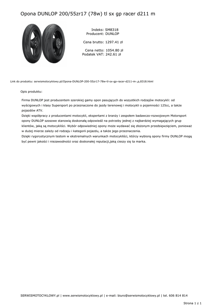 Opona DUNLOP 200/55zr17 (78w) tl sx gp racer d211 m Indeks: SM8318 Producent: DUNLOP Cena brutto: 1297.41 zł Cena netto: 1054.80 zł Podatek VAT: 242.61 zł Link do produktu: serwismotocyklowy.pl/Opona-DUNLOP-200-55zr17-78w-tl-sx-gp-racer-d211-m-,p,8318.html Opis produktu: Firma DUNLOP jest producentem szerokiej gamy opon pasujących do wszystkich rodzajów motocykli: od wyścigowych i klasy Supersport po przeznaczone do jazdy terenowej i motocykli o pojemności 125cc, a także pojazdów ATV. Dzięki współpracy z producentami motocykli, ekspertami z branży i zespołem badawczo-rozwojowym Motorsport opony DUNLOP szosowe stanowią doskonałą odpowiedź na potrzeby jednej z najbardziej wymagających grup klientów, jaką są motocykliści. Wybór odpowiedniej opony może wydawać się złożonym przedsięwzięciem, ponieważ w dużej mierze zależy od rodzaju i kategorii pojazdu, a także jego przeznaczenia. Dzięki rygorystycznym testom w ekstremalnych warunkach motocykliści, którzy wybiorą opony firmy DUNLOP mogą być pewni jakości i niezawodności oraz doskonałej reputacji,jaką cieszy się ta marka. SERWISMOTOCYKLOWY.pl | www.serwismotocyklowy.pl | e-mail: [email protected] | tel. 606 814 814 Strona 1 z 1