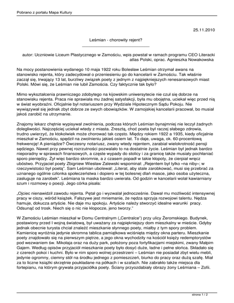 Pobrano z portalu Mapa Kultury 25.11.2010 Leśmian - chorowity rejent? ____________________________ autor: Uczniowie Liceum Plastycznego w Zamościu, wpis powstał w ramach programu CEO Literacki atlas Polski, oprac. Agnieszka Nowakowska Na mocy postanowienia wydanego 10 maja 1922 roku Bolesław Leśmian otrzymał awans na stanowisko rejenta, który zadecydował o przeniesieniu go do kancelarii w Zamościu. Tak właśnie zaczął się, trwający 13 lat, burzliwy związek poety z jednym z najpiękniejszych renesansowych miast Polski. Mówi się, że Leśmian nie lubił Zamościa. Czy faktycznie tak było? Mimo wykształcenia prawniczego zdobytego na kijowskim uniwersytecie nie czuł się dobrze na stanowisku rejenta. Praca nie sprawiała mu żadnej satysfakcji, była mu obojętna, uciekał więc przed nią w świat wyobraźni. Oficjalnie był notariuszem przy Wydziale Hipotecznym Sądu Pokoju. Nie wywiązywał się jednak zbyt dobrze ze swych obowiązków. W zamojskiej kancelarii pracował, bo musiał jakoś zarobić na utrzymanie. Znajomy lekarz chętnie wypisywał zwolnienia, podczas których Leśmian bynajmniej nie leczył żadnych dolegliwości. Najczęściej uciekał wtedy z miasta. Zresztą, choć poeta był raczej słabego zdrowia, trudno uwierzyć, że ktokolwiek może chorować tak często. Między rokiem 1922 a 1935, kiedy oficjalnie mieszkał w Zamościu, spędził na zwolnieniu jakieś osiem lat. To daje, uwaga, ok. 60-procentową frekwencję! A pieniądze? Ówczesny notariusz, zwany wtedy rejentem, zarabiał wielokrotność pensji sędziego. Nawet przy pewnej rozrzutności pozwalało to na dostatnie życie. Leśmian był jednak bardzo nieporadny w sprawach finansowych, a częste wypady do stolicy i za granicę także musiały pochłaniać sporo pieniędzy. Żył więc bardzo skromnie, a z czasem popadł w takie kłopoty, że cierpiał wręcz ubóstwo. Przyjaciel poety Zbigniew Wiesław Zalewski wspominał: „Rejentem był tylko »na niby«; w rzeczywistości był poetą”. Sam Leśmian ubolewał: „Literat, aby stale zarobkować, musi się przebrać za uznanego ogólnie członka społeczeństwa i dopiero w tej bolesnej dlań masce, jako osoba użyteczna, zasługuje na zarobek”. Leśmiana ta maska bardzo uwierała. Od godzin w kancelarii wolał kawiarniany szum i rozmowy o poezji. Jego córka pisała: „Ojciec nienawidził zawodu rejenta. Pętał go i wyzwalał jednocześnie. Dawał mu możliwość intensywnej pracy w ciszy, wśród książek. Fałszywe jest mniemanie, że nędza sprzyja rozwojowi talentu. Nędza hamuje, dokucza artyście. Nie daje mu spokoju. Artyście należy stworzyć idealne warunki pracy. Odsunąć od trosk. Niech się o nic nie kłopocze, jeno tworzy.” W Zamościu Leśmian mieszkał w Domu Centralnym („Centralce”) przy ulicy Żeromskiego. Budynek, postawiony przed I wojną światową, był uważany za najpiękniejszy dom mieszkalny w mieście. Gdyby jednak obecnie turysta chciał znaleźć mieszkanie słynnego poety, miałby z tym spory problem. Kamienicę wyróżnia jedynie skromna tablica pamiątkowa wciśnięta między okna parteru. Mieszkanie poety znajdowało się na pierwszym piętrze, a jego okna wychodziły na kościół księży redemptorystów pod wezwaniem św. Mikołaja oraz na duży park, położony poza fortyfikacjami miejskimi, zwany Małpim Gajem. Według opisów przyjaciół mieszkanie poety było dosyć duże, ładne i pełne słońca. Składało się z czerech pokoi i kuchni. Było w nim sporo wolnej przestrzeni – Leśmian nie posiadał zbyt wielu mebli, jedynie ogromny, ciemny stół na środku jednego z pomieszczeń, biurko do pracy oraz dużą szafę. Miał za to liczne książki skrzętnie poukładane na półkach i w szafach. Nie zabrakło także miejsca dla fortepianu, na którym grywała przyjaciółka poety. Ściany przyozdabiały obrazy żony Leśmiana – Zofii. strona 1 / 2 Pobrano z portalu Mapa Kultury Mikry notariusz-poeta był przez zamojskie otoczenie traktowany jako pewne kuriozum. Może dlatego najczęściej jeździł do pracy dorożką, choć do biura miał zaledwie parę kroków. Gdy wychodził ze swej kamienicy, widział już wieże zamojskiej kolegiaty, za którą stoi dawny pałac Zamoyskich. To w nim mieściła się kancelaria, do której, ku swemu utrapieniu, podążał każdego ranka. Lubił natomiast przechadzać się po Starym Mieście. Często robił sobie przerwy w pracy lub zabierał córki i razem spacerowali w promieniach zachodzącego słońca. Urokliwa zamojska Starówka to dobre miejsce dla artystów. Ale czy dla twórcy takiego jak Leśmian? Takiego, który w swej twórczości niemal zlewa się z dziką przyrodą? strona 2 / 2