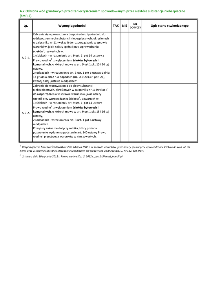 A.2.Ochrona wód gruntowych przed zanieczyszczeniem spowodowanym przez niektóre substancje niebezpieczne (SMR.2). Lp. Wymogi zgodności NIE TAK NIE DOTYCZY Opis stanu stwierdzonego Zabrania się wprowadzania bezpośrednio i pośrednio do wód podziemnych substancji niebezpiecznych, określonych w załączniku nr 11 (wykaz I) do rozporządzenia w sprawie warunków, jakie należy spełnić przy wprowadzaniu ścieków1, zawartych w: 1) ściekach - w rozumieniu art. 9 ust. 1 pkt 14 ustawy z A.2.1. Prawo wodne2 z wyłączeniem ścieków bytowych i komunalnych, o których mowa w art. 9 ust.1 pkt 15 i 16 tej ustawy, 2) odpadach - w rozumieniu art. 3 ust. 1 pkt 6 ustawy z dnia 14 grudnia 2012 r. o odpadach (Dz. U. z 2013 r. poz. 21), zwanej dalej „ustawą o odpadach". Zabrania się wprowadzania do gleby substancji niebezpiecznych, określonych w załączniku nr 11 (wykaz II) do rozporządzenia w sprawie warunków, jakie należy spełnić przy wprowadzaniu ścieków1, zawartych w: 1) ściekach - w rozumieniu art. 9 ust. 1 pkt 14 ustawy Prawo wodne2 z wyłączeniem ścieków bytowych i A.2.2. komunalnych, o których mowa w art. 9 ust.1 pkt 15 i 16 tej ustawy, 2) odpadach - w rozumieniu art. 3 ust. 1 pkt 6 ustawy o odpadach. Powyższy zakaz nie dotyczy rolnika, który posiada pozwolenie wydane na podstawie art. 140 ustawy Prawo wodne i przestrzega warunków w nim zawartych. 1 Rozporządzenie Ministra Środowiska z dnia 24 lipca 2006 r. w sprawie warunków, jakie należy spełnić przy wprowadzaniu ścieków do wód lub do ziemi, oraz w sprawie substancji szczególnie szkodliwych dla środowiska wodnego (Dz. U. Nr 137, poz. 984). 2 Ustawa z dnia 10 stycznia 2012 r. Prawo wodne (Dz. U. 2012 r. poz.145) tekst jednolity)