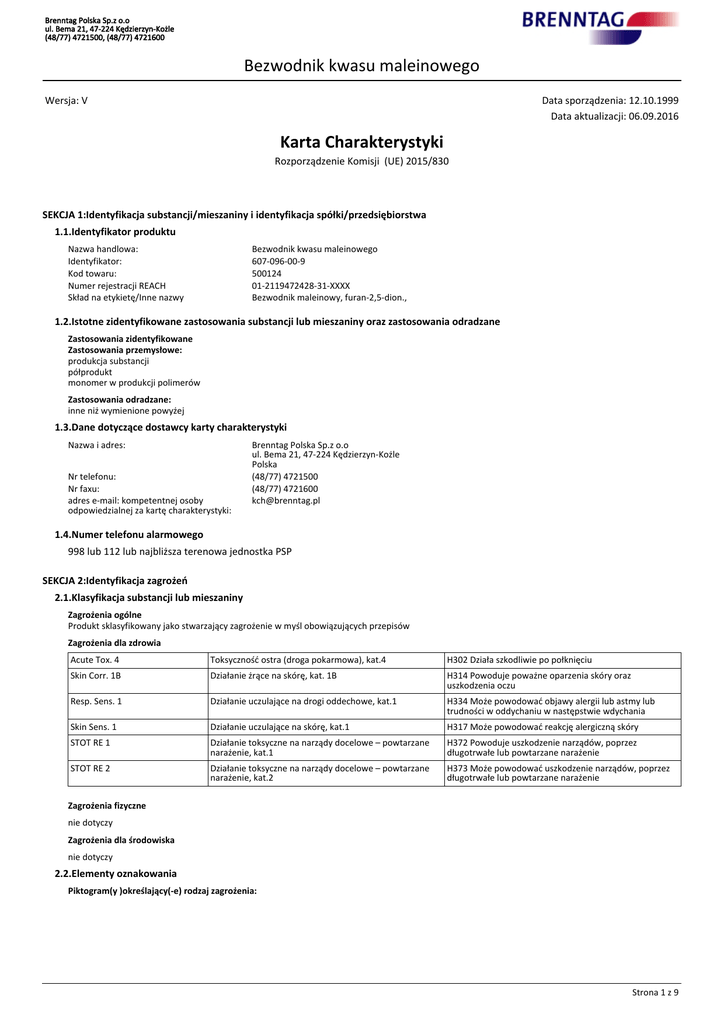 Brenntag Polska Sp.z o.o ul. Bema 21, 47-224 Kędzierzyn-Kożle (48/77) 4721500, (48/77) 4721600 Bezwodnik kwasu maleinowego Wersja: V Data sporządzenia: 12.10.1999 Data aktualizacji: 06.09.2016 Karta Charakterystyki Rozporządzenie Komisji (UE) 2015/830 SEKCJA 1:Identyfikacja substancji/mieszaniny i identyfikacja spółki/przedsiębiorstwa 1.1.Identyfikator produktu Nazwa handlowa: Identyfikator: Kod towaru: Numer rejestracji REACH Skład na etykietę/Inne nazwy Bezwodnik kwasu maleinowego 607-096-00-9 500124 01-2119472428-31-XXXX Bezwodnik maleinowy, furan-2,5-dion., 1.2.Istotne zidentyfikowane zastosowania substancji lub mieszaniny oraz zastosowania odradzane Zastosowania zidentyfikowane Zastosowania przemysłowe: produkcja substancji półprodukt monomer w produkcji polimerów Zastosowania odradzane: inne niż wymienione powyżej 1.3.Dane dotyczące dostawcy karty charakterystyki Nazwa i adres: Nr telefonu: Nr faxu: adres e-mail: kompetentnej osoby odpowiedzialnej za kartę charakterystyki: Brenntag Polska Sp.z o.o ul. Bema 21, 47-224 Kędzierzyn-Kożle Polska (48/77) 4721500 (48/77) 4721600 [email protected] 1.4.Numer telefonu alarmowego 998 lub 112 lub najbliższa terenowa jednostka PSP SEKCJA 2:Identyfikacja zagrożeń 2.1.Klasyfikacja substancji lub mieszaniny Zagrożenia ogólne Produkt sklasyfikowany jako stwarzający zagrożenie w myśl obowiązujących przepisów Zagrożenia dla zdrowia Acute Tox. 4 Toksyczność ostra (droga pokarmowa), kat.4 H302 Działa szkodliwie po połknięciu Skin Corr. 1B Działanie żrące na skórę, kat. 1B H314 Powoduje poważne oparzenia skóry oraz uszkodzenia oczu Resp. Sens. 1 Działanie uczulające na drogi oddechowe, kat.1 H334 Może powodować objawy alergii lub astmy lub trudności w oddychaniu w następstwie wdychania Skin Sens. 1 Działanie uczulające na skórę, kat.1 H317 Może powodować reakcję alergiczną skóry STOT RE 1 Działanie toksyczne na narządy docelowe – powtarzane narażenie, kat.1 H372 Powoduje uszkodzenie narządów, poprzez długotrwałe lub powtarzane narażenie STOT RE 2 Działanie toksyczne na narządy docelowe – powtarzane narażenie, kat.2 H373 Może powodować uszkodzenie narządów, poprzez długotrwałe lub powtarzane narażenie Zagrożenia fizyczne nie dotyczy Zagrożenia dla środowiska nie dotyczy 2.2.Elementy oznakowania Piktogram(y )określający(-e) rodzaj zagrożenia: Strona 1 z 9 Brenntag Polska Sp.z o.o ul. Bema 21, 47-224 Kędzierzyn-Kożle (48/77) 4721500, (48/77) 4721600 Bezwodnik kwasu maleinowego Hasło ostrzegawcze: Niebezpieczeństwo Zwrot(-y) wskazujący(-e) rodzaj zagrożenia: H302 Działa szkodliwie po połknięciu H314 Powoduje poważne oparzenia skóry oraz uszkodzenia oczu H317 Może powodować reakcję alergiczną skóry H334 Może powodować objawy alergii lub astmy lub trudności w oddychaniu w następstwie wdychania H372 Powoduje uszkodzenie narządów, poprzez długotrwałe lub powtarzane narażenie H373 Może powodować uszkodzenie narządów, poprzez długotrwałe lub powtarzane narażenie Zwroty EUH EUH071 Działa żrąco na drogi oddechowe Zwrot(-y) wskazujący(-e) środki ostrożności: P260 Nie wdychać pyłu/dymu/gazu/mgły/par/ rozpylonej cieczy. P280 Stosować rękawice ochronne/odzież ochronną/ ochronę oczu/ochronę twarzy. P301+P330+P331 W PRZYPADKU POŁKNIĘCIA: wypłukać usta. NIE wywoływać wymiotów. P305+P351+P338 W PRZYPADKU DOSTANIA SIĘ DO OCZU: Ostrożnie płukać wodą przez kilka minut. Wyjąć soczewki kontaktowe, jeżeli są i można je łatwo usunąć. Nadal płukać. P333+P313 W przypadku wystąpienia podrażnienia skóry lub wysypki: Zasięgnąć porady/zgłosić się pod opiekę lekarza. P342+P311 W przypadku wystąpienia objawów ze strony układu oddechowego: Skontaktować się z OŚRODKIEM ZATRUĆ lub z lekarzem. P501a Zawartość/pojemnik usuwać do licencjonowanego odbiorcy odpadów 2.3.Inne zagrożenia Brak dostępnych danych SEKCJA 3:Skład/informacja o składnikach 3.1.Substancje Wartość stężenia Substancja CAS WE Numer indeksowy >= 99,5 % Bezwodnik kwasu maleinowego 108-31-6 203-571-6 607-096-00-9 Numer rejestracji REACH Klasa zagrożenia 01-2119472428-31-XXXX Acute Tox. 4, H302, Skin Corr. 1B, H314, Resp. Sens. 1, H334, Skin Sens. 1, H317, STOT RE 1, H372, STOT RE 2, H373 Pełne brzmienie zwrotów H znajduje się w Sekcji 16. SEKCJA 4:Środki pierwszej pomocy 4.1.Opis środków pierwszej pomocy 4.2.Najważniejsze ostre i opóźnione objawy oraz skutki narażenia Skutki i objawy narażenia Wdychanie ból głowy, nudności, wymioty, zaburzenia świadomości, podrażnienie górnych dróg oddechowych, trudności w oddychaniu Kontakt ze skórą przy długotrwałym narażeniu, podrażnienie skóry, w kontakcie ze gorącym produktem, oparzenia, zaczerwienienie Kontakt z oczami podrażnienie oczu, zaczerwienienie, w kontakcie ze gorącym produktem, oparzenia Spożycie zaburzenia świadomości, utrata koordynacji 4.3.Wskazania dotyczące wszelkiej natychmiastowej pomocy lekarskiej i szczególnego postępowania z poszkodowanym SEKCJA 5:Postępowanie w przypadku pożaru 5.1.Środki gaśnicze Odpowiednie środki gaśnicze dwutlenek węgla (CO2), proszek gaśniczy. piana, piasek Niewłaściwe środki gaśnicze Nie używać wody w zwartym strumieniu. 5.2.Szczególne zagrożenia związane z substancją lub mieszaniną Pyły mogą tworzyć z powietrzem mieszaniny wybuchowe. Podczas rozkładu termicznego mogą uwalniać się: drażniące gazy. tlenek węgla. 5.3.Informacje dla straży pożarnej Stosować niezależny aparat oddechowy oraz pełną odzież ochronną. SEKCJA 6:Postępowanie w przypadku niezamierzonego uwolnienia do środowiska Strona 2 z 9 Brenntag Polska Sp.z o.o ul. Bema 21, 47-224 Kędzierzyn-Kożle (48/77) 4721500, (48/77) 4721600 Bezwodnik kwasu maleinowego 6.1.Indywidualne środki ostrożności, sprzęt ochronny i procedury w sytuacjach awaryjnych Stosować środki ochrony osobistej. Stosować obuwie ochronne lub buty z podeszw