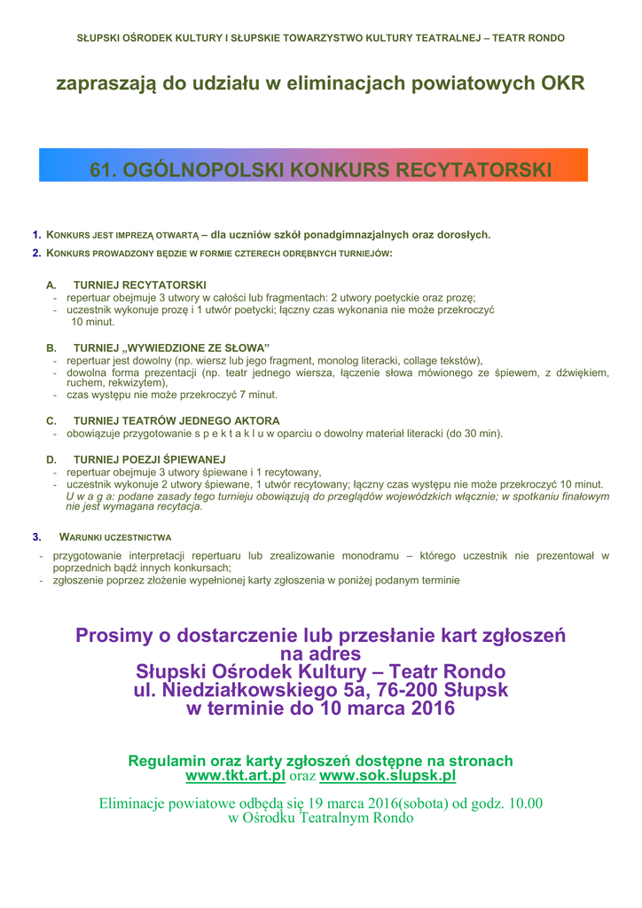 SŁUPSKI OŚRODEK KULTURY I SŁUPSKIE TOWARZYSTWO KULTURY TEATRALNEJ – TEATR RONDO zapraszają do udziału w eliminacjach powiatowych OKR 61. OGÓLNOPOLSKI KONKURS RECYTATORSKI 1. KONKURS JEST IMPREZĄ OTWARTĄ – dla uczniów szkół ponadgimnazjalnych oraz dorosłych. 2. KONKURS PROWADZONY BĘDZIE W FORMIE CZTERECH ODRĘBNYCH TURNIEJÓW: A. TURNIEJ RECYTATORSKI - repertuar obejmuje 3 utwory w całości lub fragmentach: 2 utwory poetyckie oraz prozę; - uczestnik wykonuje prozę i 1 utwór poetycki; łączny czas wykonania nie może przekroczyć 10 minut. B. TURNIEJ „WYWIEDZIONE ZE SŁOWA” - repertuar jest dowolny (np. wiersz lub jego fragment, monolog literacki, collage tekstów), - dowolna forma prezentacji (np. teatr jednego wiersza, łączenie słowa mówionego ze śpiewem, z dźwiękiem, ruchem, rekwizytem), - czas występu nie może przekroczyć 7 minut. C. TURNIEJ TEATRÓW JEDNEGO AKTORA - obowiązuje przygotowanie s p e k t a k l u w oparciu o dowolny materiał literacki (do 30 min). D. TURNIEJ POEZJI ŚPIEWANEJ - repertuar obejmuje 3 utwory śpiewane i 1 recytowany, - uczestnik wykonuje 2 utwory śpiewane, 1 utwór recytowany; łączny czas występu nie może przekroczyć 10 minut. U w a g a: podane zasady tego turnieju obowiązują do przeglądów wojewódzkich włącznie; w spotkaniu finałowym nie jest wymagana recytacja. 3. WARUNKI UCZESTNICTWA - przygotowanie interpretacji repertuaru lub zrealizowanie monodramu – którego uczestnik nie prezentował w poprzednich bądź innych konkursach; - zgłoszenie poprzez złożenie wypełnionej karty zgłoszenia w poniżej podanym terminie Prosimy o dostarczenie lub przesłanie kart zgłoszeń na adres Słupski Ośrodek Kultury – Teatr Rondo ul. Niedziałkowskiego 5a, 76-200 Słupsk w terminie do 10 marca 2016 Regulamin oraz karty zgłoszeń dostępne na stronach www.tkt.art.pl oraz www.sok.slupsk.pl Eliminacje powiatowe odbędą się 19 marca 2016(sobota) od godz. 10.00 w Ośrodku Teatralnym Rondo