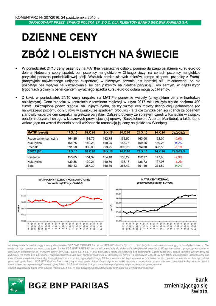 KOMENTARZ Nr 207/2016, 24 października 2016 r. OPRACOWANY PRZEZ SPARKS POLSKA SP. Z O.O. DLA KLIENTÓW BANKU BGŻ BNP PARIBAS S.A. DZIENNE CENY ZBÓŻ I OLEISTYCH NA ŚWIECIE § W poniedziałek 24/10 ceny pszenicy na MATIFie nieznacznie osłabły, pomimo dalszego osłabienia kursu euro do dolara. Notowany spory spadek cen pszenicy na giełdzie w Chicago ciążył na cenach pszenicy na giełdzie paryskiej podczas poniedziałkowej sesji. Wskutek bardzo słabych zbiorów, tempo eksportu pszenicy z Francji (tradycyjnie największego unijnego eksportera) w bieżącym sezonie jest bardziej niż umiarkowane, co nie pozostaje bez wpływu na kształtowanie się cen pszenicy na giełdzie paryskiej. Tym samym, w najbliższych tygodniach głównym beneficjentem wyraźnego spadku kursu euro do dolara mogą być Niemcy. § Z kolei, w poniedziałek 24/10 ceny rzepaku na MATIFie ponownie wzrosły (z wyjątkiem ceny w kontrakcie najbliższym). Cena rzepaku w kontrakcie z terminem realizacji w lutym 2017 roku zbliżyła się do poziomu 400 euro/t. Uszczuplona podaż rzepaku na unijnym rynku, dalszy wzrost cen malezyjskiego oleju palmowego (do najwyższego poziomu od 2,5 roku w związku ze spadkiem produkcji), a także zwyżka cen soi i canoli za oceanem stanowiły wsparcie cen rzepaku na giełdzie paryskiej. Dalsze problemy ze sprzętem canoli w Kanadzie w związku opadami deszczu i śniegu w kluczowych prowincjach jej uprawy (Saskatchewan, Alberta i Manitoba), a także dane wskazujące na wzrost tłoczenia canoli w Kanadzie umacniają jej ceny na giełdzie w Winnipeg. MATIF (euro/t) 17.X.16 18.X.16 19.X.16 20.X.16 21.X.16 24.X.16 24.X/21.X Pszenica konsumcyjna Kukurydza Rzepak CBOT ($/t) 164,25 158,75 391,50 17.X.16 163,75 159,25 392,00 18.X.16 162,75 159,25 393,75 19.X.16 162,50 158,75 392,75 20.X.16 163,00 159,25 394,00 21.X.16 162,00 159,25 393,50 24.X.16 -0,6% 0,0% -0,1% 24.X/21.X Pszenica Kukurydza Soja 155,65 139,36 359,43 154,32 139,21 357,30 154,40 140,70 360,60 153,22 138,18 358,40 152,27 138,73 361,19 147,86 137,08 364,50 -2,9% -1,2% 0,9% MATIF: CENY RZEPAKU (kontrakt najbliższy, EURO/t) MATIF: CENY PSZENICY KONSUMPCYJNEJ (kontrakt najbliższy, EURO/t) 400,00 170,00 395,00 165,00 390,00 385,00 euro/t euro/t 160,00 155,00 380,00 375,00 150,00 370,00 24.X.16 21.X.16 20.X.16 19.X.16 18.X.16 17.X.16 14.X.16 13.X.16 12.X.16 11.X.16 7.X.16 10.X.16 6.X.16 5.X.16 4.X.16 3.X.16 30.IX.16 29.IX.16 28.IX.16 27.IX.16 26.IX.16 24.X.16 21.X.16 20.X.16 19.X.16 18.X.16 17.X.16 14.X.16 13.X.16 12.X.16 11.X.16 7.X.16 10.X.16 6.X.16 5.X.16 4.X.16 3.X.16 30.IX.16 29.IX.16 28.IX.16 27.IX.16 26.IX.16 23.IX.16 23.IX.16 365,00 145,00 Niniejszy materiał został przygotowany dla klientów BGŻ BNP PARIBAS S.A. przez SPARKS Polska Sp. z o.o. i jest jedynie materiałem informacyjnym do użytku odbiorcy. Nie może on być uznany za wyraz poglądów Banku BGŻ BNP PARIBAS ani za rekomendację do dokonania jakiejkolwiek inwestycji. Wszystkie opinie i prognozy wyrażone w niniejszym dokumencie są˛ wyrazem oceny SPARKS Polska Sp. z o.o. w dniu publikacji i mogą ulec zmianie bez zapowiedzi. Żadna część jak i całość utworów zawartych w tej publikacji nie może być powielana i rozpowszechniania lub dalej rozpowszechniana w jakiejkolwiek formie i w jakikolwiek sposób (w tym także elektroniczny, mechaniczny lub inny albo na wszelkich polach eksploatacji) włącznie z szeroko pojętą digitalizacją, fotokopiowaniem lub kopiowaniem, w tym także zamieszczaniem w Internecie - bez uprzedniej pisemnej zgody Banku BGŻ BNP Paribas S.A. z siedzibą w Warszawie. Jakiekolwiek użycie lub wykorzystanie z naruszeniem prawa utworów zawartych w Raporcie, w całości lub w części, bez uprzedniej pisemnej zgody Banku BGŻ BNP Paribas S.A. jest zabronione pod groźbą kary i może być ścigane prawnie. Raport opracowany przez firmę Sparks Polska Sp. z o.o. W celu pozyskania szerszej analizy skontaktuj się z [email protected]