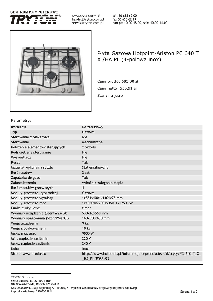 www.tryton.com.pl [email protected] [email protected] tel. 56 658 62 00 fax 56 658 62 19 pon-pt: 10.00-18.00, sob: 10.00-14.00 Płyta Gazowa Hotpoint-Ariston PC 640 T X /HA PL (4-polowa inox) Cena brutto: 685,00 zł Cena netto: 556,91 zł Stan: na jutro Parametry: Instalacja Typ Sterowanie z piekarnika Sterowanie Położenie elementów sterujących Podświetlane sterowanie Wyświetlacz Ruszt Materiał wykonania rusztu Ilość rusztów Zapalarka do gazu Zabezpieczenia Ilość modułów grzewczych Moduły grzewcze typ/rodzaj Moduły grzewcze wymiary Moduły grzewcze moc Funkcje użytkowe Wymiary urządzenia (Szer/Wys/Gł) Wymiary opakowania (Szer/Wys/Gł) Waga urządzenia Waga z opakowaniem Maks. moc gazu Min. napięcie zasilania Maks. napięcie zasilania Kolor Strona www produktu Do zabudowy Gazowa Nie Mechaniczne z przodu Nie Nie Tak Stal emaliowana 2 szt. Tak wskaźnik zalegania ciepła 4 Gazowe 1x551x1001x1301x75 mm 1x10501x27001x36001x1750 kW timer 530x16x550 mm 160x550x630 mm 9 kg 10 kg 9000 W 220 V 240 V inox http://www.hotpoint.pl/informacje-o-produkcie/-/d/plyty/PC_640_T_X_ _HA_PL/F083493 TRYTON Sp. z o.o. Szosa Lubicka 13, 87-100 Toruń NIP 956-20-37-243, REGON 871526851 KRS 0000006913, Sąd Rejonowy w Toruniu, VII Wydział Gospodarczy Krajowego Rejestru Sądowego kapitał zakładowy: 250 000 PLN Strona 1 z 2 www.tryton.com.pl [email protected] [email protected] tel. 56 658 62 00 fax 56 658 62 19 pon-pt: 10.00-18.00, sob: 10.00-14.00 Mimo dołożenia wszelkich starań nie gwarantujemy, że publikowane dane techniczne nie zawierają uchybień lub błędów. W przypadku jakichkolwiek wątpliwości prosimy przed podjęciem decyzji o kontakt z handlowcem. Przedstawiona oferta cenowa ma charakter informacyjny, nie stanowi oferty handlowej w rozumieniu Art.66 par.1 Kodeksu Cywilnego oraz innych właściwych przepisów prawnych. TRYTON Sp. z o.o. Szosa Lubicka 13, 87-100 Toruń NIP 956-20-37-243, REGON 871526851 KRS 0000006913, Sąd Rejonowy w Toruniu, VII Wydział Gospodarczy Krajowego Rejestru Sądowego kapitał zakładowy: 250 000 PLN Strona 2 z 2