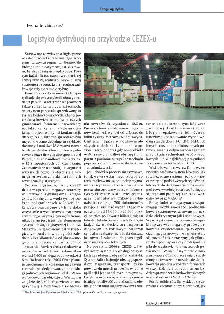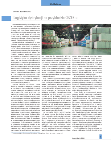 Usługi logistyczne Iwona Trochimczuk1 Logistyka dystrybucji na przykładzie CEZEX-u Stosowane rozwiązania logistyczne w zależności od sprzedawanego asortymentu czy też segmentu klientów, do którego ten asortyment jest kierowany, bardzo różnią się między sobą. Poza tym każda firma, nawet w ramach tej samej branży, realizuje indywidualną strategię rozwoju, której podporządkowuje cały system dystrybucji. Firma CEZEX od siedemnastu lat specjalizuje się w dystrybucji różnego rodzaju papieru, a od trzech lat prowadzi także sprzedaż tworzyw sztucznych. Asortyment przez nią sprzedawany to tysiące kodów towarowych. Klienci potrzebują bowiem papierów o różnych gramaturach, formatach, barwach czy też fakturze. Rynek, na którym działamy, nie jest wolny od konkurencji, dlatego też o sukcesie sprzedażowym niejednokrotnie decyduje tu szybkość dostawy i możliwość dowozu nawet bardzo małej ilości towaru. Towary oferowane przez firmę są dostępne w całej Polsce, a biura handlowe mieszczą się w 13 strategicznych punktach kraju. Zapewnienie w nich stałej dostępności wszystkich pozycji z oferty stałej wymaga sprawnego zarządzania i dobrych rozwiązań logistycznych. System logistyczny f irmy CEZEX działa w oparciu o magazyn centralny w Piotrkowie Trybunalskim i 13 magazynów lokalnych w większych ośrodkach poligraf icznych w Polsce. Lokalizacja pracującego 24 h na dobę w systemie trzyzmianowym magazynu centralnego przy ważnym węźle komunikacyjnym jest istotnym elementem systemu obsługi logistycznej klientów. Magazyn umiejscowiony jest w strategicznym punkcie, w odległości zaledwie kilku kilometrów od planowanego punktu przecięcia autostrad północ – południe. Powierzchnia składowania magazynu w Piotrkowie Trybunalskim wynosi 6 000 m2 sięgając do wysokości 6 m. Do końca roku 2006 firma planuje uruchomienie kolejnego magazynu centralnego, dedykowanego do obsługi północnych regionów Polski. W nowo budowanym obiekcie w Warszawie znajdzie się 3 500 m2 powierzchni magazynowej z możliwością składowa1 nia towarów do wysokości 10,5 m. Powierzchnia składowania magazynów lokalnych wynosi od kilkuset do kilku tysięcy metrów kwadratowych. Centralny magazyn w Piotrkowie obsługuje rozładunki i załadunki z poziomu zero, podczas gdy nowy obiekt w Warszawie umożliwi obsługę transportu z poziomu skrzyni samochodu poprzez system doków rozładunkowo – załadunkowych. Jeśli chodzi o procesy magazynowe, to jak we wszystkich tego typu obiektach, realizowane są operacje przyjmowania i wydawania towaru, wspierane przez zintegrowany system informatyczny klasy ERP. W skali miesiąca magazyn centralny w Piotrkowie Trybunalskim realizuje 700 dokumentów przyjęcia, zaś ilość wydań z tego magazynu to od 16 000 do 20 000 pozycji na miesiąc. Towar z kilkudziesięciu fabryk zlokalizowanych w kilkunastu krajach świata dociera tu transportem drogowym lub kolejowym. Magazyn centralny realizuje rozładunki dostaw, jak również załadunki do poszczególnych magazynów lokalnych. Na początku 2006 r. CEZEX wdrożył nowy system do obsługi wszystkich zagadnień z obszarów logistyki. System Safo obejmuje obsługę sprzedaży, magazynu, transportu, zakupów i wielu innych procesów w jednej aplikacji i jest nadal rozbudowywany. Dzięki nowoczesnym rozwiązaniom istnieje możliwość zarządzania wieloma jednostkami magazynowymi (kon- tener, paleta, karton, ryza itd.) wraz z wieloma jednostkami miary (sztuka, kilogram, opakowanie, itd.). System umożliwia kontrolowanie wydań według standardów FIFO, LIFO, FEFO lub innych, dowolnie definiowalnych potrzeb, wraz z całym wspomaganiem przy użyciu technologii kodów kreskowych lub w najbliższej przyszłości zastosowania technologii RFID. W składowaniu towarów firma wykorzystuje zarówno system blokowy, jak również różne systemy regałów – począwszy od podstawowych regałów paletowych do dedykowanych rozwiązań pod towary wolniej rotujące. Posługuje się regałami produkcji Redirack, Wandalex SA oraz MAGO SA. Pracę ludzi w magazynach wspomagają wózki unoszące, podnośnikowe i systemowe, zarówno o napędzie elektrycznym jak i spalinowym. Wykorzystywane są również owijarki i sprzęt wspomagający procesy pakowania, etykietowania itp. W operacjach magazynowych ważnymi stały się również takie maszyny, jak gilotyny do cięcia papieru czy profesjonalna piła do cięcia wielkoformatowych powierzchni. W najbliższym czasie park maszynowy CEZEX-u zostanie uzupełniony o nowoczesne urządzenie do pakowania papieru w różnych formatach w ryzy. Kolejnym udogodnieniem będzie wprowadzenie kodów kreskowych w standardzie EAN-13 i EAN-128. Portfel odbiorców firmy składa się zarówno z klientów dużych, średnich, jak I.Trochimczuk jest Dyrektorem Marketingu i Zakupów w Cezex Sp. z o.o. – przyp. red. Logistyka 6/2006 81 Usługi logistyczne i małych, o bardzo zróżnicowanych wymaganiach i możliwościach w zakresie dostaw, rozładunku, składowania itp. Zamówienia obsługuje zespół handlowców – koordynatorów pracujących stacjonarnie, jak również grupa przedstawicieli handlowych. Na zbierane przez nich zamówienia reagują odpowiednio magazyny lokalne i magazyn centralny. Całość przesyłek koordynowana jest przez zespół ludzi planujących transporty zarówno z magazynu centralnego, jak i później z magazynów lokalnych. Zamówienia złożone w dowolnym punkcie kraju do godziny 18:00 są realizowane następnego dnia rano z magazynów lokalnych. Transport międzymagazynowy odbywa się w nocy. Dzięki rozbudowanej sieci magazynów lokalnych firma ma możliwość obsługi zamówień klientów w ciągu kilku godzin, a w dużych ośrodkach miejskich dostawy do klientów w poszczególnych rejonach mogą mieć miejsce nawet cztery razy dziennie. Jeśli chodzi o działanie systemu logistycznego, to w dowolnej aglomeracji działa on podobnie. Kiedy po rozpoznaniu potr