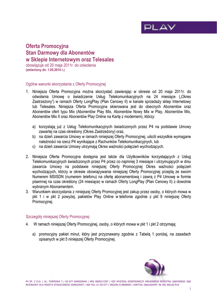 Oferta Promocyjna Stan Darmowy dla Abonentów w Sklepie Internetowym oraz Telesales obowiązuje od 20 maja 2011r. do odwołania (zmieniony dn. 1.05.2014 r.) Ogólne warunki skorzystania z Oferty Promocyjnej 1. Niniejsza Oferta Promocyjna można skorzystać zawierając w okresie od 20 maja 2011r. do odwołania Umowę o świadczenie Usług Telekomunikacyjnych na 24 miesiące („Okres Zastrzeżony”) w ramach Oferty LongPlay (Plan Cenowy II) w kanale sprzedaży sklep Internetowy lub Telesales. Niniejsza Oferta Promocyjna skierowana jest do obecnych Abonentów oraz Abonentów ofert typu Mix (Abonentów Play Mix, Abonentów Nowy Mix w Play, Abonentów Mix, Abonentów Mix II oraz Abonentów Play Online na Kartę z modemem), którzy: a) korzystają już z Usług Telekomunikacyjnych świadczonych przez P4 na podstawie Umowy zawartej na czas określony (Okres Zastrzeżony) oraz, b) na dzień zawarcia Umowy w ramach niniejszej Oferty Promocyjnej, uiścili wszystkie wymagane należności na rzecz P4 wynikające z Rachunków Telekomunikacyjnych, lub c) na dzień zawarcia Umowy utrzymają Okres ważności połączeń wychodzących. 2. Niniejsza Oferta Promocyjna dostępna jest także dla Użytkowników korzystających z Usług Telekomunikacyjnych świadczonych przez P4 przez co najmniej 3 miesiące i utrzymujących w dniu zawarcia Umowy na podstawie niniejszej Oferty Promocyjnej Okres ważności połączeń wychodzących, którzy w okresie obowiązywania niniejszej Oferty Promocyjnej przejdą ze swoim Numerem MSISDN (numerem telefonu) na ofertę abonamentową i zawrą z P4 Umowę w formie pisemnej na czas określony (24 miesiące) w ramach Oferty LongPlay (Plan Cenowy II) z dowolnie wybranym Abonamentem. 3. Warunkiem skorzystania z niniejszej Oferty Promocyjnej jest zakup przez osoby, o których mowa w pkt 1 i w pkt 2 powyżej, pakietów Play Online w telefonie zgodnie z pkt 9 niniejszej Oferty Promocyjnej. Szczegóły niniejszej Oferty Promocyjnej 4. W ramach niniejszej Oferty Promocyjnej, osoby, o których mowa w pkt 1 i pkt 2 otrzymają: a) promocyjny pakiet minut, który jest przyznawany zgodnie z Tabelą 1 poniżej, na zasadach opisanych w pkt 5 niniejszej Oferty Promocyjnej. P4 SP. Z O.O. / UL. TAŚMOWA 7 / 02-677 WARSZAWA / KRS 0000217207 / XIII WYDZIAŁ GOSPODARCZY KRAJOWEGO REJESTRU SĄDOWEGO SĄD REJONOWY DLA MIASTA STOŁECZNEGO WARSZAWY / NIP 951-21-20-077 / REGON 015808609 / KAPITAŁ ZAKŁADOWY 48 456 500,00 PLN 1 Tabela 1 Promocyjny pakiet minut LongPlay II 29 (Stan Darmowy 29) LongPlay II 49 (Stan Darmowy 49) LongPlay II 69 (Stan Darmowy 69) 100 minut Okres na jaki jest przyznawany promocyjny pakiet minut LongPlay II 99 (Stan Darmowy 99) LongPlay II 129 (Stan Darmowy 129) 30538 Abonament 200 minut Przez 6 pierwszych, pełnych Okresów Rozliczeniowych b) promocyjny pakiet złotówek, który jest przyznawany zgodnie z Tabelą 2 poniżej, na zasadach opisanych w pkt 6 niniejszej Oferty Promocyjnej. Tabela 2 Abonament LongPlay II 29 (Stan Darmowy 29) LongPlay II 49 (Stan Darmowy 49) LongPlay II 69 (Stan Darmowy 69) LongPlay II 99 (Stan Darmowy 99) LongPlay II 129 (Stan Darmowy 129) Promocyjny pakiet złotówek 17,80 PLN 20,60 PLN 32,50 PLN 5,50 PLN 61 PLN c) promocyjną usługę „Nieograniczone połączenia w Play”, z której mogą korzystać w okresie zależnym od wysokości wybranego Abonamentu, zgodnie z Tabelą 3, na zasadach opisanych w pkt 7 niniejszej Oferty Promocyjnej. P4 SP. Z O.O. / UL. TAŚMOWA 7 / 02-677 WARSZAWA / KRS 0000217207 / XIII WYDZIAŁ GOSPODARCZY KRAJOWEGO REJESTRU SĄDOWEGO SĄD REJONOWY DLA MIASTA STOŁECZNEGO WARSZAWY / NIP 951-21-20-077 / REGON 015808609 / KAPITAŁ ZAKŁADOWY 48 456 500,00 PLN 2 Tabela 3 LongPlay II 29 (Stan Darmowy 29) LongPlay II 49 (Stan Darmowy 49) Okres Bezpłatnego korzystania z promocyjnej usługi "Nieograniczone połączenia w Play" Przez 3 pierwsze pełne Okresy Rozliczeniowe Przez 6 pierwszych, pełnych Okresów Rozliczeniowych LongPlay II 69 (Stan Darmowy 69) LongPlay II 99 (Stan Darmowy 99) LongPlay II 129 (Stan Darmowy 129) 30538 Abonament Przez cały Okres Zastrzeżony oraz po przekształceniu się Umowy w Umowę na czas nieokreślony d) w przypadku zawarcia Umowy z Abonamentem LongPlay II 69 lub LongPlay II 99 rabat na Abonament, w wysokości uzależnionej od kwoty wybranego Abonamentu zgodnie z Tabelą 4 i na zasadach opisanych w pkt 8 niniejszej Oferty Promocyjnej. Tabela 4 Abonament LongPlay II 69 (Stan Darmowy 69) LongPlay II 99 (Stan Darmowy 99) Wysokość Abonamentu przed rabatem 69 PLN 99 PLN Procentowa wysokość rabatu 14,49% 20,20% 5. Szczegóły przyznawania promocyjnego pakietu minut, o którym mowa w pkt 4 lit. a. a) Wysokość pakietu minut uzależniona jest od kwoty wybranego Abonamentu, zgodnie z Tabelą 1 powyżej, niniejszej Oferty Promocyjnej. b) Pakiet minut jest przyznawany przez sześć pierwszych, pełnych Okresów Rozliczeniowych Bezpłatnie, co oznacza, że opłata za pakiet minut przyznawany Abonentowi w ramach niniejszej Oferty Promocyjnej, zawarta jest w kwocie Abonamentu. c) Pakiet minut może być wykorzystany na krajowe połączenia głosowe oraz wideo do krajowych sieci komórkowych i na krajowe połączenia głosowe na krajowe numery stacjonarne realizowane z Sieci Telekomunikacyjnej P4. P4 SP. Z O.O. / UL. TAŚMOWA 7 / 02-677 WARSZAWA / KRS 0000217207 / XIII WYDZIAŁ GOSPODARCZY KRAJOWEGO REJESTRU SĄDOWEGO SĄD REJONOWY DLA MIASTA STOŁECZNEGO WARSZAWY / NIP 951-21-20-077 / REGON 015808609 / KAPITAŁ ZAKŁADOWY 48 456 500,00 PLN 3 d) Pakiet minut jest przyznawany pierwszego dnia kalendarzowego każdego Okresu Rozliczeniowego, pomiędzy godziną 00:00 a 01:00. e) W pierwszym niepełnym Okresie Rozliczeniowym pakiet minut jest przyznawany pomiędzy godziną 00:00 a 01:00 pierwszego dnia kalendarzowego następującego po dniu, w którym nastąpiła aktywacja Numeru MSISDN. Liczba minut w pakiecie minut jest proporcjonalna do liczby dni pozostałych do końca tego Okresu Rozliczeniowego. f) W pr