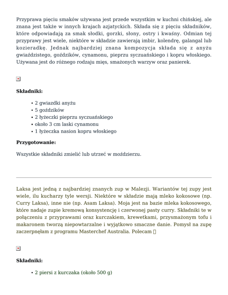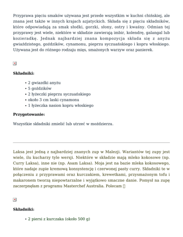 Przyprawa pięciu smaków używana jest przede wszystkim w kuchni chińskiej, ale znana jest także w innych krajach azjatyckich. Składa się z pięciu składników, które odpowiadają za smak słodki, gorzki, słony, ostry i kwaśny. Odmian tej przyprawy jest wiele, niektóre w składzie zawierają imbir, kolendrę, galangal lub kozieradkę. Jednak najbardziej znana kompozycja składa się z anyżu gwiaździstego, goździków, cynamonu, pieprzu syczuańskiego i kopru włoskiego. Używana jest do różnego rodzaju mięs, smażonych warzyw oraz panierek. Składniki: 2 gwiazdki anyżu 5 goździków 2 łyżeczki pieprzu syczuańskiego około 3 cm laski cynamonu 1 łyżeczka nasion kopru włoskiego Przygotowanie: Wszystkie składniki zmielić lub utrzeć w moździerzu. Laksa jest jedną z najbardziej znanych zup w Malezji. Wariantów tej zupy jest wiele, ilu kucharzy tyle wersji. Niektóre w składzie mają mleko kokosowe (np. Curry Laksa), inne nie (np. Asam Laksa). Moja jest na bazie mleka kokosowego, które nadaje zupie kremową konsystencję i czerwonej pasty curry. Składniki te w połączeniu z przyprawami oraz kurczakiem, krewetkami, przysmażonym tofu i makaronem tworzą niepowtarzalne i wyjątkowo smaczne danie. Pomysł na zupę zaczerpnęłam z programu Masterchef Australia. Polecam Składniki: 2 piersi z kurczaka (około 500 g) 250 g mrożonych krewetek 300 g chińskiego makaronu jajecznego 200 g tofu 1,75 l bulionu drobiowego 300 ml mleka kokosowego 1/2 słoiczka czerwonej pasty curry (około 60 g) 1/2 małej papryczki chili świeży imbir (wielkości kciuka) 2 trawy cytrynowe 2 szalotki 3 duże ząbki czosnku 20 g orzechów nerkowca 1 łyżka kurkumy 1 płaska łyżka mąki ziemniaczanej 3 łyżki sosu rybnego 1 łyżeczka cukru palmowego (opcjonalnie trzcinowego) olej do smażenia ciemny sos sojowy (do doprawienia zupy) Dodatkowo: świeża kolendra do posypania limonka do skropienia zupy Przygotowanie: Makaron gotujemy w lekko osolonej wodzie, odcedzamy i przelewamy zimną wodą. Piersi z kurczaka myjemy, osuszamy i kroimy w kostkę. Trawę cytrynową obieramy, odcinamy część u nasady pędu (którą wykorzystujemy), rozbijamy lekko tłuczkiem i bardzo cieniutko kroimy. Imbir ścieramy na tarce o dużych oczkach (lub kroimy), szalotki siekamy. Papryczkę chili i czosnek również siekamy, ale bardzo drobno. Krewetki rozmrażamy, osuszamy, jeżeli trzeba oczyszczamy. Na dużej patelni rozgrzewamy trochę oleju, wrzucamy pokrojonego kurczaka i chwilę smażymy. Dodajemy posiekane szalotki, trawę cytrynową, starty imbir, chili i kurkumę. Mieszamy i smażymy. Pod koniec smażenia wsypujemy zmiksowane lub rozgniecione w moździerzu orzechy nerkowca. W garnku zagotowujemy bulion, dodajemy zawartość patelni, czerwoną pastę curry, cukier palmowy, sos rybny i wlewamy mleko kokosowe. Mieszamy. Gotujemy na małym ogniu około 10 minut. Mąkę ziemniaczaną rozrabiamy z odrobiną wody i pomału wlewamy do zupy ciągle mieszając. Następnie dodajemy krewetki i gotujemy, aż staną się miękkie. Zupę doprawiamy sosem sojowym. Tofu osuszamy papierowym ręcznikiem i kroimy w plastry około 1 cm. Na patelni rozgrzewamy olej i smażymy tofu z dwóch stron na złoty kolor. Wyjmujemy i przekładamy po jednym plastrze na dno każdego talerza. Dodajemy ugotowany makaron i zalewamy zupą. Posypujemy posiekaną kolendrą i skrapiamy sokiem z limonki. Smacznego Trzeci konkurs już za nami… Dziękuję za aktywny udział wszystkim uczestnikom i za wspólną zabawę Przy okazji zapraszam na kolejny konkurs, który odbędzie się tuż przed Wielkanocą Torbę termiczną zdobywa Pan Sławomir K. za odpowiedź : Dnia pewnego z dziewczyną piknik nam się zamarzył, Dzień ten był katastrofą, oby się nie wydarzył, Spod kołderki wyszliśmy, wszystko było jak trzeba, Piknik miał być nad rzeczką, słońce prażyło z nieba. Moja Pani szczęśliwa – nie, że będę pod bokiem, Tylko z torby z jedzeniem – była strasznym żarłokiem, Torba jak na Kalwarię – wypełniona po brzegi, Tak, że w aucie mi było ciężko przerzucać biegi. W aucie klima zepsuta, pot po tyłku się leje, Ona patrzy na torbę, i się do niej wciąż śmieje, W kółko ręka jej lata od torebki do japy, Och… jak bym się odwinął, jakbym strzelił przez łapy… Gdy na miejscu stanąłem to aż ze mnie kapało, Wyskoczyłem z pojazdu, ale chłodu wciąż mało, Mówię do niej – kochana, rozłóż kocyk przy drodze, A ja wskoczę do rzeczki i szybciutko się schłodzę. Już zrobiło się dobrze, odparował pot z czoła, Serce mocno zabiło – z boku kąpie się goła, Nagle coś mnie olśniło i zapycham do brzegu, Coś do żarcia zostało? Więc ja gotów do biegu. Ciekaw jestem czy został chociaż skrawek batona, Patrzę na brzeg – a ona biega cała czerwona, Wymachuję i krzyczy, słychać na rzeki środku, Więc spokojnie podchodzę i pytam – co jest kotku? Ona spazmów dostała, że aż prawie się dusi, I tak szepcze pół słowem – do dom zawieść mnie musisz, Otworzyłam torebkę – aż wykręca od smrodu, Papu nam się zepsuło – przecież ja umrę z głodu. Brak mi tlenu kochanie, ja się zaraz uduszę, Już godzina minęła, przecież przegryźć coś muszę, I tak smutny i wściekły wracać szybko musiałem, Górę wzięło jedzenie – i się z panną rozstałem. Teraz jestem szczęśliwy, bo kobietę mam nową, Ale myśleć zacząłem – nie główeczką – lecz głową, A że druga też lubi podniebienie masować, Obmyśliłem już wcześniej jak jedzenie przechować. Rozwiązanie jest dla mnie oczywiście logiczne, Brak mi jest Merci Shef’a – super torby termicznej, Szansę wygrać tą torbę oryginalnysmak daje, Błagam – dajcie mi taką – niech choć druga się naje Gratuluję Ada Lubicie konkursy ? Mam dla Was kolejny Tym razem do wygrania jest praktyczna i poręczna torba termiczna Merci Chef. Co zrobić by ją wygrać ? Wystarczy polubić stronę na facebooku 