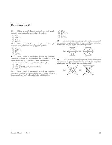 Ćwiczenia do § 8 8.1 Oblicz gru bość, liczbę p rzecięć, stop ień n iep lan arn ości oraz gen u s d la n astęp u jący ch grafów : (a) K4 ; (b) L(K4 ); (c) Q4 ; (d) L(Q3 ). 8.2 Oblicz gru bość, liczbę p rzecięć, stop ień n iep lan arn ości oraz gen u s d la n astęp u jący ch grafów : (a) K2,4 ; (b) L(K2,4 ); (c) W5 ; (d) L(W5 ). (a) (b) (c) (d) K2,4 ; L(K2,4 ); W5 ; L(W5 ). 8.5 Ustal, k tóre z p on iższy ch grafów m ożn a n ary sow ać bez p rzecięć n a p łaszczy źn ie w tak i sp osób, że w szy stk ie w ierzch ołk i zn ajd ą się n a zew n ętrzn ej ścian ie. r r r r (a) r (b) r r 8.3 Ustal, k tóre z p on iższy ch grafów są p lan arn e. Następ n ie n ary su j je, zazn aczając n a ry su n k u p od graf h om eom orfi czn y z K3,3 lu b K5 (o ile tak i istn ieje). (a) (b) (c) (d) K6 bez trzech tw orzący ch trójk ąt k raw ęd zi; L(K2,4 ); d w a grafy Q3 p ołączon e m ostem ; L(W5 ). 8.4 Ustal, k tóre z p on iższy ch grafów są p lan arn e. Następ n ie n ary su j je, zazn aczając n a ry su n k u p od graf h om eom orfi czn y z K3,3 lu b K5 (o ile tak i istn ieje). Teo ria G ra fó w i Sieci r r r r r 8.6 Ustal, k tóre z p on iższy ch grafów m ożn a n ary sow ać bez p rzecięć n a p łaszczy źn ie w tak i sp osób, że w szy stk ie w ierzch ołk i zn ajd ą się n a zew n ętrzn ej ścian ie. r r r r r r r r r r (b) (a) r r r r r r 85 Zadania do §8 8.7 Dla jakich liczb naturalnych r, s i t grafy Kr,s i Kr,s,t są planarne? 8.8 C zy istnieje 3-regularny graf planarny bez trójkątów? Dla jakich r ∈ N istnieje chociaż jeden r-regularny graf planarny? 8.9 Dla jakich n ∈ N istnieje chociaż jeden nwierzchołkowy graf planarny o m = 3n − 6 krawędziach? 8.10 Dla każdego n ≤ 8 skonstruuj n-wierzchołkowy graf planarny, którego dopełnienie jest planarne. 8.11e Dla jakich r ∈ N istnieje chociaż jeden r-regularny dwudzielny graf planarny? 8.12e C zy istnieje graf, który jest nieeulerowski, niehamiltonowski, spójny, nieplanarny i na dodatek nie zawiera trójkątów? 8.15 Niech k ≥ 6 oraz n ≥ 3 będą liczbami naturalnymi. W ykaż, że każdy spójny n-wierzchołkowy graf plak−6 12 narny G ma co najmniej k−1 n+ k−1 wierzchołków stopnia mniejszego niż k. 8.16 Niech n ≥ 4 będzie liczbą naturalną. W ykaż, że każdy n-wierzchołkowy graf planarny posiada co najmniej 4 wierzchołki stopnia mniejszego niż 6. 8.17 Niech n ≥ 3 będzie liczbą naturalną. W ykaż, że każdy n-wierzchołkowy graf planarny bez trójkątów posiada co najmniej 3 wierzchołki stopnia mniejszego niż 4. 8.18 Niech Gi będzie ni -wierzchołkowym grafem stopnia ∆i o mi krawędziach dla i = 1 , 2. W ykaż, że jeżeli grafy G1 , G2 są homeomorficzne, to (a) m1 − n1 = m2 − n2 ; (b) graf G1 jest eulerowski, wtedy i tylko wtedy, gdy graf G2 jest eulerowski; (c) jeżeli ani G1 , ani G2 nie jest ścieżką, to ∆1 = ∆2 . 8.13 W ykaż, że dopełnienie spójnego grafu planarnego jest grafem posiadającym co najwyżej 4 składowe spójności, z których co najwyżej jedna ma więcej niż 2 wierzchołki. C zy implikacja odwrotna jest prawdziwa? 8.19 W ykaż, że każdy graf jest homeomorficzny z pewnym grafem dwudzielnym. 8.14 Niech n ≥ 3 będzie liczbą naturalną. W ykaż, że jeżeli G jest spójnym n-wierzchołkowym grafem planarnym o m krawędziach i obwodzie równym r, to m ≤ r n−2 r−2 . 8.20 Ustal, czy istnieje taki graf planarny, w którym każdy wierzchołek ma stopień większy lub równy 5 i żadne dwa wierzchołki stopnia 5 nie sąsiadują z sobą. Teoria Grafów i Sieci 86