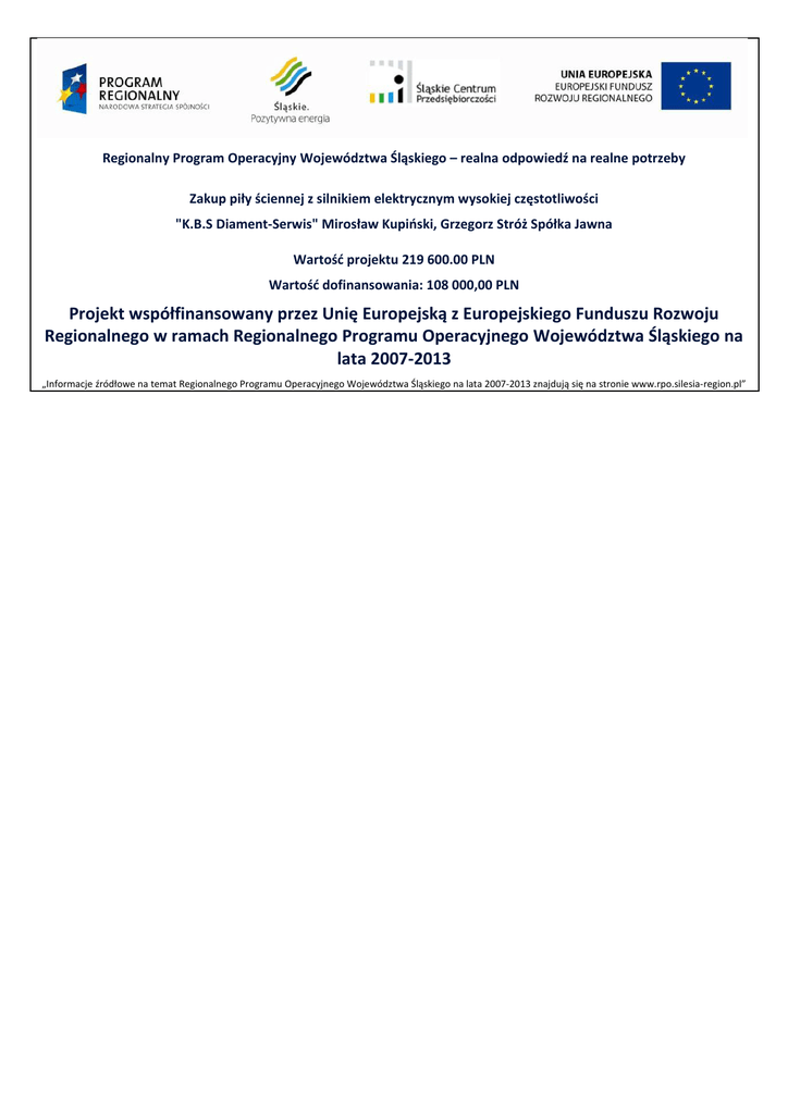 Regionalny Program Operacyjny Województwa Śląskiego – realna odpowiedź na realne potrzeby Zakup piły ściennej z silnikiem elektrycznym wysokiej częstotliwości "K.B.S Diament-Serwis" Mirosław Kupiński, Grzegorz Stróż Spółka Jawna Wartość projektu 219 600.00 PLN Wartość dofinansowania: 108 000,00 PLN Projekt współfinansowany przez Unię Europejską z Europejskiego Funduszu Rozwoju Regionalnego w ramach Regionalnego Programu Operacyjnego Województwa Śląskiego na lata 2007-2013 „Informacje źródłowe na temat Regionalnego Programu Operacyjnego Województwa Śląskiego na lata 2007-2013 znajdują się na stronie www.rpo.silesia-region.pl”