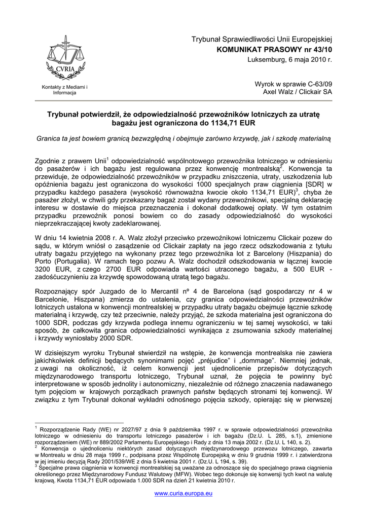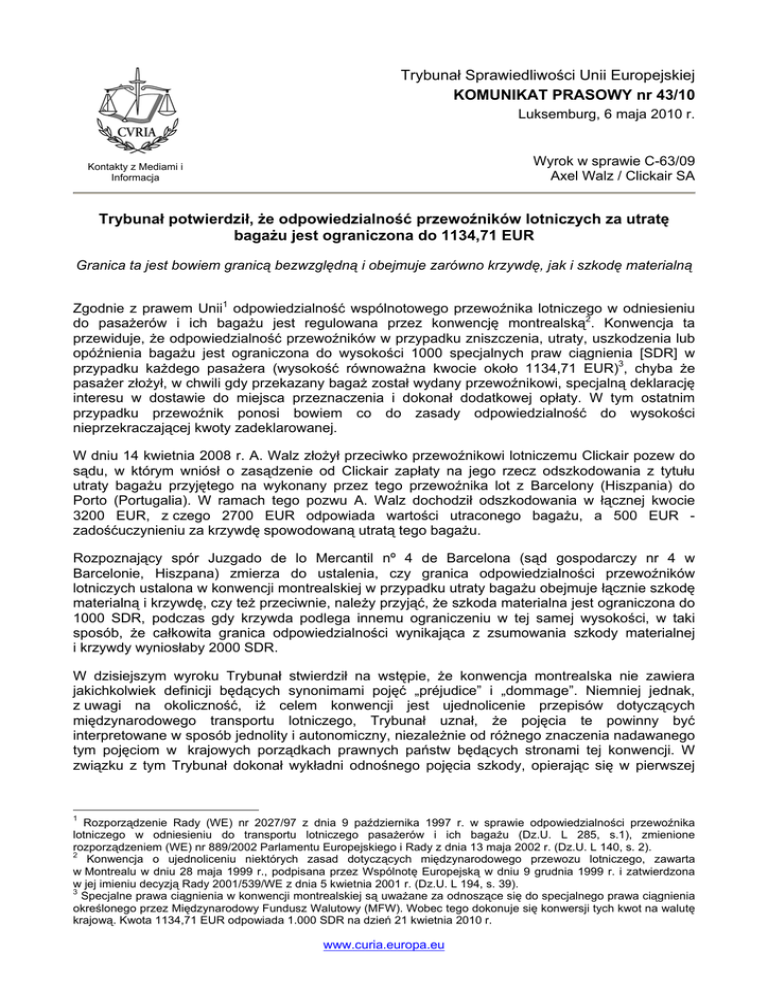 Trybunał Sprawiedliwości Unii Europejskiej KOMUNIKAT PRASOWY nr 43/10 Luksemburg, 6 maja 2010 r. Wyrok w sprawie C-63/09 Axel Walz / Clickair SA Kontakty z Mediami i Informacja Trybunał potwierdził, że odpowiedzialność przewoźników lotniczych za utratę bagażu jest ograniczona do 1134,71 EUR Granica ta jest bowiem granicą bezwzględną i obejmuje zarówno krzywdę, jak i szkodę materialną Zgodnie z prawem Unii1 odpowiedzialność wspólnotowego przewoźnika lotniczego w odniesieniu do pasażerów i ich bagażu jest regulowana przez konwencję montrealską2. Konwencja ta przewiduje, że odpowiedzialność przewoźników w przypadku zniszczenia, utraty, uszkodzenia lub opóźnienia bagażu jest ograniczona do wysokości 1000 specjalnych praw ciągnienia [SDR] w przypadku każdego pasażera (wysokość równoważna kwocie około 1134,71 EUR)3, chyba że pasażer złożył, w chwili gdy przekazany bagaż został wydany przewoźnikowi, specjalną deklarację interesu w dostawie do miejsca przeznaczenia i dokonał dodatkowej opłaty. W tym ostatnim przypadku przewoźnik ponosi bowiem co do zasady odpowiedzialność do wysokości nieprzekraczającej kwoty zadeklarowanej. W dniu 14 kwietnia 2008 r. A. Walz złożył przeciwko przewoźnikowi lotniczemu Clickair pozew do sądu, w którym wniósł o zasądzenie od Clickair zapłaty na jego rzecz odszkodowania z tytułu utraty bagażu przyjętego na wykonany przez tego przewoźnika lot z Barcelony (Hiszpania) do Porto (Portugalia). W ramach tego pozwu A. Walz dochodził odszkodowania w łącznej kwocie 3200 EUR, z czego 2700 EUR odpowiada wartości utraconego bagażu, a 500 EUR zadośćuczynieniu za krzywdę spowodowaną utratą tego bagażu. Rozpoznający spór Juzgado de lo Mercantil nº 4 de Barcelona (sąd gospodarczy nr 4 w Barcelonie, Hiszpana) zmierza do ustalenia, czy granica odpowiedzialności przewoźników lotniczych ustalona w konwencji montrealskiej w przypadku utraty bagażu obejmuje łącznie szkodę materialną i krzywdę, czy też przeciwnie, należy przyjąć, że szkoda materialna jest ograniczona do 1000 SDR, podczas gdy krzywda podlega innemu ograniczeniu w tej samej wysokości, w taki sposób, że całkowita granica odpowiedzialności wynikająca z zsumowania szkody materialnej i krzywdy wyniosłaby 2000 SDR. W dzisiejszym wyroku Trybunał stwierdził na wstępie, że konwencja montrealska nie zawiera jakichkolwiek definicji będących synonimami pojęć „préjudice” i „dommage”. Niemniej jednak, z uwagi na okoliczność, iż celem konwencji jest ujednolicenie przepisów dotyczących międzynarodowego transportu lotniczego, Trybunał uznał, że pojęcia te powinny być interpretowane w sposób jednolity i autonomiczny, niezależnie od różnego znaczenia nadawanego tym pojęciom w krajowych porządkach prawnych państw będących stronami tej konwencji. W związku z tym Trybunał dokonał wykładni odnośnego pojęcia szkody, opierając się w pierwszej 1 Rozporządzenie Rady (WE) nr 2027/97 z dnia 9 października 1997 r. w sprawie odpowiedzialności przewoźnika lotniczego w odniesieniu do transportu lotniczego pasażerów i ich bagażu (Dz.U. L 285, s.1), zmienione rozporządzeniem (WE) nr 889/2002 Parlamentu Europejskiego i Rady z dnia 13 maja 2002 r. (Dz.U. L 140, s. 2). 2 Konwencja o ujednoliceniu niektórych zasad dotyczących międzynarodowego przewozu lotniczego, zawarta w Montrealu w dniu 28 maja 1999 r., podpisana przez Wspólnotę Europejską w dniu 9 grudnia 1999 r. i zatwierdzona w jej imieniu decyzją Rady 2001/539/WE z dnia 5 kwietnia 2001 r. (Dz.U. L 194, s. 39). 3 Specjalne prawa ciągnienia w konwencji montrealskiej są uważane za odnoszące się do specjalnego prawa ciągnienia określonego przez Międzynarodowy Fundusz Walutowy (MFW). Wobec tego dokonuje się konwersji tych kwot na walutę krajową. Kwota 1134,71 EUR odpowiada 1.000 SDR na dzień 21 kwietnia 2010 r. www.curia.europa.eu kolejności na zwykłym znaczeniu pojęć préjudice i dommage, jakie należy nadać tym pojęciom w ogólnym prawie międzynarodowym. W drugiej kolejności Trybunał dokonał analizy celów przyświecających przyjęciu konwencji montrealskiej. Trybunał stwierdził, że konwencja montrealska ustanawia system ścisłej odpowiedzialności przewoźników lotniczych. W istocie bowiem, w odniesieniu zwłaszcza do szkód poniesionych w przypadku zniszczenia, utraty lub uszkodzenia przyjętego bagażu, domniemywa się, że przewoźnik jest odpowiedzialny za te szkody, jeżeli „wydarzenie, które spowodowało zniszczenie, utratę lub uszkodzenie bagażu nastąpiło na pokładzie statku powietrznego lub podczas jakiegokolwiek okresu, w którym przyjęty bagaż był pod opieką przewoźnika.” W związku z tym Trybunał stwierdził, że taki system ścisłej odpowiedzialności oznacza konieczność zachowania „sprawiedliwej równowagi interesów”, w szczególności w zakresie dotyczącym interesów przewoźników lotniczych oraz interesów pasażerów. Tym samym, wspomniana „sprawiedliwa równowaga interesów” wymaga w poszczególnych sytuacjach, w których przewoźnik jest odpowiedzialny na podstawie konwencji montrealskiej, istnienia wyraźnych granic odszkodowania odnoszących się do całej szkody poniesionej przez każdego pasażera w każdej z tych sytuacji, niezależnie od charakteru szkody poniesionej przez tego pasażera. Skonstruowane w ten sposób ograniczenie odszkodowania pozwala bowiem na łatwe i szybkie uzyskanie odszkodowania przez pasażerów, bez nakładania przy tym na przewoźników lotniczych zbyt ciężkiego obowiązku naprawienia szkody, trudnego do określenia i obliczenia, które mogłoby utrudnić, a nawet sparaliżować ich działalność gospodarczą. Ponadto Trybunał przypomniał, że konwencja montrealska przewiduje możliwość złożenia przez pasażera specjalnej deklaracji interesu w chwili wydania przyjętego bagażu przewoźnikowi za dokonaniem ewentualnej dodatko