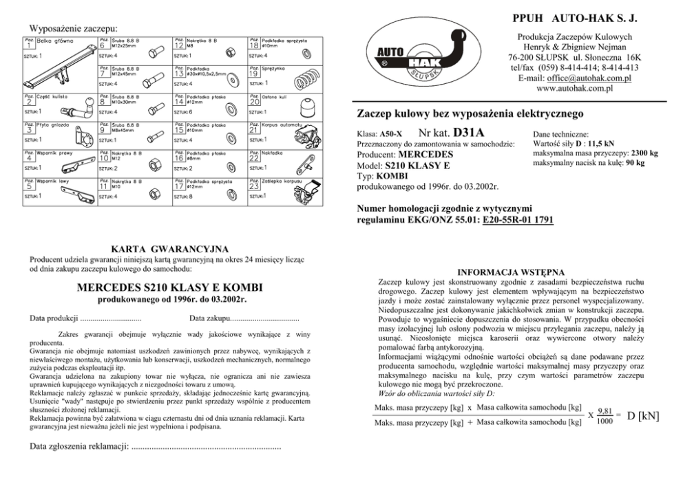 PPUH AUTO-HAK S. J. WyposaŜenie zaczepu: Produkcja Zaczepów Kulowych Henryk & Zbigniew Nejman 76-200 SŁUPSK ul. Słoneczna 16K tel/fax (059) 8-414-414; 8-414-413 E-mail: [email protected] www.autohak.com.pl Zaczep kulowy bez wyposaŜenia elektrycznego D31A Klasa: A50-X Nr kat. Przeznaczony do zamontowania w samochodzie: Producent: MERCEDES Model: S210 KLASY E Typ: KOMBI produkowanego od 1996r. do 03.2002r. Dane techniczne: Wartość siły D : 11,5 kN maksymalna masa przyczepy: 2300 kg maksymalny nacisk na kulę: 90 kg Numer homologacji zgodnie z wytycznymi regulaminu EKG/ONZ 55.01: E20-55R-01 1791 KARTA GWARANCYJNA Producent udziela gwarancji niniejszą kartą gwarancyjną na okres 24 miesięcy licząc od dnia zakupu zaczepu kulowego do samochodu: MERCEDES S210 KLASY E KOMBI produkowanego od 1996r. do 03.2002r. Data produkcji .............................. Data zakupu.................................. Zakres gwarancji obejmuje wyłącznie wady jakościowe wynikające z winy producenta. Gwarancja nie obejmuje natomiast uszkodzeń zawinionych przez nabywcę, wynikających z niewłaściwego montaŜu, uŜytkowania lub konserwacji, uszkodzeń mechanicznych, normalnego zuŜycia podczas eksploatacji itp. Gwarancja udzielona na zakupiony towar nie wyłącza, nie ogranicza ani nie zawiesza uprawnień kupującego wynikających z niezgodności towaru z umową. Reklamacje naleŜy zgłaszać w punkcie sprzedaŜy, składając jednocześnie kartę gwarancyjną. Usunięcie "wady" następuje po stwierdzeniu przez punkt sprzedaŜy wspólnie z producentem słuszności złoŜonej reklamacji. Reklamacja powinna być załatwiona w ciągu czternastu dni od dnia uznania reklamacji. Karta gwarancyjna jest niewaŜna jeŜeli nie jest wypełniona i podpisana. Data zgłoszenia reklamacji: ................................................................... INFORMACJA WSTĘPNA Zaczep kulowy jest skonstruowany zgodnie z zasadami bezpieczeństwa ruchu drogowego. Zaczep kulowy jest elementem wpływającym na bezpieczeństwo jazdy i moŜe zostać zainstalowany wyłącznie przez personel wyspecjalizowany. Niedopuszczalne jest dokonywanie jakichkolwiek zmian w konstrukcji zaczepu. Powoduje to wygaśniecie dopuszczenia do stosowania. W przypadku obecności masy izolacyjnej lub osłony podwozia w miejscu przylegania zaczepu, naleŜy ją usunąć. Nieosłonięte miejsca karoserii oraz wywiercone otwory naleŜy pomalować farbą antykorozyjną. Informacjami wiąŜącymi odnośnie wartości obciąŜeń są dane podawane przez producenta samochodu, względnie wartości maksymalnej masy przyczepy oraz maksymalnego nacisku na kulę, przy czym wartości parametrów zaczepu kulowego nie mogą być przekroczone. Wzór do obliczania wartości siły D: Maks. masa przyczepy [kg] x Masa całkowita samochodu [kg] 9,81 = X + 1000 Maks. masa przyczepy [kg] + Masa całkowita samochodu [kg] + D [kN] INSTRUKCJA Kolejność czynności przy montaŜu MontaŜu i eksploatacji zaczepu kulowego 8 Oznaczenie zacisku wg ISO PN 1 L 2 + 3 31 4 R 5 58R 6 54 7 58L 13 Łączenie przewodów Kierunkowskazy lewe Tylne światła przeciwmgłowe Masa Kierunkowskazy prawe Światła pozycyjne prawe Światła hamowania Światła pozycyjne lewe B D 4 22 13 8 9 1 7 6 20 C 5 21 19 A 7 1. W celu zamontowania zaczepu naleŜy: - usunąć wszystko z podłogi bagaŜnika, - zdemontować boczne osłony. 2. Odszukać miejsca fabrycznie nakiełkowane po lewej i prawej stronie podwozia (w celu zorientowania się przyłoŜyć belkę zaczepu (poz. 1)) a następnie wykonać otwory A i B wiertłem ø15 mm. 3. W następnej kolejności umieścić elementy zaczepu (poz. 5) z lewej strony, (poz. 4) z prawej strony wewnątrz bagaŜnika i skręcić w punktach A i B śrubami M12x45mm (poz. 7), w punktach C i D śrubami M10x35mm (poz. 8). 4. Przykręcić korpus automatu (poz. 21) śrubami M12x25mm (poz. 6). Zamocować kulę zgodnie z instrukcją dołączaną do zaczepu z końcówką szybkodemontowalną oraz blachę pod gniazdo (poz. 3) śrubą M8x45mm (poz. 9). 5. Dokręcić wszystkie śruby z momentem, jak pokazano w tabeli. 6. Podłączyć przewody z gniazdka 7 – bieg. do instalacji elektrycznej zgodnie z instrukcją fabryczną samochodu (zaleca się wykonanie w ASO). 7. Uzupełnić ewentualne ubytki powłoki malarskiej zaczepu powstałe w trakcie montaŜu. 2 3 Zalecany moment skręcający dla śrub i nakrętek 8,8: Rys.1 Zaczep kulowy przeznaczony jest do zamontowania w samochodzie MERCEDES S210 KLASY E KOMBI, nr katalogowy D31A, produkowanego od 1996r. do 03.2002r. i słuŜy do ciągnięcia przyczep o masie całkowitej 2300 kg i nacisku na kulę max 90 kg. M 8 25 Nm M 12 85 Nm M 10 55 Nm M 14 135 Nm UWAGA OD PRODUCENTA Dziękujemy za wybór produkowanego przez naszą firmę zaczepu kulowego. Jego niezawodność została potwierdzona licznymi testami oraz opiniami zadowolonych klientów. JednakŜe niezawodność zaczepów kulowych jest zaleŜna równieŜ od prawidłowego montaŜu oraz prawidłowej eksploatacji. Z tego powodu prosimy Państwa o staranne przeczytanie niniejszej instrukcji montaŜu oraz przestrzeganie zawartych wskazówek. Zaczep naleŜy zamontować w miejscach do tego celu przeznaczonych przez producenta samochodu. Po zamontowaniu zaczepu kulowego naleŜy uzyskać wpis w dowodzie rejestracyjnym pojazdu na „stacji kontroli pojazdów” właściwej dla miejsca zamieszkania. Samochód powinien być wyposaŜony w : -kierunkowskazy boczne -lusterka boczne o rozstawie, co najmniej szerokości przyczepy. Sprawdzać śruby mocujące zaczepu kulowego po około 1000 km przebiegu eksploatacji. Kula zaczepu musi być utrzymana w czystości i konserwowana smarem stałym