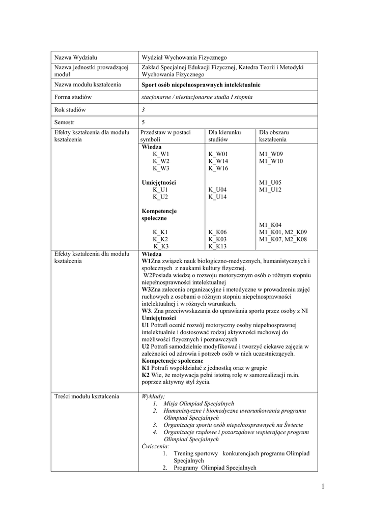 Nazwa Wydziału Wydział Wychowania Fizycznego Nazwa jednostki prowadzącej moduł Zakład Specjalnej Edukacji Fizycznej, Katedra Teorii i Metodyki Wychowania Fizycznego Nazwa modułu kształcenia Sport osób niepełnosprawnych intelektualnie Forma studiów stacjonarne / niestacjonarne studia I stopnia Rok studiów 3 Semestr 5 Efekty kształcenia dla modułu kształcenia Przedstaw w postaci symboli Wiedza K_W1 K_W2 K_W3 Umiejętności K_U1 K_U2 Dla kierunku studiów Dla obszaru kształcenia K_W01 K_W14 K_W16 M1_W09 M1_W10 K_U04 K_U14 M1_U05 M1_U12 Kompetencje społeczne Efekty kształcenia dla modułu kształcenia Treści modułu kształcenia M1_K04 K_K1 K_K06 M1_K01, M2_K09 K_K2 K_K03 M1_K07, M2_K08 K_K3 K_K13 Wiedza W1Zna związek nauk biologiczno-medycznych, humanistycznych i społecznych z naukami kultury fizycznej. W2Posiada wiedzę o rozwoju motorycznym osób o różnym stopniu niepełnosprawności intelektualnej W3Zna zalecenia organizacyjne i metodyczne w prowadzeniu zajęć ruchowych z osobami o różnym stopniu niepełnosprawności intelektualnej i w różnych warunkach. W3. Zna przeciwwskazania do uprawiania sportu przez osoby z NI Umiejętności U1 Potrafi ocenić rozwój motoryczny osoby niepełnosprawnej intelektualnie i dostosować rodzaj aktywności ruchowej do możliwości fizycznych i poznawczych U2 Potrafi samodzielnie modyfikować i tworzyć ciekawe zajęcia w zależności od zdrowia i potrzeb osób w nich uczestniczących. Kompetencje społeczne K1 Potrafi współdziałać z jednostką oraz w grupie K2 Wie, że motywacja pełni istotną rolę w samorealizacji m.in. poprzez aktywny styl życia. Wykłady; 1. Misja Olimpiad Specjalnych 2. Humanistyczne i biomedyczne uwarunkowania programu Olimpiad Specjalnych 3. Organizacja sportu osób niepełnosprawnych na Świecie 4. Organizacje rządowe i pozarządowe wspierające program Olimpiad Specjalnych Ćwiczenia: 1. Trening sportowy konkurencjach programu Olimpiad Specjalnych 2. Programy Olimpiad Specjalnych 1 3. Sport zunifikowany Stosowane metody dydaktyczne objaśnienie, pokaz, opis, praca ze źródłem drukowanym Metody sprawdzania i kryteria oceny efektów kształcenia uzyskanych przez studentów Metoda podsumowująca - pisemne opracowanie i przeprowadzenie wybranej formy zajęć ruchowych dla określonej grupy osób starszych lub niepełnosprawnych ze szczególnym uwzględnieniem ich warunków zdrowotnych i sprawnościowych. Forma i warunki zaliczenia modułu, w tym zasady dopuszczenia do egzaminu, zaliczenia, a także forma i warunki zaliczenia poszczególnych zajęć wchodzących w zakres danego modułu Sposób realizacji Język kształcenia Typ modułu kształcenia (obowiązkowy/fakultatywny) Wymagania wstępne i dodatkowe Rodzaj i liczba godzin zajęć dydaktycznych wymagających bezpośredniego udziału nauczyciela akademickiego i studentów, gdy w danym module przewidziane są takie zajęcia Liczba punktów ECTS przypisana modułowi Bilans punktów ECTS Kryteria Kryteria oceny efektów kształcenia na ocenę dst: ma elementarną wiedzę dotyczącą treści zrealizowanych na ćwiczeniach ma podstawowe poczucie odpowiedzialności i etyki Warunkiem dopuszczenia do zaliczenia przedmiotu jest aktywne uczestnictwo w ćwiczeniach. Zaliczenie uzyskuje student, który: - czynnie uczestniczył w ćwiczeniach, - pisemnie opracował i przeprowadził wybraną formę zajęć ruchowych dla określonej grupy Ocena bardzo dobra - student aktywnie uczestniczy we wszystkie zajęciach, jest zawsze do nich przygotowany oraz wykazuje duże zaangażowanie w ich organizację. Posiada pogłębioną wiedzę wymienioną w efektach kształcenia i potrafi logicznie łączyć ją z praktyką. Ocena dobra - aktywnie uczestniczy w zajęciach i wykazuje średnie zaangażowanie w ich organizację. Zna wszystkie zagadnienia teoretyczne, jednak ma trudności z ich praktyczną interpretacją. Ocena dostateczna - uczestniczy w zajęciach, zna zagadnienia teoretyczne w stopniu podstawowym lecz posiada znaczne braki w umiejętności praktycznego ich wykorzystania. Ocena niedostateczna - nie przestrzega ustalonych zasad uczestnictwa w zajęciach, nie wykazuje zaangażowania w czasie ćwiczeń - nie wykonał pracy podsumowującej, która jest sposobem sprawdzenia stopnia nabytej wiedzy. Zajęcia wymagające bezpośredniego udziału nauczyciela akademickiego i studentów. Polski Obowiązkowy Znajomość podstawowych form aktywności ruchowej oraz zmian reakcji organizmu na wysiłek fizyczny w ontogenezie człowieka Studia stacjonarne: Ćwiczenia: 26 godzin Studia niestacjonarne Ćwiczenia: 12 godzin 2 Studia stacjonarne: uczestnictwo w ćwiczeniach: 26 godzin przygotowanie do ćwiczeń: 2 godzin wyszukiwanie literatury: 4 godzin czytanie literatury: 5 godzin przygotowanie do kolokwiów cząstkowych: 5 godzin 2 przygotowanie do zaliczenia końcowego: 10 godzin Łączny nakład pracy studenta: 52 godziny, co odpowiada 2 punktom ECTS Studia niestacjonarne: uczestnictwo w ćwiczeniach: 12 godzin przygotowanie do ćwiczeń: 8 godzin wyszukiwanie literatury: 6 godzin czytanie literatury: 8 godzin przygotowanie do kolokwiów cząstkowych: 8 godzin przygotowanie do zaliczenia końcowego: 10 godzin Wykaz literatury podstawowej i uzupełniającej, obowiązującej do zaliczenia danego modułu Wymiar, zasady i forma odbywania praktyk, w przypadku, gdy program kształcenia przewiduje praktyki Łączny nakład pracy studenta: 52 godziny, co odpowiada 2 punktom ECTS Literatura podstawowa: Charles B., Corbin i wsp. Fitness i wellness. Kondycja, sprawność, zdrowie. Zysk i S-ka Wydawnictwo, Poznań 2007. Chrostek L., Łabaj M. Gry rekreacyjne – sport dla wszystkich. Zarząd Główny Towarzystwa Krzewienia Kultury Fizycznej, Warszawa 1982. Jasiak H., Jotan A. Leksykon sportu dla wszystkich. Krajowa Federacja Sportu dla wszystkich, Warszawa 1998. Kuński H. Trening zdrowotny osób starszych. Agencja Wydawnicza Medsport Press, Warszawa 2002. Skibicki Z. Marsze z kijkami. 