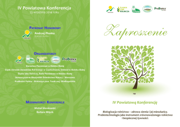 IV Powiatowa Konferencja 23 września 2014 roku Patronat Honorowy Andrzej Płonka Starosta Bielski Organizatorzy Starostwo Powiatowe w Bielsku-Białej Śląski Ośrodek Doradztwa Rolniczego w Częstochowie, Oddział w Bielsku-Białej Śląska Izba Rolnicza, Rada Powiatowa w Bielsku-Białej Stowarzyszenie EkosystEM-Dziedzictwo Natury - Warszawa ProBiotics Polska - Bratuszyn pow. Turek woj. Wielkopolskie Moderatorzy Konferencji IV Powiatową Konferencję Michał Morelowski Barbara Wójcik Biologizacja rolnictwa – zdrowa ziemia i jej mieszkańcy. Probiotechnologia jako instrument zrównoważonego rolnictwa i bezpiecznej żywności. Uprzejmie zapraszamy na IV Powiatową Konferencję P ro gram K o n f e re n c j i 900-945 Rejestracja uczestników 945-1000 Powitanie uczestników Konferencji przez organizatorów 1000-1030 Biologizacja warunkiem efektywnego rolnictwa i bezpiecznej żywności Stanisław Kolbusz - Prezes Stowarzyszenia EkosystEM-Dziedzictwo Natury Warszawa 10 -10 Jesienne prace w rolnictwie z zastosowaniem ProBio Emów™, zagospodarowanie resztek pożniwnych Kazimierz Zgoła - Dyrektor Regionalnego Centrum Mikroorganizmów w Lesznie 1050-1120 Zagrożenia zdrowia karpia dr Jan Żelazny - Państwowy Instytut Weterynarii PIB w Puławach 1120-1140 Stosowanie probiotycznych mikroorganizmów i ziół w chowie karpia dr Mirosław Cieśla - SGGW w Warszawie 1140-1200 ProBio Emy™ w szkółkach Paweł Karkocha - Gospodarstwo Szkółkarskie, Tomaszów Mazowiecki 1200-1215 Przerwa kawowa 1215-1235 Zastosowanie ProBio Emów™ w przechowalnictwie Jacek Jagieliński - Grupa Producentów Owoców ROJA Sp. z o.o., Regnów 1235-1255 Sady owocowe, doświadczenia z zastosowaniem ProBio Emów™ Arkadiusz Kartus - Gospodarstwo rolno-sadownicze Biała Rawska 1255-1325 Hodowla drobiu z wykorzystaniem ProBio Emów™ Kazimierz Kossakowski - Raduszyn k/Poznania 13 -13 Instytut Technologii Mikrobiologicznych (ITM), zaplecze badawczo-rozwojowe innowacyjnej biogospodarki dr Szymon Powałowski - Dyrektor Naukowy ITM w Turku 1345-1355 Doświadczenia ze stosowania Probio Emów™ w gospodarstwie rolnym Leszek Grzybowski – Janowice 1355-1405 Doświadczenia ze stosowania ProBio Emów™ w gospodarstwie warzywnym Andrzej Grygierzec – Janowice 1405-1430 Zdrowa Gleba, zdrowa roślina, łatwa ochrona – bezpieczeństwo żywności Sławomir Gacka - ProBiotics Polska, Bratuszyn 1430-1500 Podsumowanie, pytania i zamknięcie Konferencji 1500- Poczęstunek 30 „Biologizacja rolnictwa – zdrowa ziemia i jej mieszkańcy. Probiotechnologia jako instrument zrównoważonego rolnictwa i bezpiecznej żywności” 23 września 2014 roku godzina 10:00 Sala Sesyjna Starostwa Powiatowego w Bielsku Białej (parter) ul. Piastowska 40, 43-300 Bielsko-Biała Przyjmowanie zgłoszeń na konferencję i informacje na temat programu: Barbara Wójcik tel. kom.: 515 075 851 mail: [email protected] Maria Siąkałą tel. (33) 814 45 41 Starostwo Powiatowe tel. (33) 813 68 10 Zgłoszenia przyjmujemy do dnia 20.09.2014 roku 25 50 45