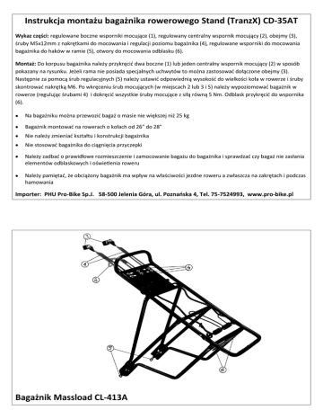 Instrukcja montażu bagażnika rowerowego Stand (TranzX) CD-35AT Wykaz części: regulowane boczne wsporniki mocujące (1), regulowany centralny wspornik mocujący (2), obejmy (3), śruby M5x12mm z nakrętkami do mocowania i regulacji poziomu bagażnika (4), regulowane wsporniki do mocowania bagażnika do haków w ramie (5), otwory do mocowania odblasku (6). Montaż: Do korpusu bagażnika należy przykręcić dwa boczne (1) lub jeden centralny wspornik mocujący (2) w sposób pokazany na rysunku. Jeżeli rama nie posiada specjalnych uchwytów to można zastosować dołączone obejmy (3). Następnie za pomocą śrub regulacyjnych (5) należy ustawić odpowiednią wysokość do wielkości koła w rowerze i śruby skontrować nakrętką M6. Po wkręceniu śrub mocujących (w miejscach 2 lub 3 i 5) należy wypoziomować bagażnik w rowerze (regulując śrubami 4) i dokręcić wszystkie śruby mocujące z siłą równą 5 Nm. Odblask przykręcić do wspornika (6). Na bagażniku można przewozić bagaż o masie nie większej niż 25 kg Bagażnik montować na rowerach o kołach od 26” do 28” Nie należy zmieniać kształtu i konstrukcji bagażnika Nie stosować bagażnika do ciągnięcia przyczepki Należy zadbać o prawidłowe rozmieszczenie i zamocowanie bagażu do bagażnika i sprawdzać czy bagaż nie zasłania elementów odblaskowych i oświetlenia roweru Należy pamiętać, że obciążony bagażnik ma wpływ na właściwości jezdne roweru a zwłaszcza na zakrętach i podczas hamowania Importer: PHU Pro-Bike Sp.J. 58-500 Jelenia Góra, ul. Poznańska 4, Tel. 75-7524993, www.pro-bike.pl Bagażnik Massload CL-413A