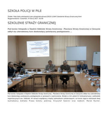 SZKOŁA POLICJI W PILE Źródło: http://pila.szkolapolicji.gov.pl/spp/aktualnosci/2010-1/1647,Szkolenie-Strazy-Granicznej.html Wygenerowano: Czwartek, 9 marca 2017, 02:05 SZKOLENIE STRAŻY GRANICZNEJ Pod koniec listopada w Śląskim Oddziale Straży Granicznej - Placówce Straży Granicznej w Cieszynie odbył się czterodniowy kurs doskonalący poświęcony postępowaniu ... Pod koniec listopada w Śląskim Oddziale Straży Granicznej - Placówce Straży Granicznej w Cieszynie odbył się czterodniowy kurs doskonalący poświęcony postępowaniu w sprawach o wykroczenia. Wzięło w nim udział 21 funkcjonariuszy z jednostek organizacyjnych ww. Oddziału. W ramach współpracy między jednostkami szkoleniowymi, na kursie zajęcia realizowali dwaj wykładowcy Zakładu Prawa Szkoły: podinsp. Krzysztof Sawicki oraz nadkom. Marek Rychel. Wspomniany kurs przeznaczony był dla funkcjonariuszy pionu operacyjno-śledczego oraz pionu cudzoziemców, którzy w bieżącej pracy prowadzą postępowania w sprawach o wykroczenia, a przede wszystkim występują lub mogą występować w charakterze oskarżyciela publicznego przed sądami rejonowymi. autor: Krzysztof Opaliński (03.12.10) Ocena: 0/5 (0) Tweetnij
