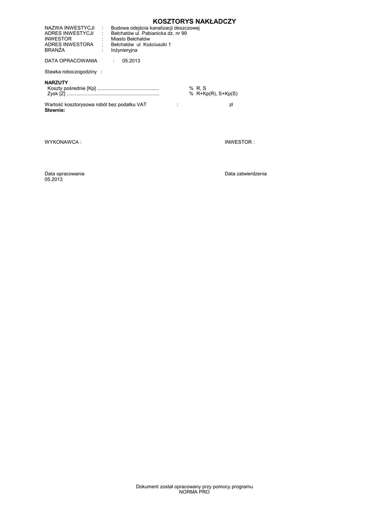KOSZTORYS NAKŁADCZY NAZWA INWESTYCJI ADRES INWESTYCJI INWESTOR ADRES INWESTORA BRANśA : : : : : DATA OPRACOWANIA Budowa odejścia kanalizacji deszczowej Bełchatów ul. Pabianicka dz. nr 99 Miasto Bełchatów Bełchatów ul Kościuszki 1 InŜynieryjna : 05.2013 Stawka roboczogodziny : NARZUTY Koszty pośrednie [Kp] ............................................ Zysk [Z] .................................................................. Wartość kosztorysowa robót bez podatku VAT Słownie: % R, S % R+Kp(R), S+Kp(S) : zł WYKONAWCA : INWESTOR : Data opracowania 05.2013 Data zatwierdzenia Dokument został opracowany przy pomocy programu NORMA PRO odejście kanalizacji deszczowej dla potrzeb działki nr 692-23 PRZEDMIAR i 692-22 w ul Pabianickiej w Bełchatowie Lp. Podstawa 1 1 KNNR 1 d.1 0111-01 2 KNNR 1 d.1 0202-07 3 KNNR 1 d.1 0208-02 4 KNNR 1 d.1 0307-04 5 KNNR 1 d.1 0313-01 6 KNNR 1 d.1 0318-03 7 KNNR 1 d.1 0214-03 8 KNNR 1 d.1 0501-01 2 9 KNNR 4 d.2 1411-02 10 KNNR 4 d.2 1308-03 11 KNNR 4 d.2 1417-02 12 KNNR 4 d.2 1427-01 13 KNNR 5 d.2 0705-01 Opis i wyliczenia ROBOTY ZIEMNE Roboty pomiarowe przy liniowych robotach ziemnych - trasa dróg w terenie równinnym. 0.012 j.m. km m3 Dodatek za kaŜdy rozp. 1 km transportu ziemi samochodami samowyładowczymi po drogach o nawierzchni utwardzonej(kat.gr. I-IV) Krotność = 4 29.645 m3 Wykopy liniowe o szerokości 0,8-2,5 m i głębokości do 3,0 m o ścianach pionowych w gruntach suchych kat. III-IV - wykop przy odkrywaniu istniejącej infrastruktury podziemnej, przyjęto 5% objętości wykopów mechanicznych 29.645*0.05 m3 m3 m3 m3 Pełne umocnienie ścian wykopów wraz z rozbiórką palami szalunkowymi stalo- m2 wymi (wypraskami) w gruntach suchych ; wyk.o szer.do 1 m i głęb.do 3.0 m; grunt kat. I-IV 59.29 m2 Zasypywanie wykopów o ścianach pionowych o szerokości 0.8-2.5 m i głęb.do m3 3.0 m w gr.kat. I-III - obsypka rur do wysokości 30 cm ponad wierzch rury, piaskiem dowiezionym z zewnątrz 5.67 m3 Zasypanie wykopów .fund.podłuŜnych,punktowych,rowów,wykopów obiektowych spycharkami z zagęszcz.mechanicznym zagęszczarkami (gr.warstwy w stanie luźnym 40 cm) - kat.gr. I-II 21.202 m3 Ręczne plantowanie powierzchni gruntu rodzimego kat.I-III m2 26 m2 m3 ROBOTY MONTAśOWE PodłoŜa pod kanały i obiekty z materiałów sypkich grub. 15 cm m3 1.089 m3 Kanały z rur PVC łączonych na wcisk o śr. zewn. 200 mm m 12.1 m Studzienki kanalizacyjne systemowe z PP o śr 425 mm - zamknięcie rurą te- szt leskopową 1 szt Przejście przez ściany komór " przy grubości ściany 20 cm - otwór o śr. 210 mm 1 szt UłoŜenie rur osłonowych z PCW o śr.do 140 mm m 3 m Norma PRO Wersja 4.36 Nr seryjny: 11928 Razem km Roboty ziemne wykonywane koparkami podsiębiernymi o poj.łyŜki 0.60 m3 w gr.kat. I-II z transp.urobku na odl.do 1 km sam.samowyład. 29.645 -2- Poszcz szt 0.012 RAZEM 0.012 29.645 RAZEM 29.645 29.645 RAZEM 29.645 1.482 RAZEM 1.482 59.290 RAZEM 59.290 5.670 RAZEM 5.670 21.202 RAZEM 21.202 26.000 RAZEM 26.000 1.089 RAZEM 1.089 12.100 RAZEM 12.100 1.000 RAZEM 1.000 1.000 RAZEM 1.000 3.000 RAZEM 3.000 odejście kanalizacji deszczowej dla potrzeb działki nr 692-23 i 692-22 w ul Pabianickiej w Bełchatowie Lp. Podstawa 1 1 KNNR 1 d.1 0111-01 1* 2* 3* Opis jm ROBOTY ZIEMNE Roboty pomiarowe przy liniowych robotach ziemnych - trasa dróg w terenie równinnym. przedmiar = 0.012 km Nakłady km -- R -robocizna 56r-g/km -- M -słupki drewniane iglaste śr. 70 mm dla dróg i wałów 0.11m3/km r-g 0.6720 m3 0.0013 -- S -samochód dostawczy m-g 1.5m-g/km Koszty pośrednie 63.4% od (R, S) Zysk 10.8% od (R+Kp(R), S+Kp(S)) 0.0180 Razem z narzutami: Cena jednostkowa: 2 KNNR 1 Roboty ziemne wykonywane koparkami podm3 d.1 0202-07 siębiernymi o poj.łyŜki 0.60 m3 w gr.kat. I-II z transp.urobku na odl.do 1 km sam.samowyład. przedmiar = 29.645 m3 1* 2* 3* -- R -robocizna 0.126r-g/m3 r-g -- S -koparka 0.60 m3 m-g 0.036m-g/m3 samochód samowyładowczy 5 t m-g 0.144m-g/m3 Koszty pośrednie 63.4% od (R, S) Zysk 10.8% od (R+Kp(R), S+Kp(S)) Razem z narzutami: Cena jednostkowa: 3 KNNR 1 Dodatek za kaŜdy rozp. 1 km transportu ziemi d.1 0208-02 samochodami samowyładowczymi po drogach o nawierzchni utwardzonej(kat.gr. I-IV) Krotność = 4 przedmiar = 29.645 m3 1* 3.7353 1.0672 4.2689 m3 -- S -samochód samowyładowczy 5 t m-g 0.029*4=0.116m-g/m3 Koszty pośrednie 63.4% od (R, S) Zysk 10.8% od (R+Kp(R), S+Kp(S)) 3.4388 Razem z narzutami: Cena jednostkowa: 4 KNNR 1 Wykopy liniowe o szerokości 0,8-2,5 m i głębo- m3 d.1 0307-04 kości do 3,0 m o ścianach pionowych w gruntach suchych kat. III-IV - wykop przy odkrywaniu istniejącej infrastruktury podziemnej, przyjęto 5% objętości wykopów mechanicznych przedmiar = 29.645*0.05 = 1.482 m3 1* -- R -robocizna 3r-g/m3 r-g 4.4460 Koszty pośrednie 63.4% od (R, S) Zysk 10.8% od (R+Kp(R), S+Kp(S)) Razem z narzutami: Cena jednostkowa: 5 KNNR 1 Pełne umocnienie ścian wykopów wraz z rozd.1 0313-01 biórką palami szalunkowymi stalowymi (wypraskami) w gruntach suchych ; wyk.o szer.do 1 m i głęb.do 3.0 m; grunt kat. I-IV przedmiar = 59.29 m2 1* -- R -robocizna 0.675r-g/m2 r-g -- M --3- Norma PRO Wersja 4.36 Nr seryjny: 11928 m2 40.0208 Koszt jedn. R M S odejście kanalizacji deszczowej dla potrzeb działki nr 692-23 i 692-22 w ul Pabianickiej w Bełchatowie Lp. 2* 3* 4* 5* 6* Podstawa Opis jm pale szalunkowe stalowe 0.68kg/m2 bale iglaste obrzynane nasycone gr.50-64 mm kl.III 0.00105m3/m2 drewno iglaste, okrągłe nasycone na stemple 0.0009m3/m2 klamry ciesielskie 0.12kg/m2 materiały pomocnicze 1%(od M) Koszty pośrednie 63.4% od (R, S) Zysk 10.8% od (R+Kp(R), S+Kp(S)) kg 40.3172 m3 0.0623 m3 0.0534 kg 7.1148 % 1.0000 Razem z narzutami: Cena jednostkowa: 6 KNNR 1 Zasypywanie wykopów o ścianach pionowych d.1 0318-03 o szerokości 0.8-2.5 m i głęb.do 3.0 m w gr.kat. I-III - obsypka rur do wysokości 30 cm ponad wierzch rury, piaskiem dowiezionym z zewnątrz przedmiar = 5.67 m3 1* 2* -- R -robocizna 1.1r-g/m3 Nak