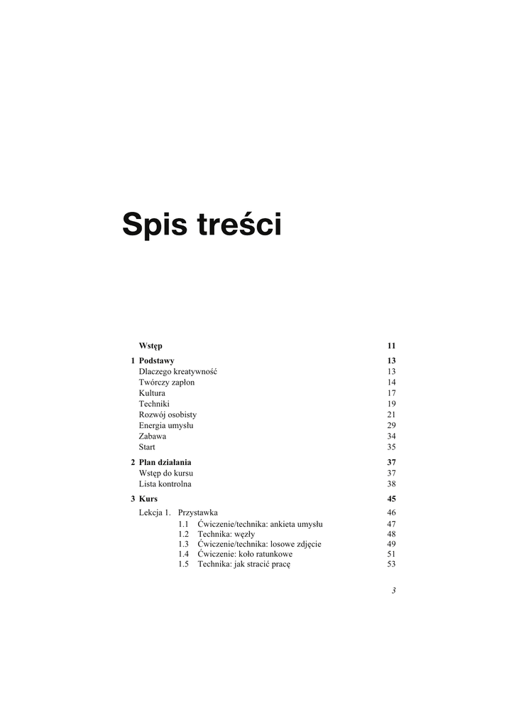 Wstęp 11 1 Podstawy Dlaczego kreatywność Twórczy zapłon Kultura Techniki Rozwój osobisty Energia umysłu Zabawa Start 13 13 14 17 19 21 29 34 35 3 Kurs 45 2 Plan działania Wstęp do kursu Lista kontrolna Lekcja 1. Przystawka 1.1 Ćwiczenie/technika: ankieta umysłu 1.2 Technika: węzły 1.3 Ćwiczenie/technika: losowe zdjęcie 1.4 Ćwiczenie: koło ratunkowe 1.5 Technika: jak stracić pracę 37 37 38 46 47 48 49 51 53 3 Spis treści Lekcja 2. Poznawanie siebie — rozluźnianie nowej grupy 2.1 Technika: oto mój przyjaciel 2.2 Technika: WieŜa Babel 2.3 Ćwiczenie: zagadki 2.4 Technika: podąŜaj za liderem 2.5 Technika: prawda i fałsz 55 56 57 58 59 61 Lekcja 4. PodwaŜanie załoŜeń — zmiana podejścia do problemu w celu lepszego zrozumienia jego istoty 4.1 Ćwiczenie/technika: nic nie rób 4.2 Technika: perspektywy 4.3 Ćwiczenie: dookoła świata 4.4 Technika: skrawki czasu 4.5 Ćwiczenie: kwestionuj wszystko 73 74 76 78 80 81 Lekcja 3. Wyjaśnianie problemu — co masz zamiar zrobić? 3.1 Ćwiczenie/technika: kompas 3.2 Technika: mapa przeszkód 3.3 Ćwiczenie: woda w wino 3.4 Technika: cel 3.5 Ćwiczenie/technika: partie i przerwy Lekcja 5. Dobre wibracje — pozytywne myślenie 5.1 Ćwiczenie/technika: zmienione stany 5.2 Technika: tak! 5.3 Technika: krąg energii 5.4 Ćwiczenie: turniej barowy 5.5 Technika: podnieś mnie Lekcja 6. Definiowanie problemu — róŜne przekroje 6.1 Ćwiczenie/technika: perfekcja 6.2 Technika: przekształcenie 6.3 Ćwiczenie/technika: uniwersalne wieszaki 6.4 Technika: kąpiel w błocie 6.5 Ćwiczenie: jazda w dół Lekcja 7. Przyrost kreatywności — techniki stopniowych zmian 7.1 Ćwiczenie/technika: łańcuch poziomów 7.2 Ćwiczenie/technika: samochód i kozy 7.3 Technika: atrybuty 7.4 Ćwiczenie/technika: znaleziona historia 7.5 Ćwiczenie/technika: techniczna twórczość 4 62 63 65 67 69 71 82 83 85 86 88 89 90 91 93 94 96 97 99 100 102 104 106 108 Spis treści Lekcja 8. Zniekształcenie — techniki generacji pomysłów modyfikujące istotę problemu 8.1 Technika: kwestionowanie załoŜeń 8.2 Ćwiczenie/technika: zniekształcenie 8.3 Ćwiczenie: urodzinowa bonanza 8.4 Technika: odwrócenie 8.5 Technika: liczy się rozmiar 110 111 113 115 116 118 Lekcja 10. Szukanie wiedzy — budowa osobistej bazy wiedzy pokarmem dla kreatywności 10.1 Technika: zdarta płyta kompaktowa 10.2 Ćwiczenie: wraŜenie i wraŜliwość 10.3 Ćwiczenie/technika: mała czarna ksiąŜeczka 10.4 Ćwiczenie: wszystko, co się świeci 10.5 Ćwiczenie: zaprogramowana myśl 127 128 130 131 133 135 Lekcja 12. Gwałtowny impuls — przypadkowe bodźce dla nowego punktu wyjścia 12.1 Technika: losowe słowo 12.2 Ćwiczenie/technika: ciekawa strona 12.3 Technika: znalezione przedmioty 12.4 Technika: cytaty 12.5 Ćwiczenie: doskonały błąd 147 148 149 151 153 155 Lekcja 9. Czysta energia — zastrzyk mocy 9.1 Technika: łyŜeczka i sznurek 9.2 Technika: na barana 9.3 Ćwiczenie: zdobądź inne Ŝycie 9.4 Technika: usiądź mi na kolanie 9.5 Technika: wyścig spinaczy Lekcja 11. Postrzeganie rozwiązań z innej perspektywy 11.1 Technika: fantazja 11.2 Technika: cudzy punkt widzenia 11.3 Ćwiczenie: śmiech to zdrowie 11.4 Technika: metafora 11.5 Ćwiczenie: nie ma czasu na czytanie Lekcja 13. Poszukiwanie na innym obszarze — wyjście poza to, co oczywiste 13.1 Technika: kradzieŜ 13.2 Ćwiczenie/technika: wgląd do wewnątrz 13.3 Technika: zły dŜin 13.4 Ćwiczenie: szkolne odurzenie 13.5 Technika: morfologia 120 121 123 124 125 126 137 138 140 142 143 145 156 157 158 160 161 162 5 Spis treści Lekcja 14. Czysta zabawa — rozweselacze 14.1 Technika: rząd oczu 14.2 Technika: jestem i znam 14.3 Technika: przeróbka 14.4 Technika: wyścig z przeszkodami 14.5 Technika: olbrzymy, czarownice i krasnoludy Lekcja 15. Podział — techniki, które dzielą problem na części składowe 15.1 Technika: składniki 15.2 Technika: substytut 15.3 Ćwiczenie: odmienne poglądy 15.4 Technika: to juŜ było 15.5 Ćwiczenie/technika: długi podział Lekcja 16. WraŜliwość — generowanie pomysłów przy uŜyciu stymulacji prawej części mózgu 16.1 Ćwiczenie/technika: zgraj się z muzyką 16.2 Ćwiczenie/technika: bazgroły Leonarda da Vinci 16.3 Technika: dotknij mnie, poczuj mnie 16.4 Technika: rysunek 16.5 Technika: karmnik Lekcja 17. Naturalny wkład — wykorzystanie zdobyczy natury i nauki jako narzędzi do generowania pomysłów 17.1 Technika: granice 17.2 Ćwiczenie: przekrój liścia 17.3 Technika: ciotka grawitacja 17.4 Ćwiczenie: dreszczyk emocji 17.5 Technika: to naturalne Lekcja 18. Tak powstają wspomnienia — techniki pamięciowe 18.1 Technika: skrajności 18.2 Technika: łańcuchy historii 18.3 Technika: notki i nutki 18.4 Ćwiczenie/technika: liczbowe rymowanki 18.5 Ćwiczenie: hart ducha Lekcja 19. Dziwne interpretacje — jak zamienić nieporozumienie w pomysł 19.1 Technika: to głupie 19.2 Ćwiczenie: płaszcz i szpada 19.3 Technika: między słowami 19.4 Technika: oni prowadzą 19.5 Ćwiczenie: karuzela wiedzy 6 163 164 165 166 168 170 171 172 174 175 177 179 181 182 184 186 188 189 190 191 192 194 196 198 199 200 202 204 205 207 208 209 211 213 215 217 Spis treści Lekcja 20. Twórcza komunikacja — bodźce dla nowych perspektyw pochodzące z wymuszania róŜnych sposobów komunikacji 20.1 Technika: w ciemnościach 20.2 Technika: końcowe odliczanie 20.3 Technika: kup mnie 20.4 Technika: urodziny na ślepo 20.5 Technika: klocki Lego Lekcja 21. W zgodzie z naturą — kreatywność stymulowana technikami związanymi ze środowiskiem 21.1 Ćwiczenie/technika: coś zupełnie innego 21.2 Technika: podświadoma kreatywność 21.3 Ćwiczenie/technika: galeria sztuki 21.4 Technika: teoria gry 21.5 Technika: migawki Lekcja 22. Myślenie przestrzenne — grupowe sesje na temat wykorzystywania prawej części mózgu 22.1 Ćwiczenie/technika: magiczny tunel 22.2 Technika: kajdanki 22.3 Ćwiczenie: szybki rysunek 22.4 Technika: wieŜa 22.5 Technika: szybowanie 21