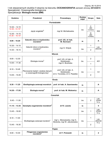 Gdynia, 06.10.2014 I rok stacjonarnych studiów II stopnia na kierunku OCEANOGRAFIA semestr zimowy 2014/2015 Specjalność: Oceanografia biologiczna Specjalizacja: Biologia morza (BM) Godzina Prowadzący Przedmiot Rodzaj zajęć Grupa Sala Poniedziałek C 10.30 – 12.15 12.30 –14.15* Język angielski 6 mgr M. Michałowska ćw. 10.30 – 14.15 14.30 – 18.15 502 D 12.30 – 14.15 14.30 – 16.15* 8.00 – 10.20 (BM +CHMiA) (BM +CHMiA) Gatunki obce w środowisku 2 morskim prof. UG, dr hab. M. Normant A w. 1 Gatunki obce w środowisku 2* morskim mgr D. Wójcik ćw. 2 Lab. ZEEOM Wtorek 8.00 – 12.30 13.00 – 17.30 8.10 – 10.45 Ekologia morza prof. UG, dr hab. A. Sokołowski, mgr D. Brulińska 3 Planowanie badań i analiza danych w oceanografii biologicznej I 13.05 – 15.40 prof. UG, dr hab. A. Sokołowski, dr A. Toruńska, dr A. Pawelec 2 ćw. 401 1 1 ćw. 101 2 Środa 8.30 – 11.25 Ekofizjologia zwierząt morskich 14.30 – 17.05 Ekologia morza 3 prof. dr hab. A. Szaniawska w. A prof. dr hab. M. Wołowicz w. A Czwartek 8.45 – 11.00 11.15 – 13.35 ćw. Genetyka organizmów morskich 4 dr R. Lasota 13.45 – 16.00 2 w. ćw. 8.10 – 11.00 9 1 1 Ekofizjologia zwierząt morskich 1 mgr L. Marszewska, mgr A. Borecka, mgr M. Jakubowska ćw. 13.45 – 16.35 Lab. ZFEM IV p. Lab. ZFEM IV p. Lab. ZEEOM IV p. 2 Piątek 8.00 – 10.30 Filogeneza organizmów 5 morskich dr F. Pniewski w. 2 10.45 – 13.45 Filogeneza organizmów morskich 5 dr F. Pniewski 1 Lab. ZFEM 5 VI p., 14.00 – 17.00 Filogeneza organizmów morskich dr F. Pniewski 2 101 1). Ekofizjologia zwierząt morskich - terminy ćwiczeń: 09.10., 16.10., 23.10., 30.10., 06.11., 13.11., 20.11., 27.11. 2). Gatunki obce w środowisku morskim* – terminy wykładów: 08.12., 15.12., 22.12., 12.01., 19.01., terminy ćwiczeń: 22.12.br., 12.01.2015, 19.01.2015, w dniach kiedy odbywają się ćwiczenia, zajęcia z j. angielskiego zostały zaplanowane w godz. 12.30 –14.15* (gr. C), 14.30 – 16.15* (gr. D). 3). Ekologia morza – terminy wykładów: 15.10, 22.10., 29.10., 05.11., 19.11., 26.11., 03.12., 17.12., 07.01., 21.01., terminy ćwiczeń: 07.10., 14.10., 21.10., 28.10., 04.11., 18.11., 25.11., 02.12. 4). Genetyka organizmów morskich – terminy ćwiczeń: 09.10., 16.10., 23.10., 30.10., 06.11. 5). Filogeneza organizmów morskich – terminy wykładów: 10.10., 17.10., 24.10., 31.10., 07.11., 14.11., 21.11., 28.11., terminy i miejsca ćwiczeń: 10.10., 17.10 w lab. PERM VI p.IO UG, kolejne (24.10., 31.10., 07.11.) w sali 101 w budynku Głównym WOiG 6). Język angielski – w dniach 22.12.br., 12.01.2015, 19.01.2015, zajęcia z j. angielskiego zostały zaplanowane w godz. 12.30 –14.15* (gr. C), 14.30 – 16.15* (gr. D). ćw. UWAGA! Seminaria rozpoczną się od listopada br. 208S – budynek Zakładu Biologii i Ekologii Morza IO UG 401, 101, 505 – budynek Dziekanatu Wydziału OiG Auditorium oceanographorum AO - budynek Instytutu Oceanografii 2e, 2d, 114 - sale Zakładu Geologii Morza IO UG 697 - sala Zakładu Oceanografii Fizycznej IO UG A, B, 2, 9 - sale w pawilonie 505 – sala w budynku WOiG UG Gdynia, 17.10.2014 I rok stacjonarnych studiów II stopnia na kierunku OCEANOGRAFIA semestr zimowy 2014/2015 Specjalność: Oceanografia geologiczno-chemiczno-fizyczna Specjalizacja: Geologia morza (GM) Godzina Prowadzący Przedmiot Rodzaj zajęć Grupa Sala 2 2e Poniedziałek 8.30 – 10.15 10.30 – 12.15 12.30 – 14.15 10.30 – 12.15 12.30 – 14.15 Seminarium prof. UG, dr hab. M. Witak Meteorologia morska dr M. Marosz Geologia osadów Morza Bałtyckiego dr M. Rucińska-Zjadacz 3 ćw. 2 1 2 504 114 Wtorek 2 8.15 – 10.30 Seminarium 10.40 – 13.15 Zastosowanie programów komputerowych w geologii morza prof. UG, dr hab. M. Witak 1 2e ćw. dr T. Ciborowski 1 2d Środa 8.00 – 10.00 Bezinwazyjne metody badania dna morskiego 14.00 – 15.45 Bezinwazyjne metody 1 badania dna morskiego prof. UG, dr hab. J. Tęgowski mgr Ł. Janowski w. ćw. 2 1 2 9 Czwartek 7.45 – 10.00 Geologia osadów Morza 3 Bałtyckiego dr M. Rucińska-Zjadacz w. 23 10.10 – 11.00 Meteorologia morska dr A. Herman w. A 11.10 – 12.50 Planowanie badań i analiza danych prof. UG, dr hab. B. Graca w. A Piątek 9.15 – 11.00 13.30 – 15.15 11.10 – 13.20 9.15 – 11.00 Język angielski mgr M. Michałowska ćw. Zastosowanie programów komputerowych w geologii morza dr T. Ciborowski ćw. Zarządzanie strefą brzegową morza dr R. Wróblewski ćw. A B 2 2 502 2d 2e 11.15 – 13.00 1 . 1) Bezinwazyjne metody badania dna morskiego – ćwiczenia odbywają się co dwa tygodnie dla każdej z grup. 2) Seminarium – dla grupy 1 zaplanowano na 10 tyg. w następujących dniach: 14.10., 21.10., 28.10., 18.11., 25.11., 09.12., 16.12., 23.12., 13.01., 20.01. 3) Geologia osadów Morza Bałtyckiego – wykład zaplanowano do 18.12.br. Auditorium oceanographorum AO - budynek Instytutu Oceanografii 2e, 2d, 114 - sale Zakładu Geologii Morza IO UG 697 - sala Zakładu Oceanografii Fizycznej IO UG A, B, 2, 9 - sale w pawilonie 505 – sala w budynku WOiG UG Gdynia, 06.10.2014 I rok stacjonarnych studiów II stopnia na kierunku OCEANOGRAFIA semestr zimowy 2014/2015 Specjalność: Oceanografia geologiczno-chemiczno-fizyczna Specjalizacja: Chemia morza i atmosfery (ChMiA) Godzina Prowadzący Przedmiot Rodzaj zajęć Grupa Sala 1 504 Poniedziałek 8.30 – 10.15 10.30 – 12.15 12.30 –14.15* 12.30 – 14.15 14.30 – 16.15* Meteorologia morska Język angielski 1 dr M. Marosz mgr M. Michałowska ćw. C 502 D Wtorek 10.30 – 13.05 Aerozole i gazy w atmosferze prof. UG, dr hab. A. Lewandowska ćw. 1 3b i lab. ZCHMiO ŚM Środa 8.00 – 10.00 Bezinwazyjne metody badania dna morskiego prof. UG, dr hab. J. Tęgowski w. 2 10.40 – 12.05 Aerozole i gazy w atmosferze prof. dr hab. L. Falkowska w. AO 12.20 – 14.05 Seminarium prof. dr hab. J. Bolałek ćw. 1 3a Czwartek 7.45 – 10.00 Geologia osadów Morza 2 Bałtyckiego dr M. Rucińska-Zjadacz w. 23 10.10 – 11.00 Meteorologia morska dr A