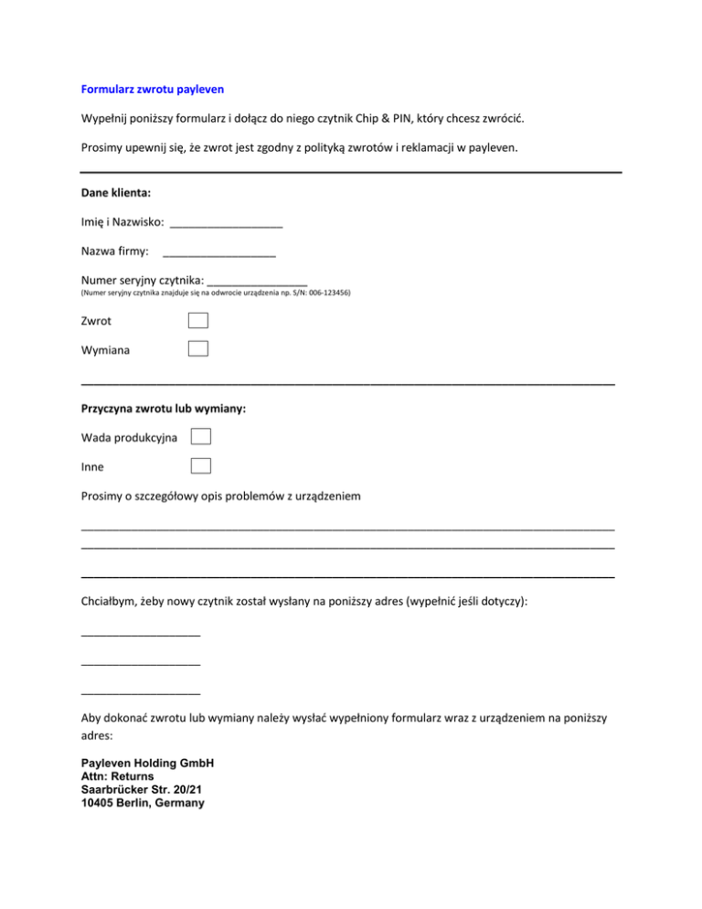 Formularz zwrotu payleven Wypełnij poniższy formularz i dołącz do niego czytnik Chip & PIN, który chcesz zwrócić. Prosimy upewnij się, że zwrot jest zgodny z polityką zwrotów i reklamacji w payleven. Dane klienta: Imię i Nazwisko: __________________ Nazwa firmy: __________________ Numer seryjny czytnika: ________________ (Numer seryjny czytnika znajduje się na odwrocie urządzenia np. S/N: 006-123456) Zwrot Wymiana _____________________________________________________________________________________ Przyczyna zwrotu lub wymiany: Wada produkcyjna Inne Prosimy o szczegółowy opis problemów z urządzeniem _____________________________________________________________________________________ _____________________________________________________________________________________ _____________________________________________________________________________________ Chciałbym, żeby nowy czytnik został wysłany na poniższy adres (wypełnić jeśli dotyczy): ___________________ ___________________ ___________________ Aby dokonać zwrotu lub wymiany należy wysłać wypełniony formularz wraz z urządzeniem na poniższy adres: Payleven Holding GmbH Attn: Returns Saarbrücker Str. 20/21 10405 Berlin, Germany