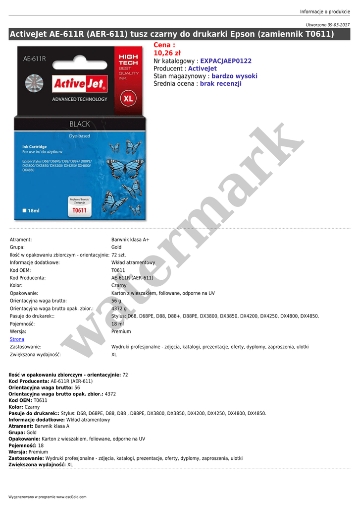 Informacje o produkcie Utworzono 09-03-2017 ActiveJet AE-611R (AER-611) tusz czarny do drukarki Epson (zamiennik T0611) Cena : 10,26 zł Atrament: er m ar k Nr katalogowy : EXPACJAEP0122 Producent : ActiveJet Stan magazynowy : bardzo wysoki Średnia ocena : brak recenzji Barwnik klasa A+ Grupa: Gold Ilość w opakowaniu zbiorczym - orientacyjnie: 72 szt. Informacje dodatkowe: Kod OEM: Wkład atramentowy T0611 Kod Producenta: AE-611R (AER-611) Czarny Opakowanie: Karton z wieszakiem, foliowane, odporne na UV at Kolor: Orientacyjna waga brutto: 56 g Orientacyjna waga brutto opak. zbior.: 4372 g Pasuje do drukarek:: Stylus: D68, D68PE, D88, D88+, D88PE, DX3800, DX3850, DX4200, DX4250, DX4800, DX4850. Wersja: Strona w Pojemność: 18 ml Premium Zastosowanie: Wydruki profesjonalne - zdjęcia, katalogi, prezentacje, oferty, dyplomy, zaproszenia, ulotki Zwiększona wydajność: XL Ilość w opakowaniu zbiorczym - orientacyjnie: 72 Kod Producenta: AE-611R (AER-611) Orientacyjna waga brutto: 56 Orientacyjna waga brutto opak. zbior.: 4372 Kod OEM: T0611 Kolor: Czarny Pasuje do drukarek:: Stylus: D68, D68PE, D88, D88 , D88PE, DX3800, DX3850, DX4200, DX4250, DX4800, DX4850. Informacje dodatkowe: Wkład atramentowy Atrament: Barwnik klasa A Grupa: Gold Opakowanie: Karton z wieszakiem, foliowane, odporne na UV Pojemność: 18 Wersja: Premium Zastosowanie: Wydruki profesjonalne - zdjęcia, katalogi, prezentacje, oferty, dyplomy, zaproszenia, ulotki Zwiększona wydajność: XL Wygenerowano w programie www.oscGold.com