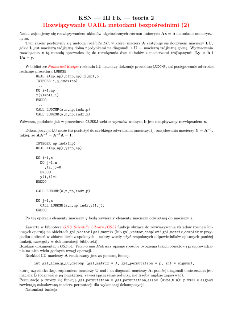 KSN — III FK — teoria 2 Rozwiązywanie UARL metodami bezpośrednimi (2) Nadal zajmujemy się rozwiązywaniem układów algebraicznych równań liniowych Ax = b metodami numerycznymi. Tym razem posłużymy się metodą rozkładu LU, w której macierz A zastępuje się iloczynem macierzy LU, gdzie L jest macierzą trójkątną dolną z jedynkami na diagonali, a U — macierzą trójkątną górną. Wyznaczenia rozwiązania x tą metodą sprowadza się do rozwiązania dwu układów z macierzami trójkątnymi: Ly = b i Ux = y. W bibliotece Numerical Recipes rozkładu LU macierzy dokonuje procedura LUDCMP, zaś postępowanie odwrotne realizuje procedura LUBKSB: REAL a(np,np),b(np,np),x(np),p INTEGER i,j,indx(np) ... DO i=1,np x(i)=b(i,1) ENDDO ... CALL LUDCMP(a,n,np,indx,p) CALL LUBKSB(a,n,np,indx,x) Wówczas, podobnie jak w procedurze GAUSSJ wektor wyrazów wolnych b jest nadpisywany rozwiązaniem x. Dekompozycja LU może też posłużyć do szybkiego odwracania macierzy, tj. znajdowania macierzy Y = A−1 , takiej, że AA−1 = A−1 A = 1: INTEGER np,indx(np) REAL a(np,np),y(np,np) DO i=1,n DO j=1,n y(i,j)=0. ENDDO y(i,i)=1. ENDDO CALL LUDCMP(a,n,np,indx,p) DO j=1,n CALL LUBKSB(a,n,np,indx,y(1,j)) ENDDO Po tej operacji elementy macierzy y będą zawierały elementy macierzy odwrotnej do macierzy a. Zawarte w bibliotece GNU Scientific Library (GSL) funkcje służące do rozwiązywania układów równań liniowych operują na obiektach gsl vector i gsl matrix (lub gsl vector complex i gsl matrix complex w przypadku obliczeń w zbiorze liczb zespolonych – należy wtedy użyć zespolonych odpowiedników opisanych poniżej funkcji, szczegóły w dokumentacji biblioteki). Rozdział dokumentacji GSL pt. Vectors and Matrices opisuje sposoby tworzenia takich obiektów i przeprowadzania na nich wielu godnych uwagi operacji. Rozkład LU macierzy A realizowany jest za pomocą funkcji int gsl_linalg_LU_decomp (gsl_matrix * A, gsl_permutation * p, int * signum), której użycie skutkuje zapisaniem macierzy U nad i na diagonali macierzy A; poniżej diagonali umieszczana jest macierz L (oczywiście jej przekątnej, zawierającej same jedynki, nie trzeba nigdzie zapisywać). Permutację p tworzy się funkcją gsl permutation * gsl permutation alloc (size t n); p wraz z signum zawierają zakodowaną macierz permutacji dla wykonanej dekompozycji. Natomiast funkcja int gsl_linalg_LU_solve (const gsl_matrix * LU, const gsl_permutation * p, const gsl_vector * b, gsl_vector * x) rozwiązuje układ Ax = b wykorzystując rozkład LU macierzy A na (LU, p), wyznaczone wcześniej za pomocą gsl linalg LU decomp. Wynik umieszczany jest w x. Krzysztof Malarz & Maciej Wołoszyn, Kraków, 21 października 2004 2