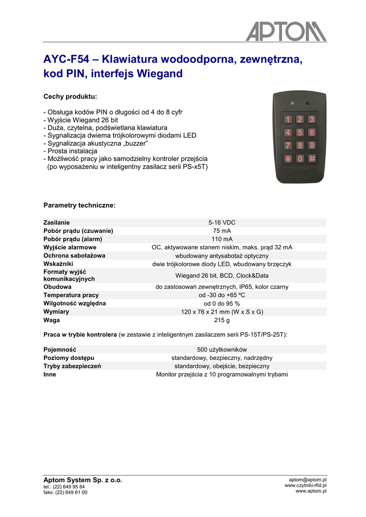 AYC-F54 – Klawiatura wodoodporna, zewnętrzna, kod PIN, interfejs Wiegand Cechy produktu: - Obsługa kodów PIN o długości od 4 do 8 cyfr - Wyjście Wiegand 26 bit - Duża, czytelna, podświetlana klawiatura - Sygnalizacja dwiema trójkolorowymi diodami LED - Sygnalizacja akustyczna „buzzer” - Prosta instalacja - Możliwość pracy jako samodzielny kontroler przejścia (po wyposażeniu w inteligentny zasilacz serii PS-x5T) Parametry techniczne: Zasilanie Pobór prądu (czuwanie) Pobór prądu (alarm) Wyjście alarmowe Ochrona sabotażowa Wskaźniki Formaty wyjść komunikacyjnych Obudowa Temperatura pracy Wilgotność względna Wymiary Waga 5-16 VDC 75 mA 110 mA OC, aktywowane stanem niskim, maks. prąd 32 mA wbudowany antysabotaż optyczny dwie trójkolorowe diody LED, wbudowany brzęczyk Wiegand 26 bit, BCD, Clock&Data do zastosowań zewnętrznych, IP65, kolor czarny od -30 do +65 ºC od 0 do 95 % 120 x 76 x 21 mm (W x S x G) 215 g Praca w trybie kontrolera (w zestawie z inteligentnym zasilaczem serii PS-15T/PS-25T): Pojemność Poziomy dostępu Tryby zabezpieczeń Inne Aptom System Sp. z o.o. tel.: (22) 649 95 84 faks: (22) 649 61 00 500 użytkowników standardowy, bezpieczny, nadrzędny standardowy, obejście, bezpieczny Monitor przejścia z 10 programowalnymi trybami [email protected] www.czytniki-rfid.pl www.aptom.pl