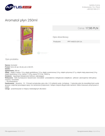 Apteka Avena Królewiecka 12c, Płock +48 502 666 011 Aromatol płyn 250ml Cena: 17,95 PLN Opis słownikowy Producent PPF HASCO-LEK S.A. Opis produktu Nazwa: Aromatol Postać: konc.do sp.r.do pł.j.ust.,n/sk/inh. Dawka: Opakowanie: 250 ml Skład: - olejek z melisy 1,0 g- olejek goździkowy 1,0 g- olejek cynamonowy 2,4 g- olejek cytrynowy 5,7 g- olejek mięty pieprzowej 2,4 golejek lawendowy 2,4 g- mentol 17,23 g- etanol 70 % do 1000,0 g Działanie: - łagodzące dolegliwości bólowe- odprężąjące Wskazania: - bóle reumatyczne- bezsenność- nerwobóle - przeziębienia- dolegliwości żołądkowo - jelitowe- zab.krążenia- bóle głowymigreny- nerwobóle : - nie stwierdzono Dawkowanie: - doustnie - 10 - 15 kropli na łyżeczkę cukru lub z 1/2 szklanki wody- inchalacje - 1 łyżeczkę wlać do niewielkiej ilości wody gorącej i wdychać powstające opary- do nacierania (miejscowo) - bolące miejsca długotrwale nacierać i lekko masować utrzymywać w cieple Uwagi: - przechowywać w miejscu niedostępnym dla dzieci Plik wygenerowano: 09-03-2017 Powered by TCPDF (www.tcpdf.org) Oprogramowanie sklepu: AptusShop