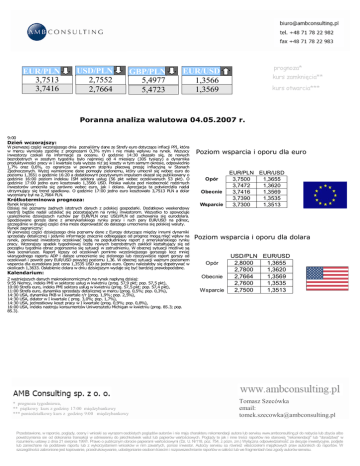 EUR/PLN 3,7513 3,7416 USD/PLN 2,7552 2,7664 GBP/PLN 5,4977 5,4723 prognoza* EUR/USD 1,3566 1,3569 kurs zamknięcia** kurs otwarcia*** Poranna analiza walutowa 04.05.2007 r. 9:00 Dzień wczorajszy: W pierwszej części wczorajszego dnia poznaliśmy dane ze Strefy euro dotyczące inflacji PPI, która w marcu wyniosła zgodnie z prognozami 0,3% m/m i nie miała wpływu na rynek. Wszyscy inwestorzy czekali na informacje za oceanu. O godzinie 14:30 okazało się, że nowych bezrobotnych w zeszłym tygodniu było najmniej od 4 miesięcy (305 tysięcy) a dynamika produktywności pracy w I kwartale była wyższa niż jej koszty w tym samym okresie, odpowiednio 1,7% oraz 0,6%, co ogranicza w pewnym stopniu płacową presję inflacyjną w Stanach Zjednoczonych. Wyżej wymienione dane pomogły zielonemu, który umocnił się wobec euro do poziomu 1,3551 o godzinie 16:20 a dodatkowym pozytywnym impulsem okazał się publikowany o godzinie 16:00 poziom indeksu ISM sektora usług (56 pkt wobec oczekiwanych 53 pkt). O godzinie 17:00 jedno euro kosztowało 1,3566 USD. Polska waluta pod nieobecność rodzimych inwestorów umocniła się zarówno wobec euro, jak i dolara. Aprecjacja ta potwierdziła nadal utrzymujący się trend spadkowy. O godzinie 17:00 jedno euro kosztowało 3,7513 PLN a dolar wyceniany był na 2,7664 PLN. Krótkoterminowa prognoza: Rynek krajowy: Dzisiaj nie poznamy żadnych istotnych danych z polskiej gospodarki. Dodatkowo weekendowy nastrój będzie nadal udzielać się pozostającym na rynku inwestorom. Wszystko to spowoduje uzależnienie dzisiejszych ruchów par EUR/PLN oraz USD/PLN od zachowania się eurodolara. Spodziewane gorsze dane z amerykańskiego rynku pracy i ruch pary EUR/USD na północ, szczególnie w drugiej części dnia może doprowadzić do dalszego umocnienia się polskiej waluty. Rynek zagraniczny: W pierwszej części dzisiejszego dnia poznamy dane z Europy dotyczące między innymi dynamiki sprzedaży detalicznej i jedynie informacje znacznie odbiegające od prognoz mogą mięć wpływ na rynek, ponieważ inwestorzy oczekiwać będą na popołudniowy raport z amerykańskiego rynku pracy. Wczorajszy spadek tygodniowej liczby nowych bezrobotnych zakłócił kształtujący się od początku tygodnia obraz pogorszenia się sytuacji w zatrudnieniu. W obecnej sytuacji możliwe są dwa scenariusze. Raport lepszy od oczekiwań pomimo wcześniejszego gorszego lecz mniej wiarygodnego raportu ADP i dalsze umocnienie się zielonego lub rzeczywiście raport gorszy od oczekiwań i powrót pary EUR/USD powyżej poziomu 1,36. W obecnej sytuacji ważnym poziomem wsparcia dla eurodolara jest cena 1,3535 USD za jedno euro. Oporu należałoby się dopatrywać w okolicach 1,3633. Osłabienie dolara w dniu dzisiejszym wydaje się być bardziej prawdopodobne. Kalendarium: Z ważniejszych danych makroekonomicznych na rynek napłyną dzisiaj: 9:55 Niemcy, indeks PMI w sektorze usług w kwietniu (prog. 57,9 pkt; pop. 57,5 pkt), 10:00 Strefa euro, indeks PMI sektora usług w kwietniu (prog. 57,5 pkt; pop. 57,4 pkt), 11:00 Strefa euro, dynamika sprzedaży detalicznej w marcu (prog. 0,5%; pop. 0,3%), 14:30 USA, dynamika PKB w I kwartale r/r (prog. 1,9%; pop. 2,5%), 14:30 USA, delator w I kwartale ( prog. 3,0%; pop. 1,7%), 14:30 USA, jednostkowy koszt pracy w I kwartale (prog. 0,9%; pop. 0,8%), 16:00 USA, indeks nastroju konsumentów Uniwersytetu Michigan w kwietniu (prog. 85.3; pop. 85.3). * prognoza tygodniowa, ** piątkowy kurs z godziny 17:00 międzybankowy *** poniedziałkowy kurs z godziny 9:00 międzybankowy Poziom wsparcia i oporu dla euro Opór Obecnie Wsparcie EUR/PLN EUR/USD 3,7500 1,3655 3,7472 1,3620 3,7416 1,3569 3,7390 1,3535 3,7300 1,3513 Poziom wsparcia i oporu dla dolara Opór Obecnie Wsparcie USD/PLN EUR/USD 2,8000 1,3655 2,7800 1,3620 2,7664 1,3569 2,7600 1,3535 2,7500 1,3513 Tomasz Szecówka email: [email protected] Przedstawione, w raporcie, poglądy, oceny i wnioski sa wyrazem osobistych poglądów autorów i nie maja charakteru rekomendacji autora lub serwisu www.ambconsulting.pl do nabycia lub zbycia albo powstrzymania sie od dokonania transakcji w odniesieniu do jakichkolwiek walut lub papierów wartościowych. Poglądy te jak i inne treści raportów nie stanowią "rekomendacji" lub "doradztwa" w rozumieniu ustawy z dnia 21 sierpnia 1997r. Prawo o publicznym obrocie papierami wartościowymi (Dz. U. Nr118, poz. 754, z pózn. zm.) Wyłączna odpowiedzialność za decyzje inwestycyjne, podjęte lub zaniechane na podstawie raportu lub z wykorzystaniem wniosków w nim zawartych, ponosi inwestor. Autorzy serwisu sa również wa ł ścicielem majątkowych praw autorskich do raportów. W szczególności zabronione jest kopiowanie, przedrukowywanie, udostępnianie osobom trzecim i rozpowszechnianie raportów w całości lub we fragmentach bez zgody autorów serwisu.