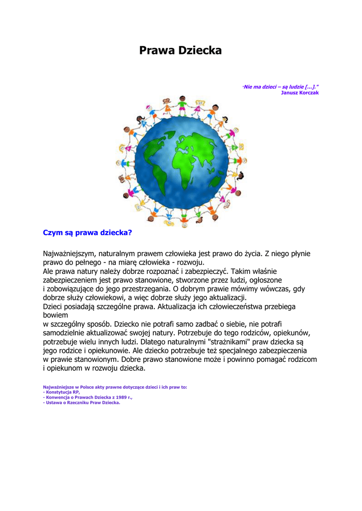 Prawa Dziecka "Nie ma dzieci – są ludzie […]." Janusz Korczak Czym są prawa dziecka? Najważniejszym, naturalnym prawem człowieka jest prawo do życia. Z niego płynie prawo do pełnego - na miarę człowieka - rozwoju. Ale prawa natury należy dobrze rozpoznać i zabezpieczyć. Takim właśnie zabezpieczeniem jest prawo stanowione, stworzone przez ludzi, ogłoszone i zobowiązujące do jego przestrzegania. O dobrym prawie mówimy wówczas, gdy dobrze służy człowiekowi, a więc dobrze służy jego aktualizacji. Dzieci posiadają szczególne prawa. Aktualizacja ich człowieczeństwa przebiega bowiem w szczególny sposób. Dziecko nie potrafi samo zadbać o siebie, nie potrafi samodzielnie aktualizować swojej natury. Potrzebuje do tego rodziców, opiekunów, potrzebuje wielu innych ludzi. Dlatego naturalnymi "strażnikami" praw dziecka są jego rodzice i opiekunowie. Ale dziecko potrzebuje też specjalnego zabezpieczenia w prawie stanowionym. Dobre prawo stanowione może i powinno pomagać rodzicom i opiekunom w rozwoju dziecka. Najważniejsze w Polsce akty prawne dotyczące dzieci i ich praw to: - Konstytucja RP, - Konwencja o Prawach Dziecka z 1989 r., - Ustawa o Rzeczniku Praw Dziecka. KONSTYTUCJA RZECZYPOSPOLITEJ POLSKIEJ Słowo konstytucja pochodzi od łacińskiego constituo,-ere – urządzać, ustanawiać, regulować i oznacza akt prawny, określany także jako ustawa zasadnicza, która zazwyczaj ma najwyższą moc prawną w systemie źródeł prawa w państwie. Konstytucja może określać między innymi podstawowe prawa, wolności i obowiązki obywatela danego kraju oraz organizację, kompetencje i sposób powoływania najważniejszych organów państwowych. Konstytucja RP została uchwalony 2 kwietnia 1997 roku przez Zgromadzenie Narodowe, zatwierdzony w ogólnonarodowym referendum 25 maja 1997 roku. KONWENCJA O PRAWACH DZIECKA Konwencja o prawach dziecka (ang. Convention on the Rights of the Child) – międzynarodowa konwencja przyjęta przez Zgromadzenie Ogólne ONZ20 listopada 1989r. Jest to dokument obowiązujący w niemal wszystkich państwach świata (z wyjątkiem m.in.USA). W konwencji o prawach dziecka zostały spisane wszystkie prawa dziecka. Tworząc zapisy konwencji kierowano się następującymi zasadami: dobra dziecka, równości (wszystkie dzieci są równe wobec prawa bez względu na pochodzenie, płeć, narodowość, itd.), poszanowania praw i odpowiedzialności obojga rodziców (państwo respektuje autonomię rodziny i ingeruje tylko w szczególnie uzasadnionych przypadkach według określonych procedur), pomocy państwa (państwo zobowiązane jest do podejmowania wszelkich działań ustawodawczo-administracyjnych dla realizacji praw uznanych w konwencji). Konwencja ustanawia status dziecka oparty na następujących założeniach: dziecko jest samodzielnym podmiotem, ale ze względu na swoją niedojrzałość psychiczną i fizyczną wymaga szczególnej opieki i ochrony prawnej, dziecko jako istota ludzka wymaga poszanowania jego tożsamości, godności i prywatności, rodzina jest najlepszym środowiskiem wychowania dziecka, państwo ma wspierać rodzinę, a nie wyręczać ją w jej funkcjach. Prawa osobiste prawo do życia i rozwoju, prawo do tożsamości (nazwisko, imię, obywatelstwo, wiedza o własnym pochodzeniu), prawo do wolności, godności, szacunku, nietykalności osobistej, prawo do swobody myśli, sumienia i wyznania, prawo do wyrażania własnych poglądów i występowania w sprawach dziecka dotyczących, w postępowaniu administracyjnym i sądowym prawo do wychowywania rodzinie i kontaktów z rodzicami w przypadku rozłączenia z nimi, prawo do wolności od przemocy fizycznej i psychicznej, prawo nie rekrutowania do wojska poniżej 15 roku życia. Prawa socjalne prawo prawo prawo prawo do do do do odpowiedniego standardu życia, ochrony zdrowia, zabezpieczenia socjalnego, wypoczynku i czasu wolnego. Prawa kulturalne prawo prawo prawo prawo do do do do nauki (bezpłatnej i obowiązkowej w zakresie szkoły podstawowej), korzystania z dóbr kultury, informacji, znajomości swoich praw. Prawa polityczne prawo stowarzyszania się i zgromadzeń w celach pokojowych. Prawa dziecka są przedmiotem traktatów międzynarodowych, w szczególności Konwencji o prawach dziecka z 1989 roku. Dziecko ma prawo do: wychowywania się w rodzinie, adopcji, oświaty i nauki, kultury, wypoczynku i rozrywki, ochrony zdrowia i opieki medycznej, wszechstronnego rozwoju osobowości, swobody wyznania, światopoglądu, dostępu do informacji, ochrony przed wyzyskiem i poniżającym traktowaniem, prywatności, równości. W Polsce najważniejszymi aktami prawnymi, gwarantującymi prawa dziecka, są: Konstytucja RP; Konwencja o Prawach Dziecka; Ustawa o Rzeczniku Praw Dziecka. Od 20 listopada 2008 r. każde dziecko potrzebujące pomocy może zadzwonić do Dziecięcego Telefonu Zaufania Rzecznika Praw Dziecka. Z numerem 0 800 12 12 12 będzie można się połączyć bezpłatnie z każdego stacjonarnego numeru oraz telefonów komórkowych Orange.