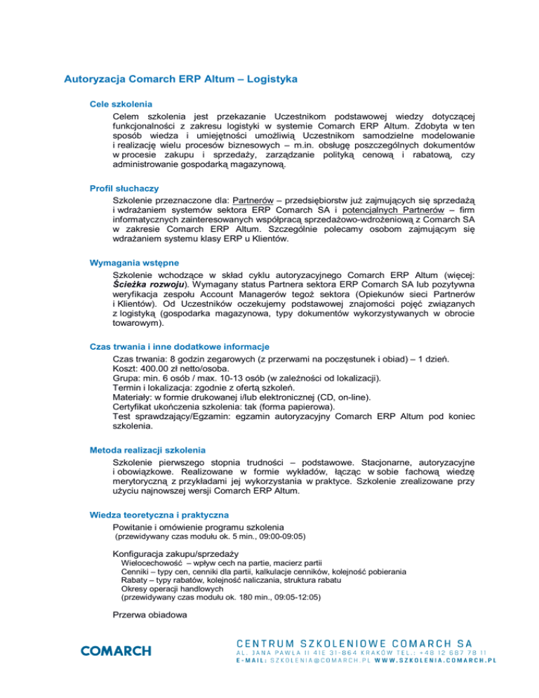 Autoryzacja Comarch ERP Altum – Logistyka Cele szkolenia Celem szkolenia jest przekazanie Uczestnikom podstawowej wiedzy dotyczącej funkcjonalności z zakresu logistyki w systemie Comarch ERP Altum. Zdobyta w ten sposób wiedza i umiejętności umożliwią Uczestnikom samodzielne modelowanie i realizację wielu procesów biznesowych – m.in. obsługę poszczególnych dokumentów w procesie zakupu i sprzedaży, zarządzanie polityką cenową i rabatową, czy administrowanie gospodarką magazynową. Profil słuchaczy Szkolenie przeznaczone dla: Partnerów – przedsiębiorstw już zajmujących się sprzedażą i wdrażaniem systemów sektora ERP Comarch SA i potencjalnych Partnerów – firm informatycznych zainteresowanych współpracą sprzedażowo-wdrożeniową z Comarch SA w zakresie Comarch ERP Altum. Szczególnie polecamy osobom zajmującym się wdrażaniem systemu klasy ERP u Klientów. Wymagania wstępne Szkolenie wchodzące w skład cyklu autoryzacyjnego Comarch ERP Altum (więcej: Ścieżka rozwoju). Wymagany status Partnera sektora ERP Comarch SA lub pozytywna weryfikacja zespołu Account Managerów tegoż sektora (Opiekunów sieci Partnerów i Klientów). Od Uczestników oczekujemy podstawowej znajomości pojęć związanych z logistyką (gospodarka magazynowa, typy dokumentów wykorzystywanych w obrocie towarowym). Czas trwania i inne dodatkowe informacje Czas trwania: 8 godzin zegarowych (z przerwami na poczęstunek i obiad) – 1 dzień. Koszt: 400.00 zł netto/osoba. Grupa: min. 6 osób / max. 10-13 osób (w zależności od lokalizacji). Termin i lokalizacja: zgodnie z ofertą szkoleń. Materiały: w formie drukowanej i/lub elektronicznej (CD, on-line). Certyfikat ukończenia szkolenia: tak (forma papierowa). Test sprawdzający/Egzamin: egzamin autoryzacyjny Comarch ERP Altum pod koniec szkolenia. Metoda realizacji szkolenia Szkolenie pierwszego stopnia trudności – podstawowe. Stacjonarne, autoryzacyjne i obowiązkowe. Realizowane w formie wykładów, łącząc w sobie fachową wiedzę merytoryczną z przykładami jej wykorzystania w praktyce. Szkolenie zrealizowane przy użyciu najnowszej wersji Comarch ERP Altum. Wiedza teoretyczna i praktyczna Powitanie i omówienie programu szkolenia (przewidywany czas modułu ok. 5 min., 09:00-09:05) Konfiguracja zakupu/sprzedaży Wielocechowość – wpływ cech na partie, macierz partii Cenniki – typy cen, cenniki dla partii, kalkulacje cenników, kolejność pobierania Rabaty – typy rabatów, kolejność naliczania, struktura rabatu Okresy operacji handlowych (przewidywany czas modułu ok. 180 min., 09:05-12:05) Przerwa obiadowa (przewidywany czas modułu ok. 60 min., 12:05-13:05) Zakup i sprzedaż Obsługa procesu sprzedażowo-zakupowego – od zapytania ofertowego sprzedaży, przez ofertę sprzedaży, zamówienie sprzedaży, zamówienie zakupu, po fakturę zakupu, przyjęcie zewnętrzne, fakturę sprzedaży i wydanie zewnętrzne Zestawienie sprzedaży detalicznej (przewidywany czas modułu ok. 120 min., 13:05-15:05) Zarządzanie magazynami Wydawanie zasobów z magazynu – generowanie dokumentów rozchodu na konkretne zasoby Historia dostawy Zamówienia wewnętrzne i przesunięcia międzymagazynowe Inwentaryzacja (przewidywany czas modułu ok. 90 min., 15:05-16:35) Podsumowanie, egzamin autoryzacyjny, ankieta i zakończenie szkolenia (przewidywany czas modułu ok. 30 min., 16:35-17:05) Umiejętności Po ukończeniu kursu Uczestnik/czka: • usystematyzuje wiedzę w zakresie obsługi Comarch ERP Altum; • nabędzie umiejętności swobodnego poruszania się w Comarch ERP Altum; • nabędzie umiejętności modelowania ścieżek biznesowych; • rozwinie swoje kompetencje w obszarze logistyki. Ścieżka rozwoju W skład pakietu szkoleń autoryzacyjnych Comarch ERP Altum wchodzą (obowiązkowe): • Autoryzacja Comarch ERP Altum i Comarch Retail; • Autoryzacja Comarch ERP Altum – Administracja, BPM i Wdrożenie z egzaminem; • Autoryzacja Comarch ERP Altum – Logistyka z egzaminem; • Autoryzacja Comarch ERP Altum – Księgowość z egzaminem; • Autoryzacja Comarch ERP Altum – Business Intelligence z egzaminem; Dodatkowo – autoryzacyjne techniczne (także obowiązkowe): • Autoryzacja Techniczna Comarch ERP Altum – Programowanie i Elastyczność z egzaminem; • Autoryzacja Techniczna Comarch ERP Altum – BPM z egzaminem. Wszelkie sugestie zagadnień, nowych tematów mile widziane: [email protected]. Test sprawdzający/Egzamin Szkolenie zakończone jest egzaminem autoryzacyjnym Comarch ERP Altum (wielokrotnego wyboru), składającym się z 20 pytań i przeprowadzonym on-line. W każdym pytaniu zawarta jest przynajmniej jedna poprawna odpowiedź. Nie zaznaczenie w danym pytaniu wszystkich poprawnych odpowiedzi skutkuje nie naliczeniem punktów za dane pytanie. Nie ma punktów ujemnych oraz ułamkowych. Czas trwania testu to 30 minut. Pozytywny wynik egzaminu – to więcej niż 50% poprawnych odpowiedzi. Po zakończeniu egzaminu wyświetli się informacja o uzyskanej ocenie, zostanie ona także wysłana na adres e-mail Uczestnika. W przypadku nie zaliczenia pozytywnie egzaminu, prosimy o kontakt z Opiekunem Regionu (egzamin odbędzie się w wyznaczonym przez Pracownika Comarch terminie).