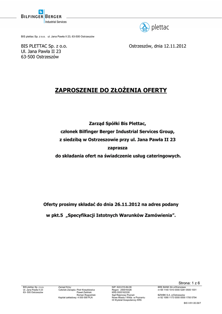 BIS plettac Sp. z o.o. ul. Jana Pawła II 23, 63-500 Ostrzeszów BIS PLETTAC Sp. z o.o. Ul. Jana Pawła II 23 63-500 Ostrzeszów Ostrzeszów, dnia 12.11.2012 ZAPROSZENIE DO ZŁOŻENIA OFERTY Zarząd Spółki Bis Plettac, członek Bilfinger Berger Industrial Services Group, z siedzibą w Ostrzeszowie przy ul. Jana Pawła II 23 zaprasza do składania ofert na świadczenie usług cateringowych. Oferty prosimy składać do dnia 26.11.2012 na adres podany w pkt.5 „Specyfikacji Istotnych Warunków Zamówienia”. Strona: 1 z 6 BIS plettac Sp. z o.o. Ul. Jana Pawła II 23 63- 500 Ostrzeszów Zarząd firmy: Członek Zarządu: Piotr Kraszkiewicz Paweł Zieliński Roman Rogoziński Kapitał zakładowy: 4 000 000 PLN NIP: 622-010-84-06 Regon: 250016326 KRS 0000162330 Sąd Rejonowy Poznań Nowe Miasto i Wilda w Poznaniu IX Wydział Gospodarczy KRS BRE BANK SA o/Warszawa nr 68 1140 1010 0000 5281 0500 1001 BZWBK S.A. o/Ostrzeszów nr 82 1090 1173 0000 0000 1700 5794 BIS V/01.00.06/7 BIS plettac Sp. z o.o. ul. Jana Pawła II 23, 63-500 Ostrzeszów BIS PLETTAC Sp. z o.o. Ul. Jana Pawła II 23 63-500 Ostrzeszów Ostrzeszów, dnia 12.11.2012 SPECYFIKACJA ISTOTNYCH WARUNKÓW ZAMÓWIENIA Na Świadczenie usług cateringowych Strona: 2 z 6 BIS plettac Sp. z o.o. Ul. Jana Pawła II 23 63- 500 Ostrzeszów Zarząd firmy: Członek Zarządu: Piotr Kraszkiewicz Paweł Zieliński Roman Rogoziński Kapitał zakładowy: 4 000 000 PLN NIP: 622-010-84-06 Regon: 250016326 KRS 0000162330 Sąd Rejonowy Poznań Nowe Miasto i Wilda w Poznaniu IX Wydział Gospodarczy KRS BRE BANK SA o/Warszawa nr 68 1140 1010 0000 5281 0500 1001 BZWBK S.A. o/Ostrzeszów nr 82 1090 1173 0000 0000 1700 5794 BIS V/01.00.06/7 BIS plettac Sp. z o.o. ul. Jana Pawła II 23, 63-500 Ostrzeszów 1. ZAMAWIAJĄCY: BIS plettac Sp. z o.o., ul. Jana Pawła II 23, 63-500 Ostrzeszów 2. PRZEDMIOT ZAMÓWIENIA: Usługa polegająca na przygotowaniu i wydawaniu posiłków (śniadania) dla pracowników na terenie siedziby Bis Plettac. 3. TRYB UDZIELENIA ZAMÓWIENIA: Postępowanie prowadzone będzie w trybie wyboru ofertowego 4. OPIS I PARAMETRY ZAMÓWIENIA: 4.1 Posiłki będą przygotowywane dla ok.70 pracowników (+/- 10 porcji) Zamawiający zastrzega sobie prawo zmniejszenia lub zwiększenia liczby pracowników spożywających posiłki. Posiłki będą wydawane we wszystkie dni robocze od poniedziałku do piątku w godzinach od 9.00 do 11.30 4.2 Obowiązki Wykonawcy; - Wykonawca musi zapewnić personel własny do obsługi kuchni i stołówki - posiłki Wykonawca będzie dostarczał własnym transportem - do obowiązków Wykonawcy należeć będzie: a/ przygotowanie, porcjowanie oraz wydawanie posiłków b/ bieżące uzupełnianie brakujących dań c/ mycie i wyparzanie brudnych naczyń d/ utrzymanie kuchni oraz stołówki w porządku i czystości - Wykonawca ponosi pełną odpowiedzialność za: a/ jakość oraz estetykę serwowanych posiłków b/ zgodność świadczonych usług z obowiązującymi normami zbiorowego żywienia i wymogami sanitarno-epidemiologicznymi 4.3 Obowiązki zamawiającego - Zamawiający udostępni wykonawcy pomieszczenia do wydawania posiłków, kuchnię i zmywalnię wraz z wyposażeniem oraz pomieszczenia socjalne. - Zamawiający udostępni wykonawcy wszelkie niezbędne do przygotowania, podgrzania potraw oraz mycia naczyń sprzęty kuchenne. Wykonawca ponosi pełną odpowiedzialność za szkody powstałe w trakcie użytkowania sprzętu kuchennego. - Zamawiający będzie ponosił koszty za zużyte media związane z przedmiotem zamówienia tj: energii elektrycznej, energii cieplnej, ciepłej i zimnej wody, ścieków. Strona: 3 z 6 BIS plettac Sp. z o.o. Ul. Jana Pawła II 23 63- 500 Ostrzeszów Zarząd firmy: Członek Zarządu: Piotr Kraszkiewicz Paweł Zieliński Roman Rogoziński Kapitał zakładowy: 4 000 000 PLN NIP: 622-010-84-06 Regon: 250016326 KRS 0000162330 Sąd Rejonowy Poznań Nowe Miasto i Wilda w Poznaniu IX Wydział Gospodarczy KRS BRE BANK SA o/Warszawa nr 68 1140 1010 0000 5281 0500 1001 BZWBK S.A. o/Ostrzeszów nr 82 1090 1173 0000 0000 1700 5794 BIS V/01.00.06/7 BIS plettac Sp. z o.o. ul. Jana Pawła II 23, 63-500 Ostrzeszów 4.4 Wymagania dotyczące posiłków - posiłki będą serwowane w formie bufetu szwedzkiego - menu musi uwzględniać dania mięsne, półmięsne, jarskie oraz rybne - Wykonawca zobowiązuje się do przygotowania dań gorących co najmniej trzy razy w tygodniu - Jadłospis powinien być urozmaicony. Dania nie mogą się powtarzać w cyklu dziesięciodniowym - posiłki powinny być przygotowywane z surowców wysokiej jakości, zawsze świeżych posiadających aktualne terminy ważności, nabytych w źródłach działających zgodnie z obowiązującymi przepisami sanitarnymi i higienicznymi, naturalnych, z ograniczoną ilością substancji dodatkowych (konserwujących, zagęszczających, barwiących, sztucznie aromatyzowanych) - wyklucza się sporządzanie potraw z proszku W skład dziennego menu muszą wchodzić: Napoje zimne i gorące 2 rodzaje pieczywa Płatki śniadaniowe + mleko Zimna płyta: sery, wędliny, dżemy, itp. Co najmniej jedna porcja warzyw np.: pomidor, ogórek, rzodkiewka, ogórek kiszony itp. Co najmniej jedno danie główne: zimne (np. sałatka, galat) lub/i gorące Jogurt lub świeże owoce sezonowe 5. MIEJSCE ORAZ TERMIN SKŁADANIA OFERT: Oferty prosimy składać w formie mailowej do dnia 26.11.2012 pod adresem mailowym [email protected] Osoba do kontaktu: Magdalena Śmieińska tel.62 59 59 122 Strona: 4 z 6 BIS plettac Sp. z o.o. Ul. Jana Pawła II 23 63- 500 Ostrzeszów Zarząd firmy: Członek Zarządu: Piotr Kraszkiewicz Paweł Zieliński Roman Rogoziński Kapitał zakładowy: 4 000 000 PLN NIP: 622-010-84-06 Regon: 250016326 KRS 0000162330 Sąd Rejonowy Poznań Nowe Miasto i Wilda w Poznaniu IX Wydział Gospodarczy KRS BRE BANK SA o/Warszawa nr 68 1140 1010 0000 5281 0500 1001 BZWBK S.A. o/Ostrzeszów nr 82 1090 1173 0000 0000 1700 5794 BIS V/01.00.06/7 BIS plettac Sp. z o