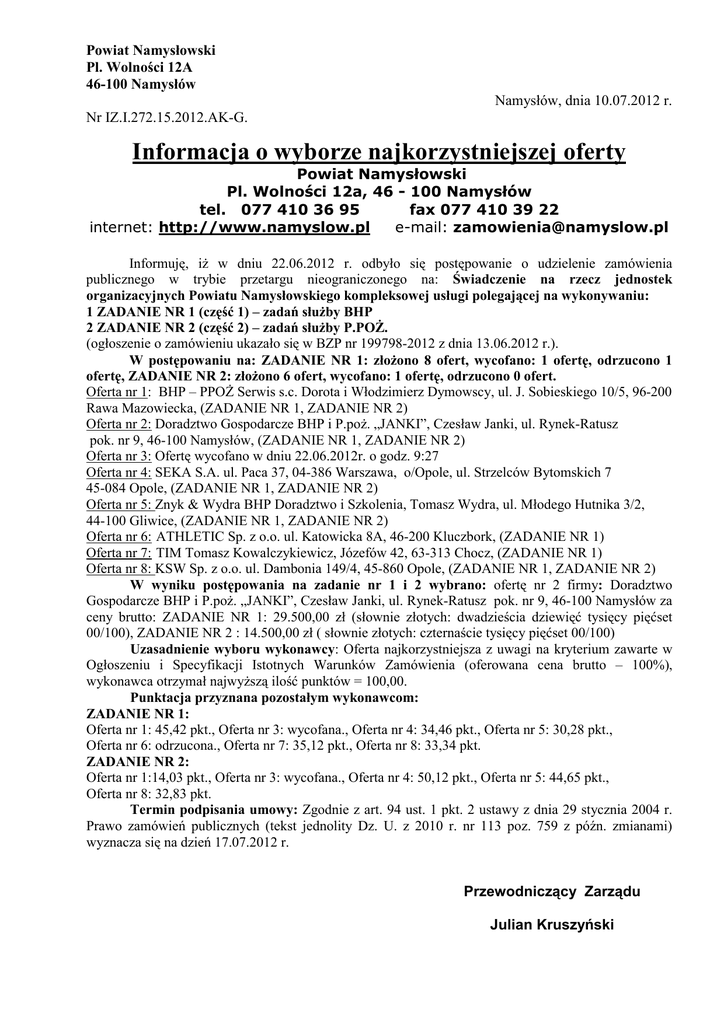 Powiat Namysłowski Pl. Wolności 12A 46-100 Namysłów Namysłów, dnia 10.07.2012 r. Nr IZ.I.272.15.2012.AK-G. Informacja o wyborze najkorzystniejszej oferty Powiat Namysłowski Pl. Wolności 12a, 46 - 100 Namysłów tel. 077 410 36 95 fax 077 410 39 22 internet: http://www.namyslow.pl e-mail: [email protected] Informuję, iż w dniu 22.06.2012 r. odbyło się postępowanie o udzielenie zamówienia publicznego w trybie przetargu nieograniczonego na: Świadczenie na rzecz jednostek organizacyjnych Powiatu Namysłowskiego kompleksowej usługi polegającej na wykonywaniu: 1 ZADANIE NR 1 (część 1) – zadań służby BHP 2 ZADANIE NR 2 (część 2) – zadań służby P.POŻ. (ogłoszenie o zamówieniu ukazało się w BZP nr 199798-2012 z dnia 13.06.2012 r.). W postępowaniu na: ZADANIE NR 1: złożono 8 ofert, wycofano: 1 ofertę, odrzucono 1 ofertę, ZADANIE NR 2: złożono 6 ofert, wycofano: 1 ofertę, odrzucono 0 ofert. Oferta nr 1: BHP – PPOŻ Serwis s.c. Dorota i Włodzimierz Dymowscy, ul. J. Sobieskiego 10/5, 96-200 Rawa Mazowiecka, (ZADANIE NR 1, ZADANIE NR 2) Oferta nr 2: Doradztwo Gospodarcze BHP i P.poż. „JANKI”, Czesław Janki, ul. Rynek-Ratusz pok. nr 9, 46-100 Namysłów, (ZADANIE NR 1, ZADANIE NR 2) Oferta nr 3: Ofertę wycofano w dniu 22.06.2012r. o godz. 9:27 Oferta nr 4: SEKA S.A. ul. Paca 37, 04-386 Warszawa, o/Opole, ul. Strzelców Bytomskich 7 45-084 Opole, (ZADANIE NR 1, ZADANIE NR 2) Oferta nr 5: Znyk & Wydra BHP Doradztwo i Szkolenia, Tomasz Wydra, ul. Młodego Hutnika 3/2, 44-100 Gliwice, (ZADANIE NR 1, ZADANIE NR 2) Oferta nr 6: ATHLETIC Sp. z o.o. ul. Katowicka 8A, 46-200 Kluczbork, (ZADANIE NR 1) Oferta nr 7: TIM Tomasz Kowalczykiewicz, Józefów 42, 63-313 Chocz, (ZADANIE NR 1) Oferta nr 8: KSW Sp. z o.o. ul. Dambonia 149/4, 45-860 Opole, (ZADANIE NR 1, ZADANIE NR 2) W wyniku postępowania na zadanie nr 1 i 2 wybrano: ofertę nr 2 firmy: Doradztwo Gospodarcze BHP i P.poż. „JANKI”, Czesław Janki, ul. Rynek-Ratusz pok. nr 9, 46-100 Namysłów za ceny brutto: ZADANIE NR 1: 29.500,00 zł (słownie złotych: dwadzieścia dziewięć tysięcy pięćset 00/100), ZADANIE NR 2 : 14.500,00 zł ( słownie złotych: czternaście tysięcy pięćset 00/100) Uzasadnienie wyboru wykonawcy: Oferta najkorzystniejsza z uwagi na kryterium zawarte w Ogłoszeniu i Specyfikacji Istotnych Warunków Zamówienia (oferowana cena brutto – 100%), wykonawca otrzymał najwyższą ilość punktów = 100,00. Punktacja przyznana pozostałym wykonawcom: ZADANIE NR 1: Oferta nr 1: 45,42 pkt., Oferta nr 3: wycofana., Oferta nr 4: 34,46 pkt., Oferta nr 5: 30,28 pkt., Oferta nr 6: odrzucona., Oferta nr 7: 35,12 pkt., Oferta nr 8: 33,34 pkt. ZADANIE NR 2: Oferta nr 1:14,03 pkt., Oferta nr 3: wycofana., Oferta nr 4: 50,12 pkt., Oferta nr 5: 44,65 pkt., Oferta nr 8: 32,83 pkt. Termin podpisania umowy: Zgodnie z art. 94 ust. 1 pkt. 2 ustawy z dnia 29 stycznia 2004 r. Prawo zamówień publicznych (tekst jednolity Dz. U. z 2010 r. nr 113 poz. 759 z późn. zmianami) wyznacza się na dzień 17.07.2012 r. Przewodniczący Zarządu Julian Kruszyński Do wiadomości: 1. BHP – PPOŻ Serwis s.c. Dorota i Włodzimierz Dymowscy ul. J. Sobieskiego 10/5 96-200 Rawa Mazowiecka fax: 46/8151015 2. Doradztwo Gospodarcze BHP i P.poż. „JANKI” Czesław Janki ul. Rynek-Ratusz, pok. nr 9 46-100 Namysłów fax: 77/4102641 3. SEKA S.A. ul. Paca 37 04-386 Warszawa o/Opole ul. Strzelców Bytomskich 7 45-084 Opole fax: 77/4565267 4. Znyk & Wydra BHP Doradztwo i Szkolenia Tomasz Wydra ul. Młodego Hutnika 3/2 44-100 Gliwice fax: 32/2399374 5. ATHLETIC Sp. z o.o. ul. Katowicka 8A 46-200 Kluczbork fax:77/4142367 6. TIM Tomasz Kowalczykiewicz Józefów 42 63-313 Chocz 7. KSW Sp. z o.o. ul. Dambonia 149/4 45-860 Opole fax: 77/5558254 8. Tablica Informacyjna Starostwa Powiatowego 9. Strona internetowa Powiatu Namysłowskiego 10. a/a AK-G/MA 2