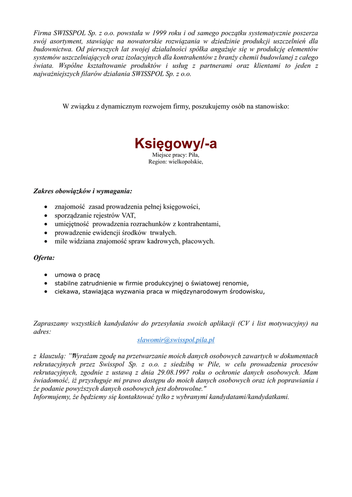 Firma SWISSPOL Sp. z o.o. powstała w 1999 roku i od samego początku systematycznie poszerza swój asortyment, stawiając na nowatorskie rozwiązania w dziedzinie produkcji uszczelnień dla budownictwa. Od pierwszych lat swojej działalności spółka angażuje się w produkcję elementów systemów uszczelniających oraz izolacyjnych dla kontrahentów z branży chemii budowlanej z całego świata. Wspólne kształtowanie produktów i usług z partnerami oraz klientami to jeden z najważniejszych filarów działania SWISSPOL Sp. z o.o. W związku z dynamicznym rozwojem firmy, poszukujemy osób na stanowisko: Księgowy/-a Miejsce pracy: Piła, Region: wielkopolskie, Zakres obowiązków i wymagania: znajomość zasad prowadzenia pełnej księgowości, sporządzanie rejestrów VAT, umiejętność prowadzenia rozrachunków z kontrahentami, prowadzenie ewidencji środków trwałych. mile widziana znajomość spraw kadrowych, płacowych. Oferta: umowa o pracę stabilne zatrudnienie w firmie produkcyjnej o światowej renomie, ciekawa, stawiająca wyzwania praca w międzynarodowym środowisku, Zapraszamy wszystkich kandydatów do przesyłania swoich aplikacji (CV i list motywacyjny) na adres: [email protected] z klauzulą: ”"Wyrażam zgodę na przetwarzanie moich danych osobowych zawartych w dokumentach rekrutacyjnych przez Swisspol Sp. z o.o. z siedzibą w Pile, w celu prowadzenia procesów rekrutacyjnych, zgodnie z ustawą z dnia 29.08.1997 roku o ochronie danych osobowych. Mam świadomość, iż przysługuje mi prawo dostępu do moich danych osobowych oraz ich poprawiania i że podanie powyższych danych osobowych jest dobrowolne." Informujemy, że będziemy się kontaktować tylko z wybranymi kandydatami/kandydatkami.