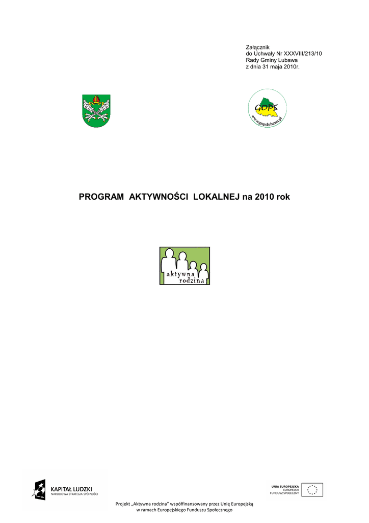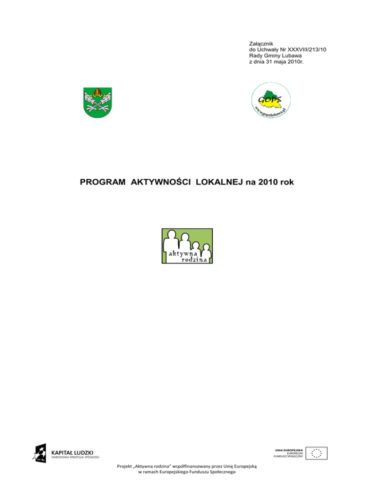 Załącznik do Uchwały Nr XXXVIII/213/10 Rady Gminy Lubawa z dnia 31 maja 2010r. PROGRAM AKTYWNOŚCI LOKALNEJ na 2010 rok Projekt „Aktywna rodzina” współfinansowany przez Unię Europejską w ramach Europejskiego Funduszu Społecznego I. Wstęp Program Aktywności Lokalnej jest uzupełnieniem strategii „Rozwiązywania Problemów Społecznych w Gminie Lubawa do 2015 roku” oraz „Lokalnego Programu Opieki nad Dzieckiem i Rodziną na lata 2006-2010”. Przyjęte w programie działania są zgodne z załoŜeniami zawartymi w dokumentach strategicznych krajowych, regionalnych oraz lokalnych takich jak: Strategia Rozwoju Kraju na lata 2007-2015, Strategia Polityki Społecznej na lata 2007-2013, Narodowa Strategia Rozwoju na lata 2007-2013, Program Operacyjny Kapitał Ludzki na lata 2007-2013, Strategia Polityki Społecznej Województwa Warmińsko-Mazurskiego do roku 2020, „Strategia Rozwiązywania Problemów Społecznych w Gminie Lubawa do roku 2015”, „Lokalny Program Opieki nad Dzieckiem i Rodziną na lata 2006-2010”. Zgodnie z ustawą o pomocy społecznej z dnia 12 marca 2004 roku, która mówi „Zadaniem pomocy społecznej jest zapobieganie sytuacjom, o których mowa w art. 2 ust.1, przez podejmowanie działań zmierzających do samodzielnego usamodzielnienia osób i ich rodzin oraz integracji ze środowiskiem”, uzupełnieniem w/w dokumentów jest Program Aktywności Lokalnej, który zakłada wspólne działania lokalnych podmiotów w zakresie podniesienia poziomu aktywności poszczególnych osób i grup społecznych oraz włączenie ich w Ŝycie społeczności lokalnej na rzecz samodzielnego rozwiązywania waŜnych problemów społecznych. Program Aktywności Lokalnej to drugie obok kontraktów socjalnych, narzędzie aktywnej integracji umoŜliwiające wsparcie i aktywizację osób w ramach pracy z konkretnym środowiskiem. Pozwala ośrodkom pomocy społecznej we współpracy z innymi instytucjami, by skuteczniej działać i wspierać całe społeczności lokalne, a nie tylko osoby zagroŜone wykluczeniem społecznym. Dobrze zorganizowana i aktywna społeczność lokalna to jeden z największych atutów Gmin w procesie rozwiązywania problemów społecznych. Koniecznym staje się fakt inicjowania przez władze samorządowe zintegrowanych działań, których celem jest uaktywnienie nie tylko pojedynczych osób, ale takŜe grup i społeczności lokalnych by pobudzić w nich poczucie odpowiedzialności za siebie i innych, zwłaszcza zagroŜonych wykluczeniem społecznym. Program Aktywności Lokalnej na rok 2010 jest niezbędnym dokumentem do realizacji projektu systemowego „Aktywna rodzina” przez Ośrodek Pomocy Społecznej Gminy Lubawa w ramach Programu Operacyjnego Kapitał Ludzki, Priorytet VII- Promocja integracji społecznej, Poddziałanie 7.1.1- Rozwój i upowszechnienie aktywnej integracji przez ośrodki pomocy społecznej. II. Okres realizacji Czerwiec-grudzień 2010r. III. Lokalizacja Program będzie realizowany w gminie Lubawa w miejscowościach: Fijewo, Gutowo, Omule, Prątnica, Szczepankowo i Tuszewo. IV. 1. Partnerzy programu Rady Sołeckie miejsca zamieszkania uczestniczek programu (Fijewo, Gutowo, Omule, Prątnica, Szczepankowo, Tuszewo): współpraca przy kampanii promocyjno-informacyjnej, tworzenie warunków dla aktywnej integracji uczestniczek projektu, 2. Szkoły Podstawowe i Zespół Szkół (miejsca kształcenia dzieci): Rumienica, Tuszewo, Złotowo, Prątnica: współpraca w przebiegu działań opiekuńczo-wychowawczych, 3. Powiatowy Urząd Pracy: pomoc w powrocie na rynek pracy, w poszukiwaniu nowych miejsc pracy, skierowanie na staŜe, prace społecznie uŜyteczne. Projekt „Aktywna rodzina” współfinansowany przez Unię Europejską w ramach Europejskiego Funduszu Społecznego V. Cel główny programu Zaktywizowanie i integracja społeczna i zawodowa 12 kobiet i ich rodzin z terenu Gminy Lubawa w 2010 roku, poprzez objęcie ich kompleksowym wsparciem w zwiększaniu dostępu do usług społecznych. VI. Cele szczegółowe programu 1. Aktywizacja społeczna 12 kobiet. 2. Wzrost umiejętności społecznych u 12 kobiet. 3. Wzrost umiejętności zawodowych u 12 kobiet. 4. Wzrost wiedzy z zakresu stereotypowego postrzegania ról kobiet i męŜczyzn u 12 kobiet. 5. Wzrost upowszechniania instrumentów aktywnej integracji i świadczenia pracy socjalnej poprzez zatrudnienie dodatkowego pracownika socjalnego. VII. Uzasadnienie realizacji Gminę Lubawa zamieszkuje 10.844 osób (stan na dzień 31.12.2009r.). Struktura ludności pod względem wiekowym wygląda następująco: 2.843 osoby w wieku przedprodukcyjnym 6.648, osoby w wieku produkcyjnym, 1.353 osoby w wieku poprodukcyjnym. Według danych Ośrodka Pomocy Społecznej Gminy Lubawa w 2009 roku ze świadczeń OPS korzystały 403 rodziny. Głównymi powodami udzielanej pomocy było: bezrobocie - 114 rodzin, bezradność w sprawach opiekuńczo-wychowawczych i prowadzenia gospodarstwa domowego -107 rodzin, niepełnosprawność - 166 rodzin, potrzeba ochrony macierzyństwa - 104 rodziny. Osoby te oraz ich rodziny borykają się z róŜnorodnymi problemami, które jednak najczęściej są ściśle powiązane z ubóstwem i brakiem zatrudnienia. Środowiska rodzinne doświadczające róŜnorodnych problemów społecznych w pierwszej kolejności wymagają indywidualnej pomocy i wsparcia ze strony powołanych w tym celu instytucji i organizacji oraz wsparcia społeczności lokalnej w celu uniknięcia alienacji społecznej. Program Aktywności Lokalnej skierowany jest do 12 kobiet z terenu gminy Lubawa, zamieszkujących w miejscowościach: Fijewo 1-osoba, Gutowo 2-osoby, Omule 1-osoba, Prątnica 4-osoby, Szczepankowo 1-osoba, Tuszewo 3-osoby, zagroŜonych dysfunkcjami: wykluczeniem społecznym, niezaradnością Ŝyciową, niewydolnością opiekuńczo-wychowawczą i niewydolnością w prowadzeniu gospodarstwa domowego. Struktura rodzin: z rodzin niepełnych 4 osoby, wielodzietnych 4 osoby oraz z rodzin pełnych