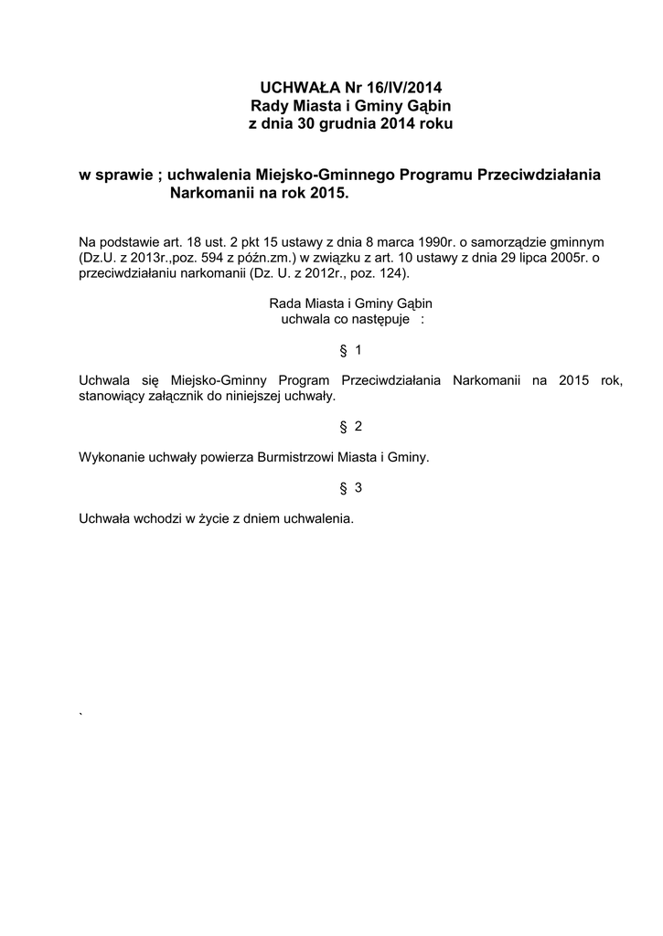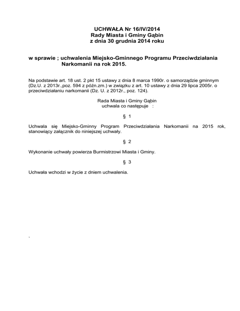 UCHWAŁA Nr 16/IV/2014 Rady Miasta i Gminy Gąbin z dnia 30 grudnia 2014 roku w sprawie ; uchwalenia Miejsko-Gminnego Programu Przeciwdziałania Narkomanii na rok 2015. Na podstawie art. 18 ust. 2 pkt 15 ustawy z dnia 8 marca 1990r. o samorządzie gminnym (Dz.U. z 2013r.,poz. 594 z późn.zm.) w związku z art. 10 ustawy z dnia 29 lipca 2005r. o przeciwdziałaniu narkomanii (Dz. U. z 2012r., poz. 124). Rada Miasta i Gminy Gąbin uchwala co następuje : § 1 Uchwala się Miejsko-Gminny Program Przeciwdziałania Narkomanii na 2015 rok, stanowiący załącznik do niniejszej uchwały. § 2 Wykonanie uchwały powierza Burmistrzowi Miasta i Gminy. § 3 Uchwała wchodzi w życie z dniem uchwalenia. ` Załącznik do uchwały nr 16/IV/2014 Rady Miasta i Gminy Gąbin z dnia 30.12.2014 roku MIEJSKO-GMINNY PROGRAM PRZECIWDZIAŁANIA NARKOMANII NA ROK 2015 Uznając powagę zagrożeń, jakie niesie uzależnienie od narkotyków, szczególne narażenie dzieci i młodzieży, a także tragiczne skutki nałogu degradującego osobowość, Rada Miasta i Gminy Gąbin przyjmuje Miejsko -Gminny Program Przeciwdziałania Narkomanii. Celem Programu jest ograniczenie uzależnień od środków psychoaktywnych poprzez wspieranie leczenia i różnorodnych form terapii a także realizowanie szerokiej oferty programów profilaktycznych. Podstawowe cele programu to : 1. 2. 3. 4. 5. Zwiększenie zaangażowania społeczności lokalnych w zapobieganiu używania środków psychoaktywnych, poprzez organizowanie i prowadzenie na terenie placówek oświatowych i świetlic środowiskowych programów profilaktycznych. Podniesienie poziomu wiedzy społeczeństwa na temat problemów związanych z używaniem środków psychoaktywnych i możliwości zapobiegania zjawisku. Zwiększenie liczby kompetentnych realizatorów programów profilaktycznych. Udzielanie rodzinom, w których występują problemy narkotyczne, pomocy psychospołecznej i prawnej oraz prowadzenie działalności informacyjnej. Szkolenie grup zawodowych zaangażowanych w problematykę narkomanii oraz wspomaganie działalności instytucji, stowarzyszeń i osób fizycznych realizujących zadania związane z profilaktyką oraz rozwiązywaniem problemów narkomanii. Zadania w zakresie profilaktyki i edukacji dotyczącej problematyki narkomanii I. Uwzględnienie problematyki narkomanii w lokalnych strategiach rozwiązywania problemów społecznych w szczególności w części dotyczącej diagnozy rozpowszechniania i używania narkotyków oraz planowania działań zapobiegawczych. Odpowiedzialni za realizację zadania; Miejsko – Gminny Ośrodek Pomocy Społecznej. 1. Wspieranie szkół podstawowych oraz gimnazjalnych w rozwijaniu działań profilaktycznych. - zakup materiałów informacyjnych i książek dotyczących problemu narkomanii, - dofinansowanie programów profilaktycznych związanych z problemem narkomanii, Odpowiedzialni za realizację zadania ; Miejsko – Gminny Ośrodek Pomocy Społecznej, Placówki Oświatowe, Miejsko – Gminny Ośrodek Kultury, Stowarzyszenie działające na terenie Miasta i Gminy Gąbin. 2. Prowadzenie programów profilaktycznych, jako element organizacji wolnego czasu dla dzieci i młodzieży. prowadzenie profilaktycznej działalności informacyjnej i edukacyjnej na temat uzależnień dla dzieci i młodzieży, - pokrycie kosztów spektakli profilaktycznych realizowanych w szkołach, - organizowanie i koordynowanie sposobu wykorzystania czasu wolnego, między innymi, poprzez organizację konkursów, imprez artystycznych, sportowych, jak również zakup sprzętu sportowego. Odpowiedzialni za realizację zadania; Miejsko – Gminny Ośrodek Pomocy Społecznej, Kościoły, organizacje pozarządowe, - 3. Organizowanie i prowadzenie pozaszkolnych programów profilaktycznych adresowanych do dzieci i młodzieży pokrycie kosztów organizacji pozaszkolnych programów profilaktycznych, dofinansowanie imprez sportowo – rekreacyjnych, dofinansowanie wycieczek szkolnych, dofinansowanie programów profilaktycznych realizowanych przez szkoły, kluby sportowe. Odpowiedzialni za realizację zadania; Miejsko – Gminny Ośrodek Pomocy Społecznej, placówki oświatowe. - 4. Wspieranie merytoryczne kadry pedagogicznej przy opracowaniu szkolnych programów profilaktycznych. wyposażenie placówek oświatowo – wychowawczych w materiały edukacyjne / książki, czasopisma, broszury, plakaty/ pokrycie kosztów opieki nad dziećmi w czasie realizacji zajęć sportowo – rekreacyjnych dla uczniów, - zakup nagród dla zwycięzców konkursów sportowo- rekreacyjnych. - pomoc finansowa dla placówek kulturalno – oświatowych, zajmujących się realizacją programów profilaktycznych. Odpowiedzialni za realizację zadania; Miejsko – Gminny Ośrodek Pomocy Społecznej, Placówki Oświatowe. - II. Podniesienie poziomu wiedzy społeczeństwa na temat problemów związanych z używaniem środków psychoaktywnych i możliwości zapobiegania zjawisku. 1. Prowadzenie kampanii edukacyjnych, obejmujących problematykę narkomanii, adresowanych w szczególności do określonych grup docelowych / młodzieży, szkół gimnazjalnych/. - zapobieganie powstawaniu problemów związanych z narkotykami. - wspieranie finansowe, organizacyjne, i edukacyjne szkół, stowarzyszeń, zajmujących się problematyką narkomanii, Partnerzy Realizacji zadania ; Komisja Rozwiązywania Problemów Alkoholowych, Policja. 2. Organizowanie i prowadzenie na terenie placówek oświatowych programów profilaktycznych dla dzieci i młodzieży z udziałem grup rodzicielskich. Partnerzy w realizacji zadania; Komisja ds. Rozwiązywania Problemów Alkoholowych, Placówki Oświatowe. 3. Promowanie zdrowego stylu życia w działalności oświatowej. Partnerzy; Placówki oświatowe, kluby i organizacje sportowe. 4. Prowadzenie programów edukacyjnych, organizowanie konkursów, olimpiad, turniejów promujących zdrowy styl życia. Partnerzy; Komisja ds. Rozwiązywania Problemów Alkoholowych, OSP, Mie