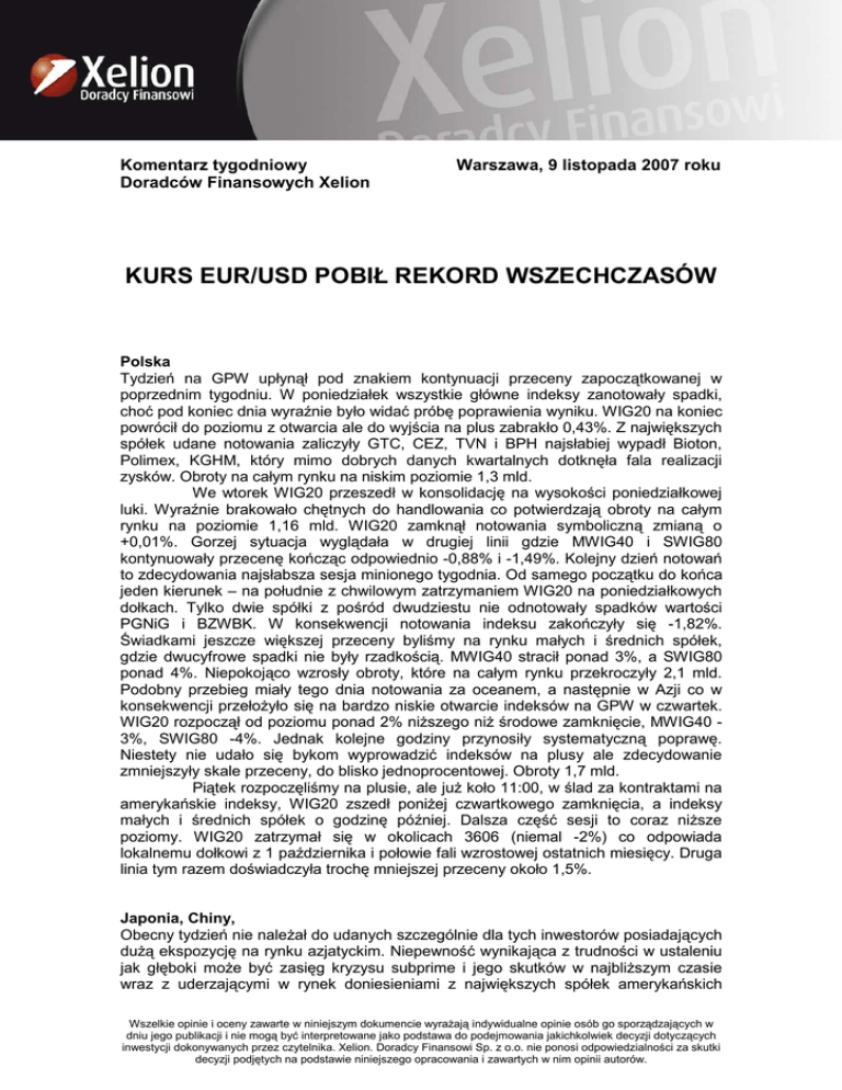 Komentarz tygodniowy Doradców Finansowych Xelion Warszawa, 9 listopada 2007 roku KURS EUR/USD POBIŁ REKORD WSZECHCZASÓW Polska Tydzień na GPW upłynął pod znakiem kontynuacji przeceny zapoczątkowanej w poprzednim tygodniu. W poniedziałek wszystkie główne indeksy zanotowały spadki, choć pod koniec dnia wyraźnie było widać próbę poprawienia wyniku. WIG20 na koniec powrócił do poziomu z otwarcia ale do wyjścia na plus zabrakło 0,43%. Z największych spółek udane notowania zaliczyły GTC, CEZ, TVN i BPH najsłabiej wypadł Bioton, Polimex, KGHM, który mimo dobrych danych kwartalnych dotknęła fala realizacji zysków. Obroty na całym rynku na niskim poziomie 1,3 mld. We wtorek WIG20 przeszedł w konsolidację na wysokości poniedziałkowej luki. Wyraźnie brakowało chętnych do handlowania co potwierdzają obroty na całym rynku na poziomie 1,16 mld. WIG20 zamknął notowania symboliczną zmianą o +0,01%. Gorzej sytuacja wyglądała w drugiej linii gdzie MWIG40 i SWIG80 kontynuowały przecenę kończąc odpowiednio -0,88% i -1,49%. Kolejny dzień notowań to zdecydowania najsłabsza sesja minionego tygodnia. Od samego początku do końca jeden kierunek – na południe z chwilowym zatrzymaniem WIG20 na poniedziałkowych dołkach. Tylko dwie spółki z pośród dwudziestu nie odnotowały spadków wartości PGNiG i BZWBK. W konsekwencji notowania indeksu zakończyły się -1,82%. Świadkami jeszcze większej przeceny byliśmy na rynku małych i średnich spółek, gdzie dwucyfrowe spadki nie były rzadkością. MWIG40 stracił ponad 3%, a SWIG80 ponad 4%. Niepokojąco wzrosły obroty, które na całym rynku przekroczyły 2,1 mld. Podobny przebieg miały tego dnia notowania za oceanem, a następnie w Azji co w konsekwencji przełoŜyło się na bardzo niskie otwarcie indeksów na GPW w czwartek. WIG20 rozpoczął od poziomu ponad 2% niŜszego niŜ środowe zamknięcie, MWIG40 3%, SWIG80 -4%. Jednak kolejne godziny przynosiły systematyczną poprawę. Niestety nie udało się bykom wyprowadzić indeksów na plusy ale zdecydowanie zmniejszyły skale przeceny, do blisko jednoprocentowej. Obroty 1,7 mld. Piątek rozpoczęliśmy na plusie, ale juŜ koło 11:00, w ślad za kontraktami na amerykańskie indeksy, WIG20 zszedł poniŜej czwartkowego zamknięcia, a indeksy małych i średnich spółek o godzinę później. Dalsza część sesji to coraz niŜsze poziomy. WIG20 zatrzymał się w okolicach 3606 (niemal -2%) co odpowiada lokalnemu dołkowi z 1 października i połowie fali wzrostowej ostatnich miesięcy. Druga linia tym razem doświadczyła trochę mniejszej przeceny około 1,5%. Japonia, Chiny, Obecny tydzień nie naleŜał do udanych szczególnie dla tych inwestorów posiadających duŜą ekspozycję na rynku azjatyckim. Niepewność wynikająca z trudności w ustaleniu jak głęboki moŜe być zasięg kryzysu subprime i jego skutków w najbliŜszym czasie wraz z uderzającymi w rynek doniesieniami z największych spółek amerykańskich Wszelkie opinie i oceny zawarte w niniejszym dokumencie wyraŜają indywidualne opinie osób go sporządzających w dniu jego publikacji i nie mogą być interpretowane jako podstawa do podejmowania jakichkolwiek decyzji dotyczących inwestycji dokonywanych przez czytelnika. Xelion. Doradcy Finansowi Sp. z o.o. nie ponosi odpowiedzialności za skutki decyzji podjętych na podstawie niniejszego opracowania i zawartych w nim opinii autorów. powoduje redukcję apetytu na ryzyko i większe skłonności do zabezpieczenia swoich pozycji. Na giełdzie w Tokio indeks Nikkei225 w ujęciu całego tygodnia spadł o 5.77% do poziomu 15.583 pkt. zbliŜając się do dołku z połowy sierpnia. Impuls do wyprzedaŜy na początku tygodnia przyniósł sektor finansowy z Mitsubishi UFJ Financial Group na czele po zaskakujących informacjach opublikowanych przez Merrill Lynch czy Citigroup. Rosnące ceny surowców wpływają negatywnie na wartość dolara co powoduje z kolei umacnianie się yena. W trakcie tygodnia umocnił się on z poziomu 114.81 do 112.20. Wyraźna w ostatnim czasie aprecjacja japońskiego yena wpływa na zyski największych eksporterów, których dochody w ponad 60% pochodzą z aktywności zagranicznej. Przecenie uległy takie spółki jak Sony, Honda i sektor finansowy. Dodatkowym minusem okazały się być ogłoszone w czwartek mniejsze niŜ przewidywania analityków zamówienia w przemyśle sektora prywatnego. Widoczne zwiększenie awersji do ryzyka inwestorów na ryzykowne papiery wartościowe spowodowały wzrost cen obligacji. Rentowność obligacji skarbowych dziesięcioletnich obniŜyła się w piątek z 4.30 do 4.27%. Wsparcie dla inwestorów moŜe przyjść w przyszłym tygodniu z uwagi na publikację danych o wzroście gospodarczym za trzeci kwartał i dwudniowe posiedzenie Banku Centralnego. Z kolei na giełdzie w Shanghaiu sytuacja wyglądała podobnie jak w całym regionie Azji. Indeks Shanghai Composite Index spadł o 8.16% kończąc tydzień notowań poziomem 5315 pkt. który ostatnio był pod koniec września. Wraz z przeceną w USA i Japonii równieŜ inwestorzy na giełdzie w Chinach redukowali swoje portfele o spółki z sektora finansowego czy energetycznego. Traciły największe blue chipy jak Petro China, Shenhua Energy, ICBC czy teŜ Sinopec, China Oilfield Services Ltd oraz China Aluminum. Przecena na giełdzie papierów typu A i B odbywała się w parze ze sprzedaŜą chińskich walorów równieŜ na giełdzie w Hong Kongu. Natomiast w południowej części Azji na giełdzie w Bombaju indeks trzydziestu największych spółek stracił na tle całego tygodnia 4.67% zamykając czwartkowe notowania pułapem 19.058 pkt. Zwiększona zmienność cenowa dotknęła równieŜ wycenę indyjskich walorów. Na otwarciu tygodnia traciły spółki z sektora bankowego jak ICICI i HDFC. Spółki naftowe jak ONGC równieŜ znalazły się w kręgu przecenionych walorów z uwagi na zwiększającą się presję jaka obecnie