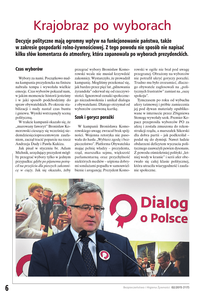 Krajobraz po wyborach Decyzje polityczne mają ogromny wpływ na funkcjonowanie państwa, także w zakresie gospodarki rolno-żywnościowej. Z tego powodu nie sposób nie napisać kilku słów komentarza do atmosfery, która zapanowała po wyborach prezydenckich. Czas wyborów Wybory za nami. Początkowo nudna kampania prezydencka na finiszu nabrała tempa i wywołała wielkie emocje. Czas wyborów pokazał nam, w jakim momencie historii jesteśmy i w jaki sposób podchodzimy do spraw obywatelskich. Po okresie stabilizacji i nudy nastał czas buntu i gniewu. Wyniki wstrząsnęły sceną polityczną. W trakcie kampanii okazało się, że „murowany faworyt” Bronisław Komorowski cieszący się wcześniej siedemdziesięcioprocentowym zaufaniem, zaczął tracić poparcie na rzecz Andrzeja Dudy i Pawła Kukiza. Jak pisał w styczniu br. Adam Michnik, urzędujący prezydent mógłby przegrać wybory tylko w jednym przypadku: gdyby po pijanemu potrącił na przejściu dla pieszych zakonnicę w ciąży. Jak się okazało, żeby 6 przegrać wybory Bronisław Komorowski wcale nie musiał krzywdzić zakonnicy. Wystarczyło, że prowadził kampanię. Mogliśmy przekonać się, jak bardzo przez pięć lat „pilnowania żyrandola” oderwał się od rzeczywistości. Ignorował oznaki społecznego niezadowolenia i unikał dialogu z obywatelami. Dlatego otrzymał od wyborców czerwoną kartkę. Szok i gorycz porażki W kampanii Bronisława Komorowskiego uwagę zwracał brak spójności. Wojenna retoryka nie pasowała do hasła „Wybierz zgodę i bezpieczeństwo”. Platforma Obywatelska mając pełnię władzy – prezydenta, rząd, marszałka sejmu, większość parlamentarną oraz przychylność niektórych mediów – uśpiona dobrymi sondażami popadła w samouwielbienie i arogancję. Prezydent Komo- rowski w ogóle nie brał pod uwagę przegranej. Obrażony na wyborców nie potrafił ukryć goryczy porażki. Trudno mu było zrozumieć, dlaczego obywatele zagłosowali na „politycznych frustratów” zamiast na „oazę spokoju”. Tymczasem po roku od wybuchu afery taśmowej i próbie zamiecenia jej pod dywan materiały opublikowane w internecie przez Zbigniewa Stonogę wywołały szok. Premier Kopacz przeprosiła wyborców PO za aferę i została zmuszona do rekonstrukcji rządu, a marszałek Sikorski dla dobra partii – jak podkreślał – podał się do dymisji. Nawet ludzie obdarzeni deficytem wyczucia politycznego zauważyli pewien dysonans. Z powodu ośmioletniej polityki „letniej wody w kranie” i serii afer oberwało się całej klasie politycznej, która utraciła wiarygodność i zaufanie społeczne. Bezpieczeństwo i Higiena Żywności 02/2015 (117) Prywatny folwark Wiele razy na łamach „Bezpieczeństwa i Higieny Żywności” poruszaliśmy temat złych praktyk w Ministerstwie Rolnictwa i Rozwoju Wsi i podległych mu agencjach. Pisaliśmy o nepotyzmie, zwanym „polityką rodzinną”, uprawianym między innymi przez ministra rolnictwa. Na potwierdzenie tego w opublikowanym ostatnio raporcie NIK nie zostawia suchej nitki na spółce ELEWARR podległej Agencji Rynku Rolnego. Najwyższa Izba Kontroli ocenia negatywnie sprawowanie nadzoru właścicielskiego nad ELEWARR Sp. z o.o. przez Prezesa Agencji Rynku Rolnego. Spółka ELEWARR przestała pełnić kluczową rolę w stabilizacji rynku zbóż oraz w przechowywaniu zapasów interwencyjnych Unii Europejskiej. Przeprowadzone zmiany organizacyjne okazały się nieskuteczne. Prezes Agencji Rynku Rolnego nie zapobiegł też pogorszeniu sytuacji ekonomicznofinansowej spółki ELEWARR. W poprzednim raporcie opublikowanym w 2011 roku NIK stwierdziła, że członkom zarządu spółki przyznano wynagrodzenia w kwotach przekraczających limity dozwolone w ustawie kominowej. W kontroli sprawdzającej kontrolerzy Izby ustalili, że Prezes Agencji Rynku Rolnego nie podjął działań w celu wyegzekwowania wynagrodzeń nienależnie pobranych przez członków Rady Nadzorczej, Zarządu i Głównego Księgowego spółki w latach 2008–2010. Tym samym Prezes ARR dopuścił do przedawnienia roszczeń w kwocie 1401,8 tys. zł. Mało tego, Prezes ARR ponownie – niezgodnie z ustawą kominową – zaakceptował wynagrodzenia dla członków zarządu spółki w kwocie 208 tys. zł. Nieprawidłowości finansowe stwierdzone przez NIK w kontroli sprawdzającej wyniosły tym razem 1129,6 tys. zł (suma nienależnie pobranych wynagrodzeń przez członków zarządu i członków rady nadzorczej spółki). Tak więc nieprawidłowości finansowe dotyczące nienależnie pobranych wynagrodzeń wyniosły łącznie (ustalenia z obu kontroli) 2531,4 tys. zł. Najwyższa Izba Kontroli przygotowała i przesłała zawiadomienie do prokuratury o podejrzeniu popełnienia przestępstwa w sprawie niedopełnienia obowiązku zwrotu roszczeń w kwocie 1400 tys. zł i wyrządzenia spółce ELEWARR szkody majątkowej w wielkich rozmiarach. Wszystko wskazuje na to, że spółka stała się prywatnym folwarkiem dla działaczy PSL-u, z którego czerpali korzyści. Intryga polityczna Minister Sawicki, który w 2012 r. musiał podać się do dymisji po ujawnieniu nagrań z rozmowy szefa kółek rolniczych Władysława Serafina z byłym prezesem Agencji Rynku Rolnego Władysławem Łukasikiem, mówił w niej właśnie na temat nieprawidłowości m.in. w spółce ELEWARR. Karuzela stanowisk i ponowne przyjęcie Sawickiego do resortu rolnictwa i jego ponad półtoraroczne nowe rządy nie uzdrowiły sytuacji w instytucjach mu podległych, w tym w w/w spółce. Jak twierdził w wywiadzie udzielonym „Głosowi Wielkopolski”, były minister rolnictwa Stanisław Kalemba został odwołany ze swojego stanowiska na skutek intrygi. Aby do gry mógł wrócić właśnie Marek Sawicki, trzeba było wykazać nieudolność Kalemby i zrobić z niego kozła ofiarnego w związku z rozprzestrzeniającym się wirusem ASF w lutym 2014 r. Wicepremier Janusz Piechociński po prostu szukał pretekst