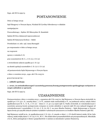 Sygn. akt III Ca 939/13 POSTANOWIENIE Dnia 12 lutego 2014r. Sąd Okręgowy w Nowym Sączu, Wydział III Cywilny Odwoławczy w składzie następującym: Przewodniczący - Sędzia: SO Mieczysław H. Kamiński Sędzia SO Ewa Adamczyk (sprawozdawca) Sędzia SO Katarzyna Kwilosz – Babiś Protokolant: st. sekr. sąd. Anna Burnagiel po rozpoznaniu w dniu 12 lutego 2014r. na rozprawie sprawy z wniosku G. K. przy uczestnictwie M. C., J. D. (1), J. D. (2) o stwierdzenie nabycia spadku po J. D. (3) na skutek apelacji uczestników J. D. (1) i J. D. (2) od postanowienia Sądu Rejonowego w Nowym Sączu z dnia 11 września 2013r., sygn. akt I Ns 1105/10 postanawia: 1. oddalić apelację; 2. orzec, że wnioskodawczyni i uczestnicy ponoszą koszty postępowania apelacyjnego związane ze swym udziałem w sprawie. Sygn. akt III Ca 939/13 UZASADNIENIE Postanowieniem z dnia 11 września 2013 r., sygnatura akt I Ns 1105/10, Sąd Rejonowy w Nowym Sączu stwierdził, że spadek po J. D. (3) c. S., zmarłej dnia (...) w N., ostatnio stale zamieszkałej w P., na podstawie ustawy nabyły dzieci spadkodawczyni M. C., G. K., J. D. (2) – dzieci J. i J. po 1/3 części (pkt I). Nadto stwierdził, że wnioskodawczyni i uczestnicy ponoszą koszty postępowania związane ze swoim udziałem w sprawie (pkt II) oraz nakazał ściągnąć od wnioskodawczyni i uczestników J. D. (2), J. D. (1), M. C. na rzecz Skarbu Państwa – Sądu Rejonowego w Nowym Sączu kwoty po 929,88) złotych tytułem wydatków wyłożonych tymczasowo ze środków Skarbu Państwa (pkt III). Sąd Rejonowy ustalił m.in., że spadkodawczyni J. D. (3) c. S. zmarła w dniu (...). W chwili śmierci miała 78 lat, była wdową, miała trójkę dzieci: J. D. (2), G. K., M. C.. Nie miała dzieci pozamałżeńskich ani przysposobionych. Mieszkała z K. K., który pomagał jej w domu i gospodarstwie w zamian za mieszkanie i pomoc finansową. Spadkodawczyni leczyła się w poradni lekarza (...) oraz poradni chirurgicznej i kardiologicznej, w przeszłości przeszła operacje ginekologiczną. W okresie od dnia 11 grudnia 2009r. do 22 grudnia 2009r. przebywała w Szpitalu (...) w N.. Przyjęto ją z powodu narastającego od dwóch miesięcy wodobrzusza oraz obrzęków podudzi. Początkowy stan chorej określany jako średni później oceniono jako dość dobry i stabilny. Po włączeniu leczenia uzyskano poprawę stanu chorej. Wypisana została z zaleceniem dalszej diagnostyki. Ostatecznie rozpoznano u niej – marskość wątroby niewyrównaną, wodobrzusze, infekcję dróg moczowych, nadciśnienie tętnicze, cukrzycę. Ponownie spadkodawczyni przebywała w szpitalu w N. w okresie od 28 grudnia 2009r. do chwili zgonu w dniu (...). Przyjęta została o godz. 23.09. Jej stan oceniono wówczas jako średni bez istotnych odchyleń. W kolejnych dniach stan ten utrzymywał się na podobnym poziomie. Prowadzono obserwację i diagnostykę. Utrzymywały się objawy niewydolności wątroby. Prowadzono typowe leczenie objawowe. W pewnym momencie po 6 stycznia 2010r. doszło do pogorszenia stanu zdrowia – stan ciężki. Porozumienie się z nią było utrudnione a (...) nastąpił zgon. Ostatecznie rozpoznano – marskość wątroby, przewleką niewydolność wątroby, śpiączkę wątrobową. Przed dniem, w którym nastąpiło nagłe pogorszenie się stanu zdrowia spadkodawczyni była ona osobą w pełni świadomą, bez żadnych zaburzeń psychicznych, utrzymującą kontakty z rodziną, energiczną i niepodatną na czyjeś naciski, potrafiła też pisać, mogła trzymać przedmioty. Od dawna jednak narzekała na zdrowie w szczególności na kłopoty z chodzeniem. Niemniej do chwili załamania stanu zdrowia podczas drugiego pobytu w szpitalu, spadkodawczyni chodziła samodzielnie, była w miarę jak na swój wiek i choroby, sprawna fizycznie, poruszała się po domu ale tylko na krótkie odległości i w obejściu, nie wychodziła jednak dalej. W szpitalu jeszcze 31 grudnia 2009r. i później co najmniej do 6 stycznia 2010r. był ze spadkodawczynią normalny i rzeczowy kontakt słowny. Przebywając wtedy w szpitalu poruszała się, pokonując odległość do łazienki, mogła utrzymywać w ręce przedmioty. Prowadziła rozmowy telefoniczne, w dniu 27 grudnia 2009r. kilka razy rozmawiała z wnioskodawczynią. Z pewnością w ostatnim okresie była słabsza i często leżała. W czasie dwóch pobytów w szpitalu w grudniu 2009r. doprowadzono do poprawy stanu zdrowia pacjentki a do kliku dni przed śmiercią nie obserwowano objawów wskazujących na możliwość nagłego załamania się stanu zdrowia a tym samym szybkiej śmierci. Z punktu widzenia medycznego nie istniało u spadkodawczyni w dniu 27 grudnia 2009r. realne niebezpieczeństwo nagłej śmierci, mogącej nastąpić w krótkim okresie czasu. Jakkolwiek cierpiała na wielonarządowe zmiany chorobowe to jednak jej stan zdrowia był do stycznia 2010r. ustabilizowany. Po powrocie z pierwszego pobytu w szpitalu w okresie od 11 do 22 grudnia 2009r. spadkodawczyni czuła się podobnie jak w niedługim okresie wcześniej i później. Na pewno narzekała na zdrowie, dolegliwości związane z układem pokarmowym, wątrobą, kłopoty z chodzeniem, musiała być słaba i częściej musiała leżeć. Jak poprzednio nie wychodziła sama poza obręb domostwa ale poza tym poruszała się w domu, a nawet z pomocą K. K.została zawieziona do jego rodziny. Jak schorowana osoba w tym wieku wymagała pomocy. W dniu 27 grudnia 2009r., w którym spadkodawczyni nie czuła się gorzej niż poprzednio, został sporządzony w jej domu testament ustny. Świadkami testamentu byli znajomi uczestnika – J. D. (2)– W. R., A. M.i K. M.. Spadkodawczyni w obecności świadków oraz uczestnika J. D. (2) stwierdziła, że do całego swojego majątku powołuje swojego wnuka J. D. (1), na którego nałożyła polecenie zapewnienia mieszkania K. K. oraz zapisy wypłaty córkom G. K. i M. C. kwot po 100 000 zł. W dniu 30 maja 2010r. doszło do sp
