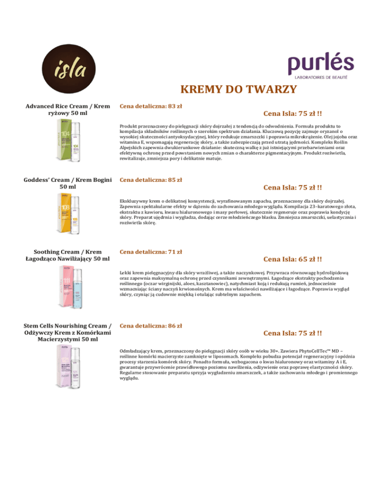 AdvancedRiceCream/Krem ryżowy50ml KREMYDOTWARZY Cenadetaliczna:83zł CenaIsla:75zł!! Produktprzeznaczonydopielęgnacjiskórydojrzałejztendencjądoodwodnienia.Formułaproduktuto kompilacjaskładnikówroślinnychoszerokimspektrumdziałania.Kluczowąpozycjęzajmujeoryzanolo wysokiejskutecznościantyoksydacyjnej,któryredukujezmarszczkiipoprawiamikrokrążenie.Olejjojobaoraz witaminaE,wspomagająregeneracjęskóry,atakżezabezpieczająprzedutratąjędrności.KompleksRoślin Alpejskichzapewniadwukierunkowedziałanie:skutecznąwalkęzjużistniejącymiprzebarwieniamioraz efektywnąochronęprzedpowstaniemnowychzmianocharakterzepigmentacyjnym.Produktrozświetla, rewitalizuje,zmniejszaporyidelikatniematuje. Goddess’Cream/KremBogini 50ml Cenadetaliczna:85zł CenaIsla:75zł!! Ekskluzywnykremodelikatnejkonsystencji,wyrafinowanymzapachu,przeznaczonydlaskórydojrzałej. Zapewniaspektakularneefektywdążeniudozachowaniamłodegowyglądu.Kompilacja23–karatowegozłota, ekstraktuzkawioru,kwasuhialuronowegoimasyperłowej,skutecznieregenerujeorazpoprawiakondycję skóry.Preparatujędrniaiwygładza,dodająccerzemłodzieńczegoblasku.Zmniejszazmarszczki,uelastyczniai rozświetlaskórę. SoothingCream/Krem ŁagodzącoNawilżający50ml Cenadetaliczna:71zł CenaIsla:65zł!! Lekkikrempielęgnacyjnydlaskórywrażliwej,atakżenaczynkowej.Przywracarównowagęhydrolipidową orazzapewniamaksymalnąochronęprzedczynnikamizewnętrznymi.Łagodząceekstraktypochodzenia roślinnego(oczarwirginijski,aloes,kasztanowiec),natychmiastkojąiredukująrumień,jednocześnie wzmacniającścianynaczyńkrwionośnych.Kremmawłaściwościnawilżająceiłagodzące.Poprawiawygląd skóry,czyniącjącudowniemiękkąiotulającsubtelnymzapachem. StemCellsNourishingCream/ OdżywczyKremzKomórkami Macierzystymi50ml Cenadetaliczna:86zł CenaIsla:75zł!! Odmładzającykrem,przeznaczonydopielęgnacjiskóryosóbwwieku30+.ZawieraPhytoCellTec™MD– roślinnekomórkimacierzystezamkniętewliposomach.Komplekspobudzapotencjałregeneracyjnyiopóźnia procesystarzeniakomórekskóry.Ponadtoformuła,wzbogaconaokwashialuronowyorazwitaminyAiE, gwarantujeprzywrócenieprawidłowegopoziomunawilżenia,odżywienieorazpoprawęelastycznościskóry. Regularnestosowaniepreparatusprzyjawygładzeniuzmarszczek,atakżezachowaniumłodegoipromiennego wyglądu.