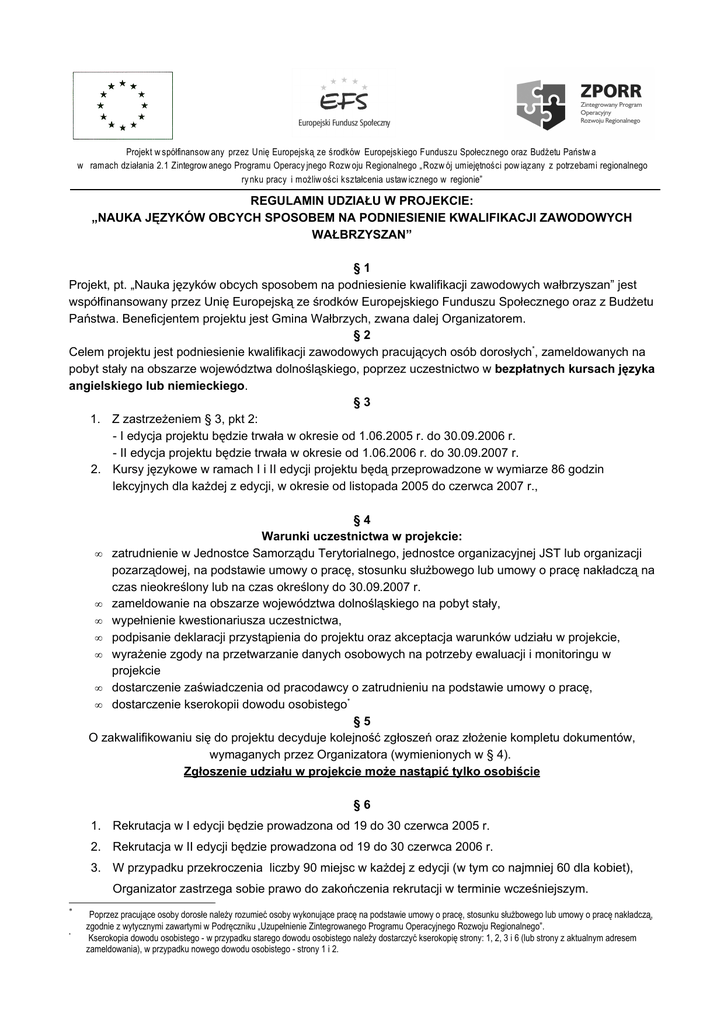 Projekt w spółfinansow any przez Unię Europejską ze środków Europejskiego Funduszu Społecznego oraz Budżetu Państw a w ramach działania 2.1 Zintegrow anego Programu Operacy jnego Rozw oju Regionalnego „ Rozw ój umiejętności pow iązany z potrzebami regionalnego ry nku pracy i możliw ości kształcenia ustaw icznego w regionie” REGULAMIN UDZIAŁU W PROJEKCIE: „NAUKA JĘZYKÓW OBCYCH SPOSOBEM NA PODNIESIENIE KWALIFIKACJI ZAWODOWYCH WAŁBRZYSZAN” §1 Projekt, pt. „Nauka języków obcych sposobem na podniesienie kwalifikacji zawodowych wałbrzyszan” jest współfinansowany przez Unię Europejską ze środków Europejskiego Funduszu Społecznego oraz z Budżetu Państwa. Beneficjentem projektu jest Gmina Wałbrzych, zwana dalej Organizatorem. §2 Celem projektu jest podniesienie kwalifikacji zawodowych pracujących osób dorosłych*, zameldowanych na pobyt stały na obszarze województwa dolnośląskiego, poprzez uczestnictwo w bezpłatnych kursach języka angielskiego lub niemieckiego. §3 1. Z zastrzeżeniem § 3, pkt 2: - I edycja projektu będzie trwała w okresie od 1.06.2005 r. do 30.09.2006 r. - II edycja projektu będzie trwała w okresie od 1.06.2006 r. do 30.09.2007 r. 2. Kursy językowe w ramach I i II edycji projektu będą przeprowadzone w wymiarze 86 godzin lekcyjnych dla każdej z edycji, w okresie od listopada 2005 do czerwca 2007 r., §4 Warunki uczestnictwa w projekcie: • zatrudnienie w Jednostce Samorządu Terytorialnego, jednostce organizacyjnej JST lub organizacji pozarządowej, na podstawie umowy o pracę, stosunku służbowego lub umowy o pracę nakładczą na czas nieokreślony lub na czas określony do 30.09.2007 r. • zameldowanie na obszarze województwa dolnośląskiego na pobyt stały, • wypełnienie kwestionariusza uczestnictwa, • podpisanie deklaracji przystąpienia do projektu oraz akceptacja warunków udziału w projekcie, • wyrażenie zgody na przetwarzanie danych osobowych na potrzeby ewaluacji i monitoringu w projekcie • dostarczenie zaświadczenia od pracodawcy o zatrudnieniu na podstawie umowy o pracę, • dostarczenie kserokopii dowodu osobistego* §5 O zakwalifikowaniu się do projektu decyduje kolejność zgłoszeń oraz złożenie kompletu dokumentów, wymaganych przez Organizatora (wymienionych w § 4). Zgłoszenie udziału w projekcie może nastąpić tylko osobiście §6 1. Rekrutacja w I edycji będzie prowadzona od 19 do 30 czerwca 2005 r. 2. Rekrutacja w II edycji będzie prowadzona od 19 do 30 czerwca 2006 r. 3. W przypadku przekroczenia liczby 90 miejsc w każdej z edycji (w tym co najmniej 60 dla kobiet), Organizator zastrzega sobie prawo do zakończenia rekrutacji w terminie wcześniejszym. * * Poprzez pracujące osoby dorosłe należy rozumieć osoby wykonujące pracę na podstawie umowy o pracę, stosunku służbowego lub umowy o pracę nakładczą, zgodnie z wytycznymi zawartymi w Podręczniku „Uzupełnienie Zintegrowanego Programu Operacyjnego Rozwoju Regionalnego”. Kserokopia dowodu osobistego - w przypadku starego dowodu osobistego należy dostarczyć kserokopię strony: 1, 2, 3 i 6 (lub strony z aktualnym adresem zameldowania), w przypadku nowego dowodu osobistego - strony 1 i 2. Projekt w spółfinansow any przez Unię Europejską ze środków Europejskiego Funduszu Społecznego oraz Budżetu Państw a w ramach działania 2.1 Zintegrow anego Programu Operacy jnego Rozw oju Regionalnego „ Rozw ój umiejętności pow iązany z potrzebami regionalnego ry nku pracy i możliw ości kształcenia ustaw icznego w regionie” §7 Osoby, które złożyły kompletne i poprawnie wypełnione dokumenty, a nie zostały zakwalifikowane do udziału w projekcie, z powodu przekroczenia liczby 90 miejsc zostaną wpisane na tzw. „listę rezerwową”. Zainteresowani będą mogli uczestniczyć w projekcie w przypadku rezygnacji z udziału osoby zakwalifikowanej do udziału w kursie oraz w miarę dostępnych wolnych miejsc w poszczególnych grupach. §8 Grupa szkoleniowa liczy maksymalnie 15 osób, ale nie mniej niż 6 osób. Kursy językowe są prowadzone na 3 poziomach zaawansowania: podstawowym, średnio-zaawansowanym oraz zaawansowanym. O poziomie zaawansowania zadecyduje przeprowadzony przez Szkołę Języków Obcych test kwalifikacyjny. § 10 W przypadku zmniejszenia liczby osób w grupie do mniej niż 6, Organizator w porozumieniu ze Szkołą Języków Obcych ma prawo zwiększyć liczbę osób w grupie poprzez połączenie z inną grupą na tym samym poziomie. § 11 Uczestnikom projektu nie przysługuje zwrot kosztów dojazdu na zajęcia. § 12 Prawa i obowiązki uczestników projektu: • uczestnik projektu ma obowiązek uczestniczenia w zajęciach poza godzinami pracy, w terminach ustalonych przez Organizatora i Szkołę Języków Obcych, na podstawie analizy zgłoszeń uczestników oraz w miarę możliwości organizacyjnych Szkoły Języków Obcych, • uczestnik projektu ma prawo oceniać pracę lektorów w formie regularnie przeprowadzonych ankiet, • uczestnik projektu ma obowiązek przystąpienia do testów sprawdzających jego postęp oraz do egzaminu końcowego. § 13 Uczestnik, który nie uczęszcza na zajęcia dłużej niż 2 zajęcia lekcyjne zostaje skreślony z listy Uczestników projektu, o ile w między czasie nie przedstawi pisma usprawiedliwiającego nieobecność. § 14 Usprawiedliwiona nieobecność Uczestnika projektu nie może być przyczyną jego skreślenia z listy Uczestników projektu. § 15 W przypadku nieuzasadnionej rezygnacji z uczestnictwa w projekcie, Uczestnik projektu zobowiązany jest do pokrycia kosztów kursu językowego w wysokości 1.300,00 złotych (słownie: tysiąc trzysta złotych). § 16 Organizator zastrzega sobie prawo do zmian w Regulaminie.