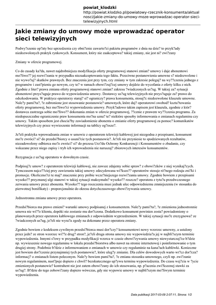 powiat_klodzki http://powiat.klodzko.pl/powiatowy-rzecznik-konsumenta/aktual nosci/jakie-zmiany-do-umowy-moze-wprowadzac-operator-siecitelewizyjnych.html Jakie zmiany do umowy może wprowadzać operator sieci telewizyjnych Podwy?szenie op?aty bez uprzedzenia czy obni?enie zawarto?ci pakietu programów z dnia na dzie? to przyk?ady niedozwolonych praktyk rynkowych. Konsument, który nie zaakceptowa? takiej zmiany, nie jest ni? zwi?zany Zmiany w ofercie programowej. Co do zasady ka?da, nawet najdrobniejsza modyfikacja oferty programowej stanowi zmian? umowy i daje abonentowi mo?liwo?? jej rozwi?zania w przypadku niezaakceptowania tego faktu. Przeciwne postanowienia umowne s? niedozwolone i nie wywo?uj? skutków prawnych. Bez znaczenia jest przy tym, czy zmiany w tym zakresie polegaj? na wy??czeniu jednego z programów i zast?pieniu go nowym, czy te? w ramach obowi?zuj?cej umowy dojdzie do wycofania z oferty kilku z nich. Zgodnie z liter? prawa zmiana oferty programowej stanowi zmian? zakresu ?wiadczonych us?ug. W takiej za? sytuacji abonentowi przys?uguje prawo do wypowiedzenia umowy. Dostawcy us?ug telewizyjnych nie przys?uguje za? prawo do odszkodowania. W praktyce operatorzy staraj? si? ograniczy? prawa konsumenta, stosuj?c niedozwolone klauzule umowne. Nale?y pami?ta?, ?e zabronione jest stosowanie postanowie? umownych, które daj? operatorowi swobod? kszta?towania oferty programowej, bez mo?liwo?ci wypowiedzenia umowy. Przyk?adowo takim zapisem jest klauzula, zgodnie z któr? dostawca zastrzega sobie mo?liwo?? dokonania zmian w ofercie programowej, ??cznie z prawem wy??czenia programu. Za niedopuszczalne ograniczenie praw konsumenta mo?na uzna? te? niektóre sposoby informowania o zmianach regulaminu czy umowy. Takim sposobem jest chocia?by zawiadomienie abonenta o zmianie oferty programowej za pomoc? komunikatów telewizyjnych czy przez wywieszenie informacji na tablicy og?osze?. Je?eli praktyka wprowadzania zmian w umowie z operatorem telewizji kablowej jest niezgodna z przepisami, konsument mo?e zwróci? si? do przedsi?biorcy o usuni?cie tych postanowie?. Je?eli nie przyniesie to spodziewanych rezultatów, niezadowolony odbiorca mo?e zwróci? si? do prezesa Urz?du Ochrony Konkurencji i Konsumentów o zbadanie, czy wskazane przez niego zapisy i tryb ich wprowadzenia nie naruszaj? zbiorowych interesów konsumentów. Rezygnacja z us?ug operatora w dowolnym czasie. Podpisuj?c umow? z operatorem telewizji kablowej, nie zawsze zdajemy sobie spraw? z obowi?zków z niej wynikaj?cych. Tymczasem najcz??ciej przy zawieraniu takiej umowy zdecydowana wi?kszo?? operatorów stosuje ró?nego rodzaju zni?ki i promocje. Okoliczno?ci te maj? znaczenie przy próbie wcze?niejszego rozwi?zania umowy. Zgodnie bowiem z przepisami wysoko?? przyznanej ulgi stanowi w takiej sytuacji maksymaln? wysoko?? roszcze? operatora z tytu?u przedwczesnego zerwania umowy przez abonenta. Wysoko?? tego roszczenia musi jednak ulec odpowiedniemu zmniejszeniu (w stosunku do pierwotnej bonifikaty) - proporcjonalnie do okresu dotychczasowego obowi?zywania umowy. Jednostronna zmiana umowy przez operatora. Przedsi?biorca ma prawo zmieni? warunki umowy podpisanej z konsumentem. Nale?y pami?ta?, ?e zmieniona jednostronnie umowa nie wi??e klienta, dopóki nie zostanie mu dor?czona. Dodatkowo konsument powinien zosta? powiadomiony o planowanych przez operatora kablowego zmianach z odpowiednim wyprzedzeniem. W takiej sytuacji mo?e zrezygnowa? ze ?wiadczonych us?ug, je?eli nie wyra?a zgody na dokonane przez operatora zmiany. Zgodnie bowiem z kodeksem cywilnym przedsi?biorca musi dor?czy? konsumentowi nowy wzorzec umowny, a ustalony przez jedn? ze stron wzorzec wi??e drug? stron?, je?eli druga strona umowy nie wypowiedzia?a jej w najbli?szym terminie wypowiedzenia. Innymi s?owy w przypadku modyfikacji wzorca w czasie obowi?zywania umowy niewystarczaj?ce b?dzie np. wywieszenie nowego regulaminu w lokalu przedsi?biorstwa albo nawet na stronie internetowej i poinformowanie o tym drugiej strony. Podobnie b?dzie z informowaniem o zmianach w umowie czy regulaminie na kana?ach kablówki. Konieczne jest bowiem dor?czenie przynajmniej tych postanowie?, które uleg?y zmianie. Dla celów dowodowych warto wr?cz dor?cza? informacj? o zmianach listem poleconym. Nale?y bowiem pami?ta?, ?e zmiana stosunku umownego, czyli np. zwi?zanie nowym regulaminem, nast?puje dopiero z chwil? bezskutecznego up?ywu terminu wypowiedzenia. Do czasu wej?cia w ?ycie zmienionych postanowie? kontrahent nie jest zatem obowi?zany do ich stosowania, np. p?acenia zwi?kszonej stawki za us?ug?. B?dzie do tego zobowi?zany dopiero wówczas, gdy nie wypowie umowy w najbli?szym mo?liwym terminie wypowiedzenia. Data publikacji 2017-03-09 2:07:11, Strona: 1/2 powiat_klodzki http://powiat.klodzko.pl/powiatowy-rzecznik-konsumenta/aktual nosci/jakie-zmiany-do-umowy-moze-wprowadzac-operator-siecitelewizyjnych.html Data publikacji 2017-03-09 2:07:11, Strona: 2/2
