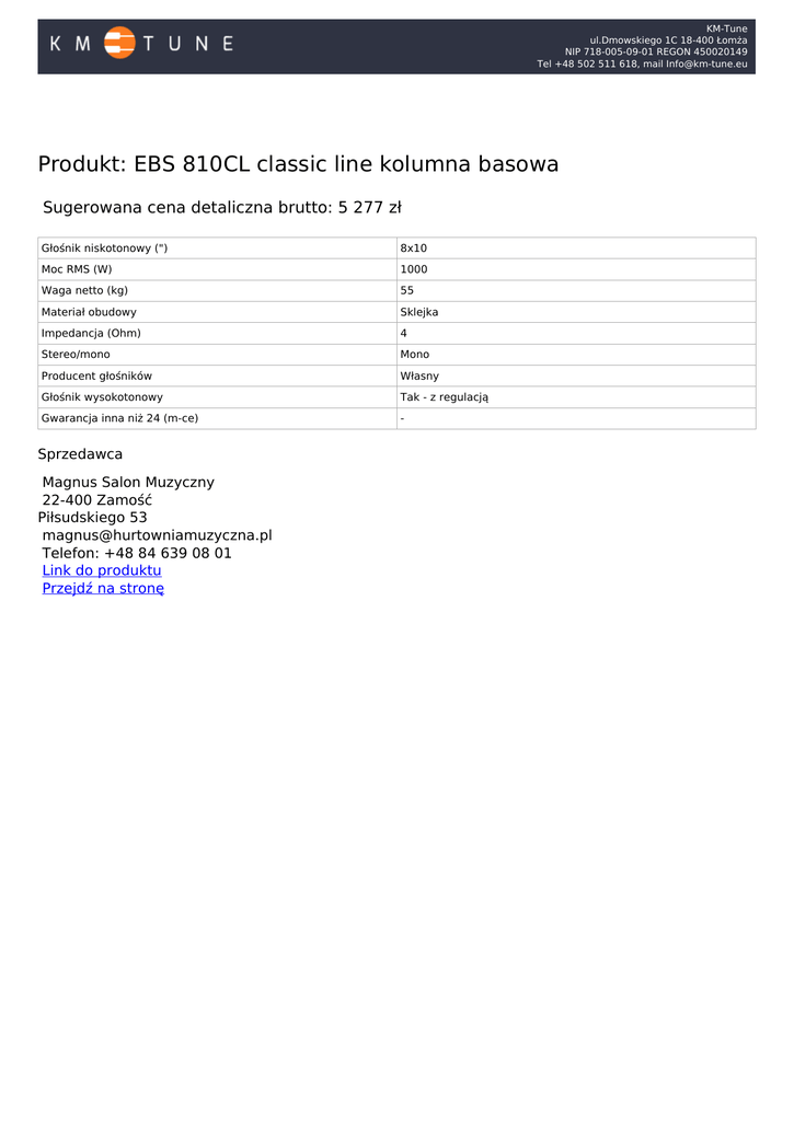 KM-Tune ul.Dmowskiego 1C 18-400 Łomża NIP 718-005-09-01 REGON 450020149 Tel +48 502 511 618, mail [email protected] Produkt: EBS 810CL classic line kolumna basowa Sugerowana cena detaliczna brutto: 5 277 zł Głośnik niskotonowy (") 8x10 Moc RMS (W) 1000 Waga netto (kg) 55 Materiał obudowy Sklejka Impedancja (Ohm) 4 Stereo/mono Mono Producent głośników Własny Głośnik wysokotonowy Tak - z regulacją Gwarancja inna niż 24 (m-ce) - o Sprzedawca Magnus Salon Muzyczny 22-400 Zamość Piłsudskiego 53 [email protected] Telefon: +48 84 639 08 01 Link do produktu Przejdź na stronę Powered by TCPDF (www.tcpdf.org)