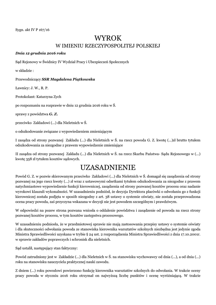 Sygn. akt IV P 167/16 WYROK W IMIENIU RZECZYPOSPOLITEJ POLSKIEJ Dnia 12 grudnia 2016 roku Sąd Rejonowy w Świdnicy IV Wydział Pracy i Ubezpieczeń Społecznych w składzie : Przewodniczący SSR Magdalena Piątkowska Ławnicy: J. W., R. P. Protokolant: Katarzyna Zych po rozpoznaniu na rozprawie w dniu 12 grudnia 2016 roku w Ś. sprawy z powództwa G. Z. przeciwko Zakładowi (...) dla Nieletnich w Ś. o odszkodowanie związane z wypowiedzeniem zmieniającym I zasądza od strony pozwanej Zakładu (...) dla Nieletnich w Ś. na rzecz powoda G. Z. kwotę (...)zł brutto tytułem odszkodowania za niezgodne z prawem wypowiedzenie zmieniające II zasądza od strony pozwanej Zakładu (...) dla Nieletnich w Ś. na rzecz Skarbu Państwa- Sądu Rejonowego w (...) kwotę 358 zł tytułem kosztów sądowych. UZASADNIENIE Powód G. Z. w pozwie skierowanym przeciwko Zakładowi (...) dla Nieletnich w Ś. domagał się zasądzenia od strony pozwanej na jego rzecz kwoty (...) zł wraz z ustawowymi odsetkami tytułem odszkodowania za niezgodne z prawem natychmiastowe wypowiedzenie funkcji kierowniczej, zasądzenia od strony pozwanej kosztów procesu oraz nadanie wyrokowi klauzuli wykonalności. W uzasadnieniu podniósł, że decyzja Dyrektora placówki o odwołaniu go z funkcji kierowniczej została podjęta w sposób niezgodny z art. 38 ustawy o systemie oświaty, nie została przeprowadzona ocena pracy powoda, zaś przyczyna wskazana w decyzji nie jest powodem szczególnym i prawdziwym. W odpowiedzi na pozew strona pozwana wniosła o oddalenie powództwa i zasądzenie od powoda na rzecz strony pozwanej kosztów procesu, w tym kosztów zastępstwa procesowego. W uzasadnieniu podniosła, że w przedmiotowej sprawie nie mają zastosowania przepisy ustawy o systemie oświaty i dla skuteczności odwołania powoda ze stanowiska kierownika warsztatów szkolnych niezbędna jest jedynie zgoda Ministra Sprawiedliwości uzyskana w trybie § 24 ust. 2 rozporządzenia Ministra Sprawiedliwości z dnia 17.10.2001r. w sprawie zakładów poprawczych i schronisk dla nieletnich. Sąd ustalił, następujący stan faktyczny: Powód zatrudniony jest w Zakładzie (...) dla Nieletnich w Ś. na stanowisku wychowawcy od dnia (...), a od dnia (...) roku na stanowisku nauczyciela praktycznej nauki zawodu. Z dniem (...) roku powodowi powierzono funkcję kierownika warsztatów szkolnych do odwołania. W trakcie oceny pracy powoda w styczniu 2016 roku otrzymał on najwyższą liczbę punktów i ocenę wyróżniającą. W trakcie zatrudnienia powód kilkakrotnie uzyskiwał od dyrektora placówki podziękowania za wysoki poziom profesjonalizmu, jak też za osobistą postawę. W okresie od (...) roku powód pełnił obowiązki dyrektora placówki. Dowód: - akta osobowe powoda – w załączeniu. Od dnia (...)roku obowiązki dyrektora Zakładu (...) dla Nieletnich w Ś. pełniła G. K., która w placówce zatrudniona była od (...) jako psycholog. Powód w okresie od (...) roku przebywał na zwolnieniu lekarskim. W dniu (...) przyjechał do placówki i poinformował G. K. o swoim stanie zdrowia i konieczności skierowania do szpitala. Pismem z dnia (...) roku Dyrektor placówki G. K. zwróciła się do Dyrektora Departamentu Spraw Rodzinnych i Nieletnich w Ministerstwie Sprawiedliwości w W. o wyrażenie zgody na dokonanie zmiany na stanowisku kierowniczym polegającej na powołaniu A. G. na stanowisko kierownika warsztatów szkolnych z dniem (...). W uzasadnieniu wskazała, że zmiany organizacyjne podyktowane są zmianą zależności służbowych w celu zapewnienia prawidłowej realizacji zadań statutowych placówki. Pismem z dnia (...)roku Dyrektor Departamentu Spraw Rodzinnych i Nieletnich w Ministerstwie Sprawiedliwości w W. wyraził zgodę na odwołanie z dniem (...) roku G. Z. ze stanowiska kierownika warsztatów szkolnych w Zakładzie (...) dla Nieletnich. Decyzja z dnia (...) roku Dyrektor Zakładu (...) dla Nieletnich w Ś. odwołał powoda ze stanowiska kierownika warsztatów szkolnych z dniem (...) roku. W uzasadnieniu jako przyczynę odwołania wskazano zmianę zależności służbowych mającą na celu zapewnienie prawidłowej realizacji zadań statutowych placówki. Dowód: - akta osobowe powoda – w załączeniu; - wniosek do Ministerstwa Sprawiedliwości z dnia(...) k. 47; - pismo Ministerstwa Sprawiedliwości z dnia (...) k. 48; - zeznania świadka A. G. – e protokół z dnia 30.11.2016r. k. 43; - zeznania powoda - e protokół z dnia 30.11.2016r. k. 43; - zeznania pozwanej - e protokół z dnia 30.11.2016r. k. 43. Powyższy stan faktyczny Sąd ustalił na podstawie zgromadzonego w sprawie materiału dowodowego, w szczególności w oparciu o zeznania powoda, zeznania świadka A. G. oraz zeznania pozwanej G. K., jak również dokumenty zgromadzone w aktach sprawy. Sąd dał wiarę powyższym dowodom w takim zakresie, w jakim każdy z nich stanowił podstawę dokonania ustaleń faktycznych w sprawie. Podstawę ustaleń Sądu w zakresie przebiegu zatrudnienia powoda stanowiły również akta osobowe pracownika. Sąd dał im wiarę w całości, albowiem ich prawdziwość i autentyczność nie budziła wątpliwości, jak również nie zostały one w tym zakresie zakwestionowane przez strony postępowania. Sąd zważył, co następuje : Powództwo zasługiwało na uwzględnienie. Zgodnie z art. 1 ust. 1 pkt 1 i 2 ustawy z dnia 26 stycznia 1982 roku Karta Nauczyciela ustawie podlegają nauczyciele, wychowawcy i inni pracownicy pedagogiczni zatrudnieni w: - publicznych przedszkolach, szkołach i placówkach oraz placówkach doskonalenia nauczycieli działających na podstawie ustawy z dnia 7 września 1991 r. o systemie oświaty (Dz. U. z 2015 r. poz. 2156 oraz z 2016 r. poz. 35, 64, 195, 668 i 1010), z zastrzeżeniem ust. 2 pkt 1a, 1b oraz pkt 2 lit. a; - zakładach poprawczych oraz schroniskach dla nieletnich działających na podstawie ustawy z dnia 26 października 1982 r. o postępowaniu w sprawach nieletnich (Dz. U. 