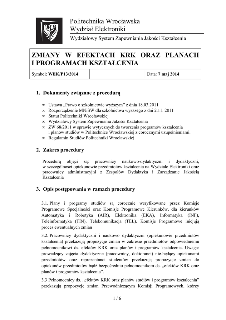 Politechnika Wrocławska Wydział Elektroniki Wydziałowy System Zapewniania Jakości Kształcenia ZMIANY W EFEKTACH KRK ORAZ PLANACH I PROGRAMACH KSZTAŁCENIA Symbol: WEK/P13/2014 Data: 7 maj 2014 1. Dokumenty związane z procedurą • • • • • Ustawa „Prawo o szkolnictwie wyższym” z dnia 18.03.2011 Rozporządzenie MNiSW dla szkolnictwa wyższego z dni 2.11. 2011 Statut Politechniki Wrocławskiej Wydziałowy System Zapewniania Jakości Kształcenia ZW 68/2011 w sprawie wytycznych do tworzenia programów kształcenia i planów studiów w Politechnice Wrocławskiej z corocznymi uzupełnieniami. • Regulamin Studiów Politechniki Wrocławskiej 2. Zakres procedury Procedurą objęci są: pracownicy naukowo-dydaktyczni i dydaktyczni, w szczególności opiekunowie przedmiotów kształcenia na Wydziale Elektroniki oraz pracownicy administracyjni z Zespołów Dydaktyka i Zarządzanie Jakością Kształcenia 3. Opis postępowania w ramach procedury 3.1. Plany i programy studiów są corocznie weryfikowane przez Komisje Programowe Specjalności oraz Komisje Programowe Kierunków, dla kierunków Automatyka i Robotyka (AIR), Elektronika (EKA), Informatyka (INF), Teleinformatyka (TIN), Telekomunikacja (TEL). Komisje Programowe inicjują proces ewentualnych zmian 3.2. Pracownicy dydaktyczni i naukowo dydaktyczni (opiekunowie przedmiotów kształcenia) przekazują propozycje zmian w zakresie przedmiotów odpowiedniemu pełnomocnikowi ds. efektów KRK oraz planów i programów kształcenia. Uwaga: prowadzący zajęcia dydaktyczne (pracownicy, doktoranci) nie-będący opiekunami przedmiotów oraz reprezentanci studentów przekazują propozycje zmian do opiekunów przedmiotów bądź bezpośrednio pełnomocnikom ds. „efektów KRK oraz planów i programów kształcenia”. 3.3 Pełnomocnicy ds. „efektów KRK oraz planów studiów i programów kształcenia” przekazują propozycje zmian Przewodniczącym Komisji Programowych, którzy 1/6 Politechnika Wrocławska Wydział Elektroniki Wydziałowy System Zapewniania Jakości Kształcenia inicjują posiedzenia Komisji, na których propozycje są opiniowane. Posiedzenie Komisji Programowej musi odbyć się co najmniej raz w roku (nie później niż przed posiedzeniem kwietniowym Rady Wydziału). 3.4 Wszelkie zgłoszone zmiany (na stosownych formularzach – Zał. 1) powinny zostać zaopiniowane przez odpowiednią Komisję Programową Specjalności w zakresie przedmiotów specjalnościowych, a następnie zaopiniowane przez odpowiednią Komisję Programową Kierunku w zakresie przedmiotów kierunkowych oraz specjalnościowych dla specjalności na danym kierunku.. 3.5 Przewodniczący Komisji Programowej Kierunku (opiekun kierunku) przekazuje poprzez zespół ds. dydaktyki projekt zmian do zaopiniowania przedstawicielom Samorządu Studenckiego na Wydziale. Reprezentanci studentów zobowiązani są do przekazania opinii kierownikowi ds. dydaktyki nie później niż 3 dni robocze przed posiedzeniem Komisji Dydaktycznej Wydziału rozpatrującej propozycje zmian. Nie udzielenie odpowiedzi w terminie jest równoznaczne z opinią pozytywną. 3.6 Wszystkie zmiany zaopiniowane pozytywnie przez Komisje Programowe Kierunków opiniowane są przez Komisję Dydaktyczną Wydziału. 3.7 Przed posiedzeniem Komisji Dydaktycznej Wydziału poszczególni pełnomocnicy ds. KRK oraz planów i programów studiów przekazują protokoły z posiedzeń Komisji (podpisane przez wszystkie osoby uczestniczące w posiedzeniu Komisji) oraz proponowane zmiany (na stosownym formularzu – Zał.nr 1) do kierownik Zespołu ds. dydaktyki w wersji papierowej i elektronicznej. 3.8 Przewodniczący Komisji Programowych Kierunków przedstawiają propozycje zmian na posiedzeniu Komisji Dydaktycznej Wydziału. Posiedzenia Komisji zwołuje Dziekan (Prodziekan) co najmniej raz w roku w kwietniu. 3.9 Propozycje zmian zaopiniowane pozytywnie przez Komisję Dydaktyczną Wydziału przekazywane są pod obrady Rady Wydziału, za przygotowanie pełnej dokumentacji w zakresie planów i programów kształcenia odpowiadają pełnomocnicy ds. „KRK oraz planów i programów kształcenia”. 3.10 Rada Wydziału rozpatruje propozycje zmian, przy czym: (a) Propozycje zmian w efektach kierunkowych i specjalnościowych KRK są opiniowane przez Radę Wydziału. (b) Pozostałe propozycje zmian (np. zmiany miejsca przedmiotu w planie studiów, formy i ich wymiar oraz punkty ECTS przyporządkowane przedmiotom, Karty Przedmiotów z efektami przedmiotowymi) są zatwierdzane przez radę Wydziału jako obowiązujące dla studentów rozpoczynających studia od najbliższego roku akademickiego. 2/6 Politechnika Wrocławska Wydział Elektroniki Wydziałowy System Zapewniania Jakości Kształcenia 3.11 W zakresie zmian 3.10 (a) - po ich pozytywnym zaopiniowaniu przez Radę Wydziału – kierownik Zespołu ds. Dydaktyki przygotowuje komplet dokumentów w wersji papierowej (dokumentacja ze zmianami, wyciągi z protokołów z obrad komisji programowej specjalności/ kierunku, komisji dydaktycznej, wyciąg protokołu z Rady Wydziału) wraz z pismem wiodącym do J. M. Rektora z prośbą o uruchomienie procedury zatwierdzenia zmian przez Senat Politechniki Wrocławskiej. Dziekan kieruje pismo do J. M. Rektora. 3.12 Po zatwierdzeniu zmian 3.10 (a) przez Senat Politechniki Wrocławskiej oraz po zatwierdzeniu zmian 3.10 (b) przez Radę Wydziału - kierownik Zespołu ds. Dydaktyki (w porozumieniu z pełnomocnikami ds. „KRK oraz planów i programów kształcenia”) nanosi zmiany w dokumentacji Wydziałowej dotyczącej Efektów KRK oraz Planów i Programów Kształcenia oraz przekazuje zaktualizowaną wersję elektroniczną do publikacji na stronie wydziałowej i ogólnouczelnianej. 3.13 W przypadkach nieuregulowanych w niniejszej procedurze decyzje podejmuje Dziekan. 4. Osoby odpowiedzialne • Przewodniczący Komisji Programowych Specjalności • Przewodniczący Komisji Programowych Kierunków • Pełnomocnicy ds. „KRK or